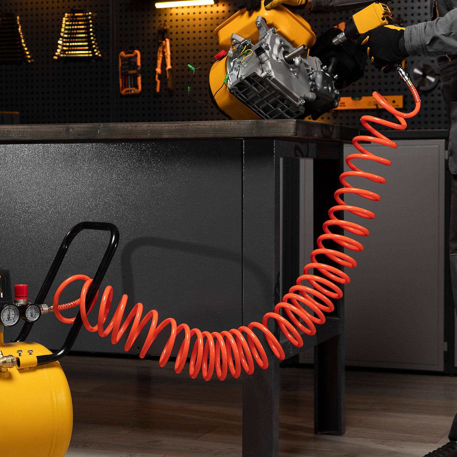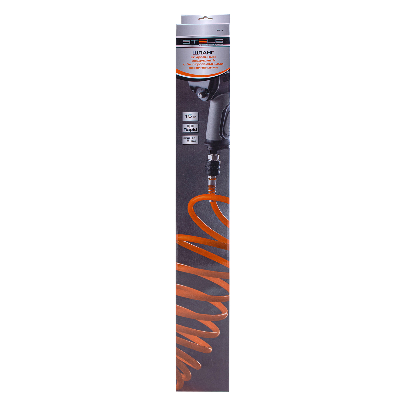 Спиральный воздушный шланг Stels 57019, 8 х 12 мм, длиной 15 м, с быстросъемными соединениями, выдерживает давление до 18 бар и предназначен для подключения пневматических инструментов к источнику сжатого воздуха. Полиэтилен, из которого изготовлен рукав, характеризуется легкостью и устойчивостью к воздействию агрессивных сред, поэтому шланг не боится контактов со строительными смесями, маслом, бензином, а работа с ним не вызывает усталости. Пригодится во время строительства, ремонтно-отделочных работ, а также будет полезен в мастерской или гараже.ПреимуществаСпиральная форма — шланг удобен в хранении, а во время работы не мешает передвижению.Длина 15 м — мастеру не обязательно располагаться рядом с компрессором.Быстросъемные соединения рапид — удобно для быстрого подключения рукава к компрессору и работы поочередно с несколькими пневмоинструментами.Антикоррозийное покрытие — штуцер и муфта устойчивы к ржавчине и служат долго.Увеличенная толщина — рукав выдерживает механические воздействия и перепады давления.