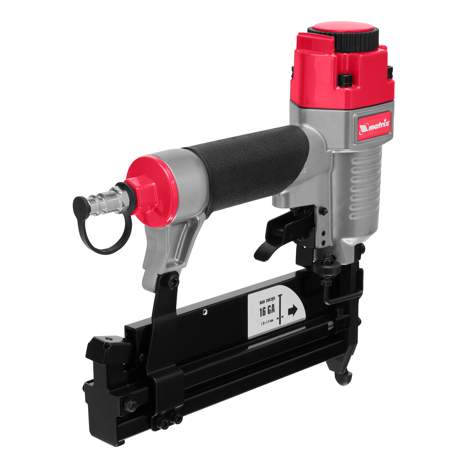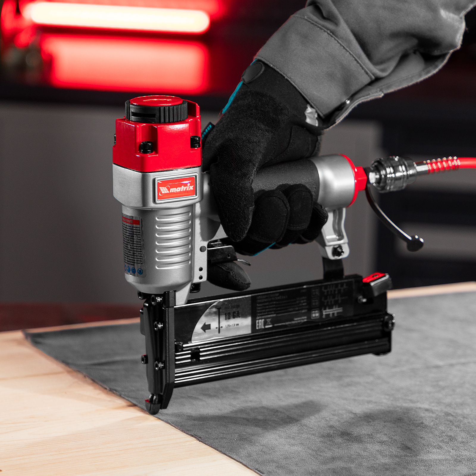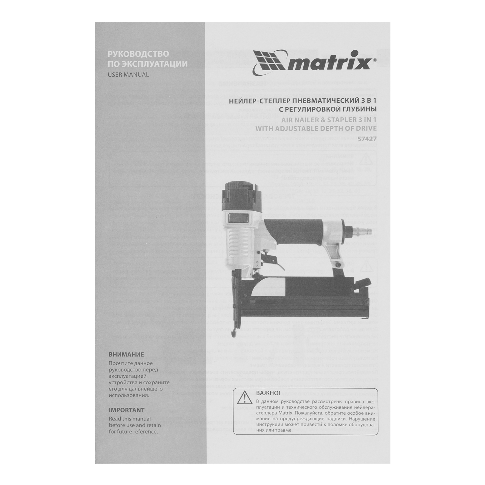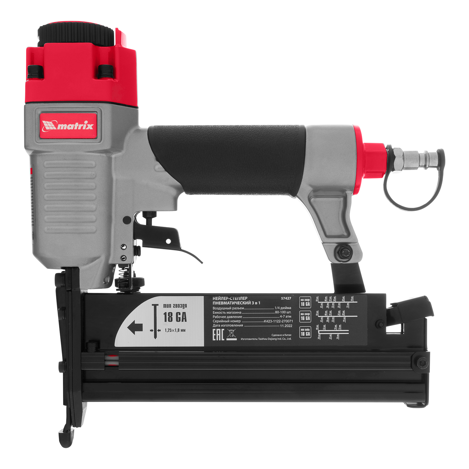 Пневматический нейлер-степлер 3 в 1 Matrix 57427 способен забивать на регулируемую глубину скобы 18 GA и гвозди 18GA и 16GA. Используется для фиксации паркетной доски, фанеры, ДВП, шифера, гипсокартона, ткани и бумаги. Пригодится во время ремонта, а также для сборки мебели и отделочных работ. Расход воздуха составляет 107 л/мин, поэтому нейлер-степлер можно подключать к любому типу компрессоров.Преимущества Выбор режима работы — винтовой регулятор позволяет установить оптимальную глубину забивания. Безопасность — предохранитель не допускает случайного выпускания крепежа. Индикатор заполнения магазина — можно отслеживать количество крепежей для своевременной зарядки инструмента. Прочность и долговечность — металлический корпус устойчив к механическим повреждениям. Вместительный магазин — в него помещается 80/100 гвоздей (в зависимости от типа) или 100 скоб. Комфортная работа — обрезиненная рукоятка удобно ложится в руку и не выскальзывает из ладони. Малый вес 1,33 кг — длительная работа со степлером-нейлером не вызывает дискомфорт. Удобное обслуживание — в набор входит масленка и 2 имбусовых ключа. Подтвержденное качество — гарантия на заводской брак действует 3 года.