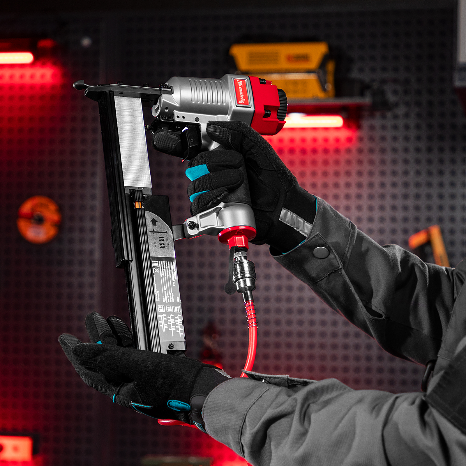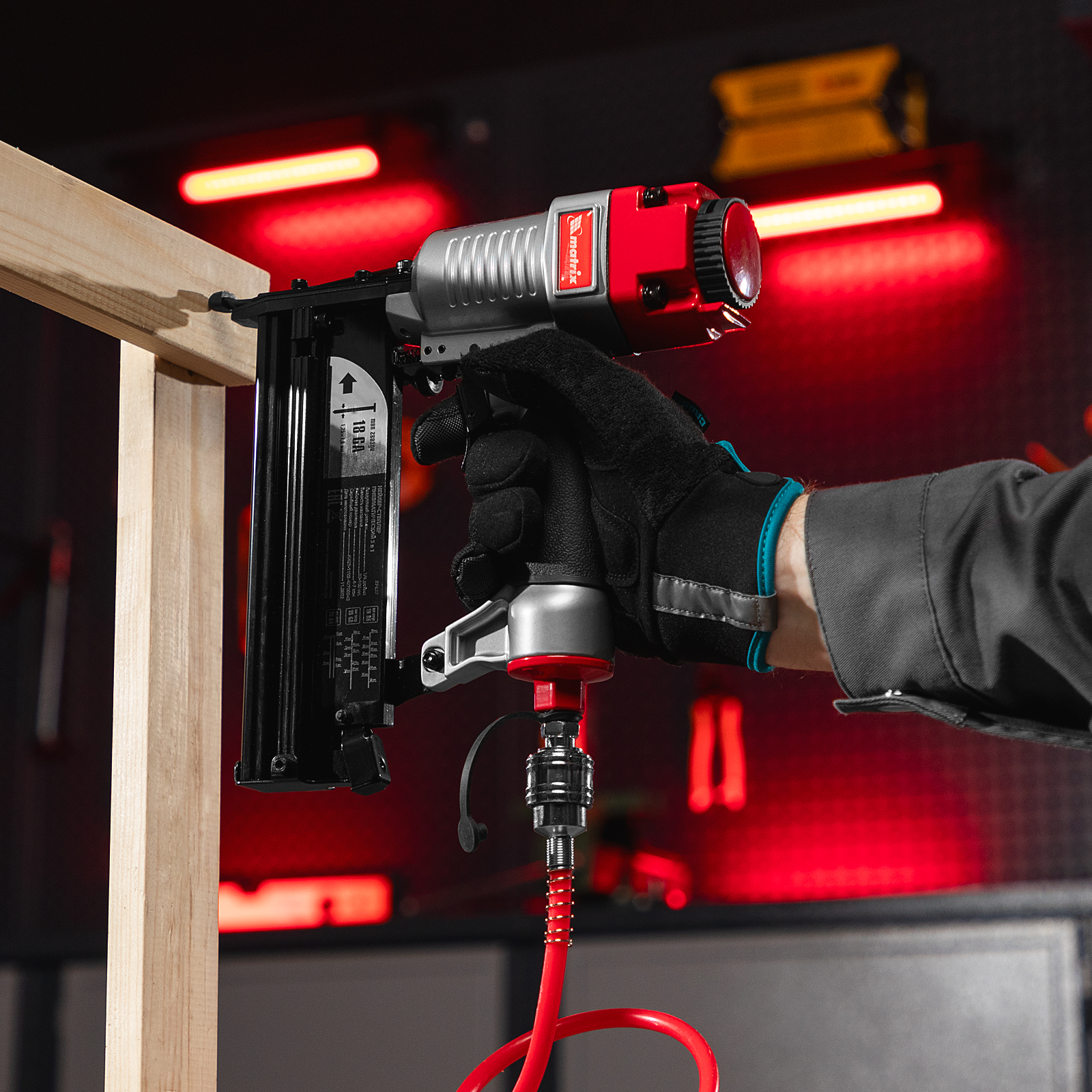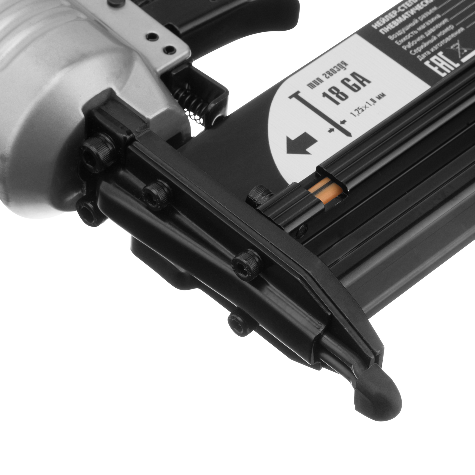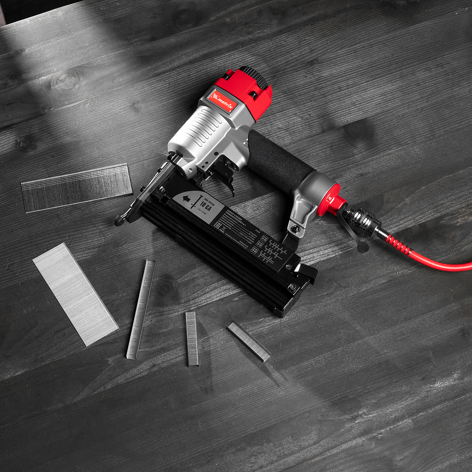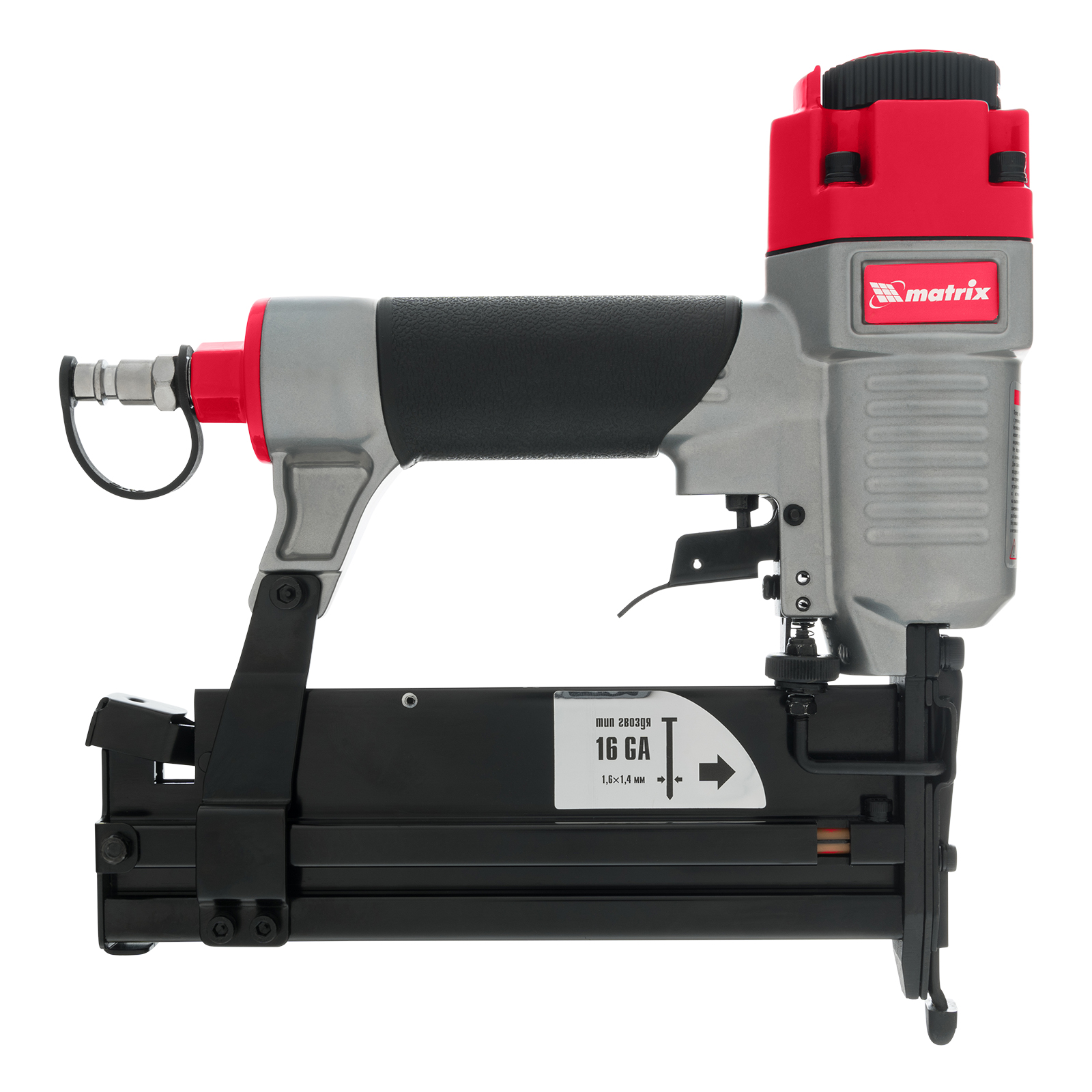 Пневматический нейлер-степлер 3 в 1 Matrix 57427 способен забивать на регулируемую глубину скобы 18 GA и гвозди 18GA и 16GA. Используется для фиксации паркетной доски, фанеры, ДВП, шифера, гипсокартона, ткани и бумаги. Пригодится во время ремонта, а также для сборки мебели и отделочных работ. Расход воздуха составляет 107 л/мин, поэтому нейлер-степлер можно подключать к любому типу компрессоров.Преимущества Выбор режима работы — винтовой регулятор позволяет установить оптимальную глубину забивания. Безопасность — предохранитель не допускает случайного выпускания крепежа. Индикатор заполнения магазина — можно отслеживать количество крепежей для своевременной зарядки инструмента. Прочность и долговечность — металлический корпус устойчив к механическим повреждениям. Вместительный магазин — в него помещается 80/100 гвоздей (в зависимости от типа) или 100 скоб. Комфортная работа — обрезиненная рукоятка удобно ложится в руку и не выскальзывает из ладони. Малый вес 1,33 кг — длительная работа со степлером-нейлером не вызывает дискомфорт. Удобное обслуживание — в набор входит масленка и 2 имбусовых ключа. Подтвержденное качество — гарантия на заводской брак действует 3 года.