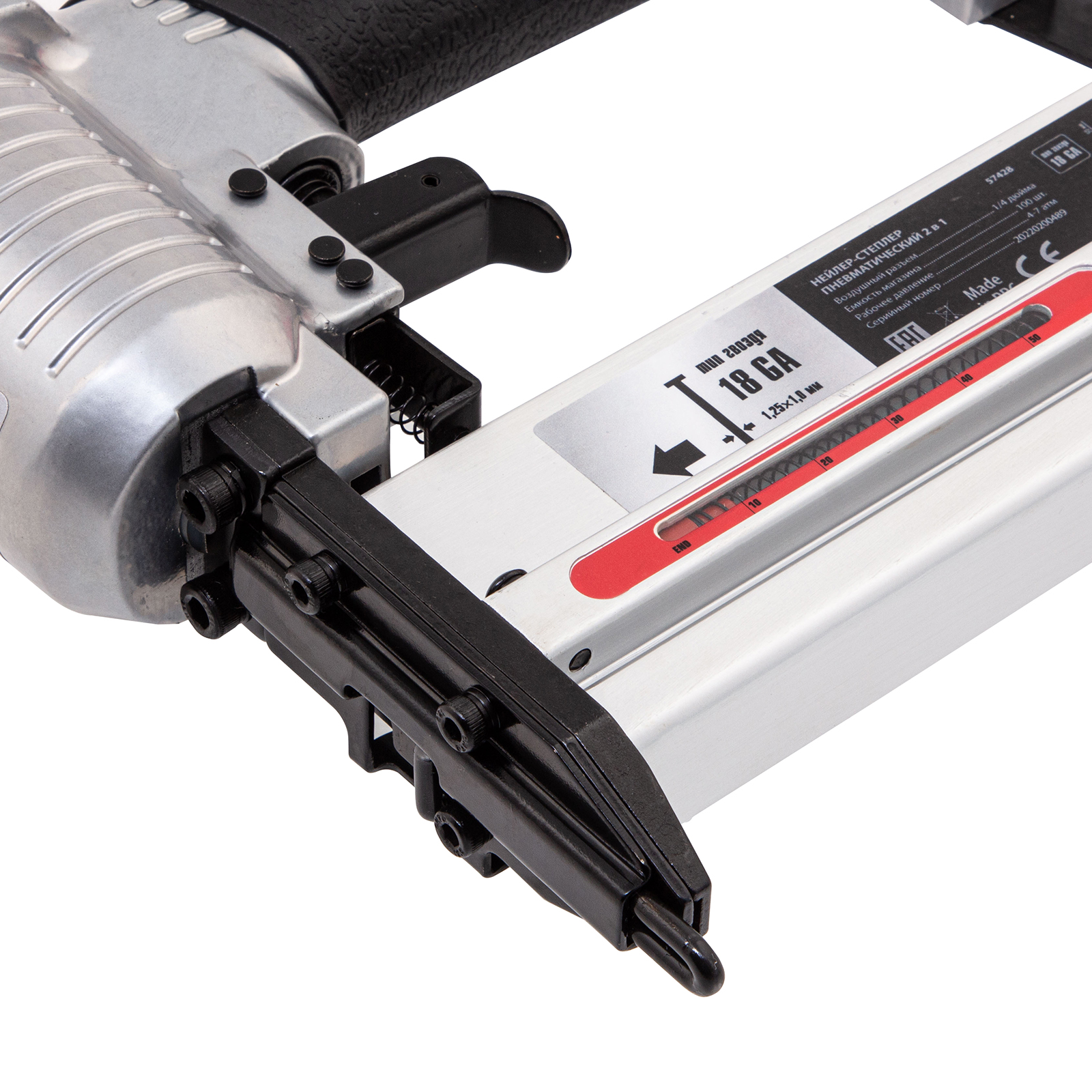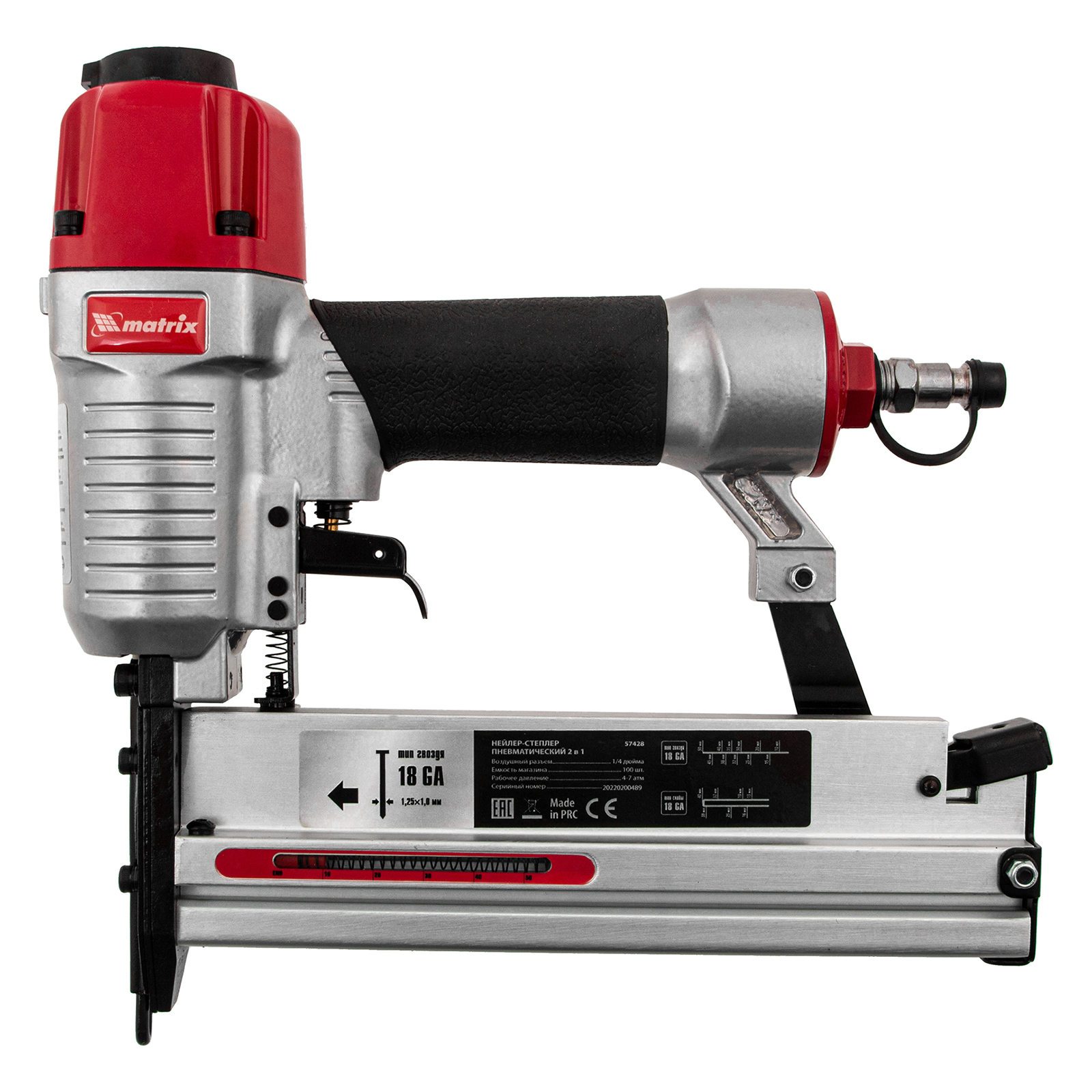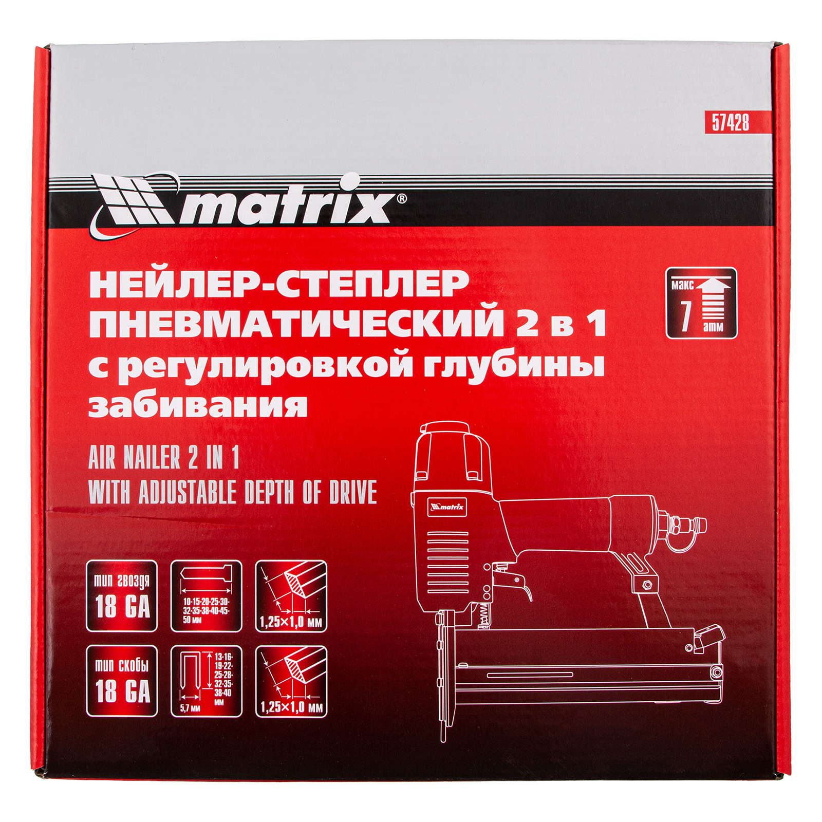 Пневматический нейлер-степлер Matrix 2 в 1 57428 с функцией регулировки глубины забивания предназначен для быстрого скрепления различных материалов гвоздями и скобами 18GA. Его используют для сборки мебели и деревянных каркасов, обшивки и утепления домов, монтажа окон, дверей, плинтусов или напольных покрытий. Нейлер-степлер подключается к любым типам компрессоров, т.к. расход воздуха составляет всего 0,7 л/мин.Преимущества Выбор режима работы — винтовой регулятор позволяет установить оптимальную глубину забивания. Безопасность — предохранитель не допускает случайного выпускания крепежа. Индикатор заполнения магазина — можно отслеживать количество крепежей для своевременной зарядки инструмента. Прочность и долговечность — металлический корпус устойчив к механическим повреждениям. Вместительный магазин — в него помещается 100 гвоздей или скоб, что позволяет реже производить заправку. Комфортная работа — обрезиненная рукоятка удобно ложится в руку и не выскальзывает из ладони Малый вес 1,33 кг — длительная работа со степлером-нейлером не вызывает дискомфорт. Удобное обслуживание — в набор входит масленка и 2 имбусовых ключа. Подтвержденное качество — гарантия на заводской брак действует 3 года.
