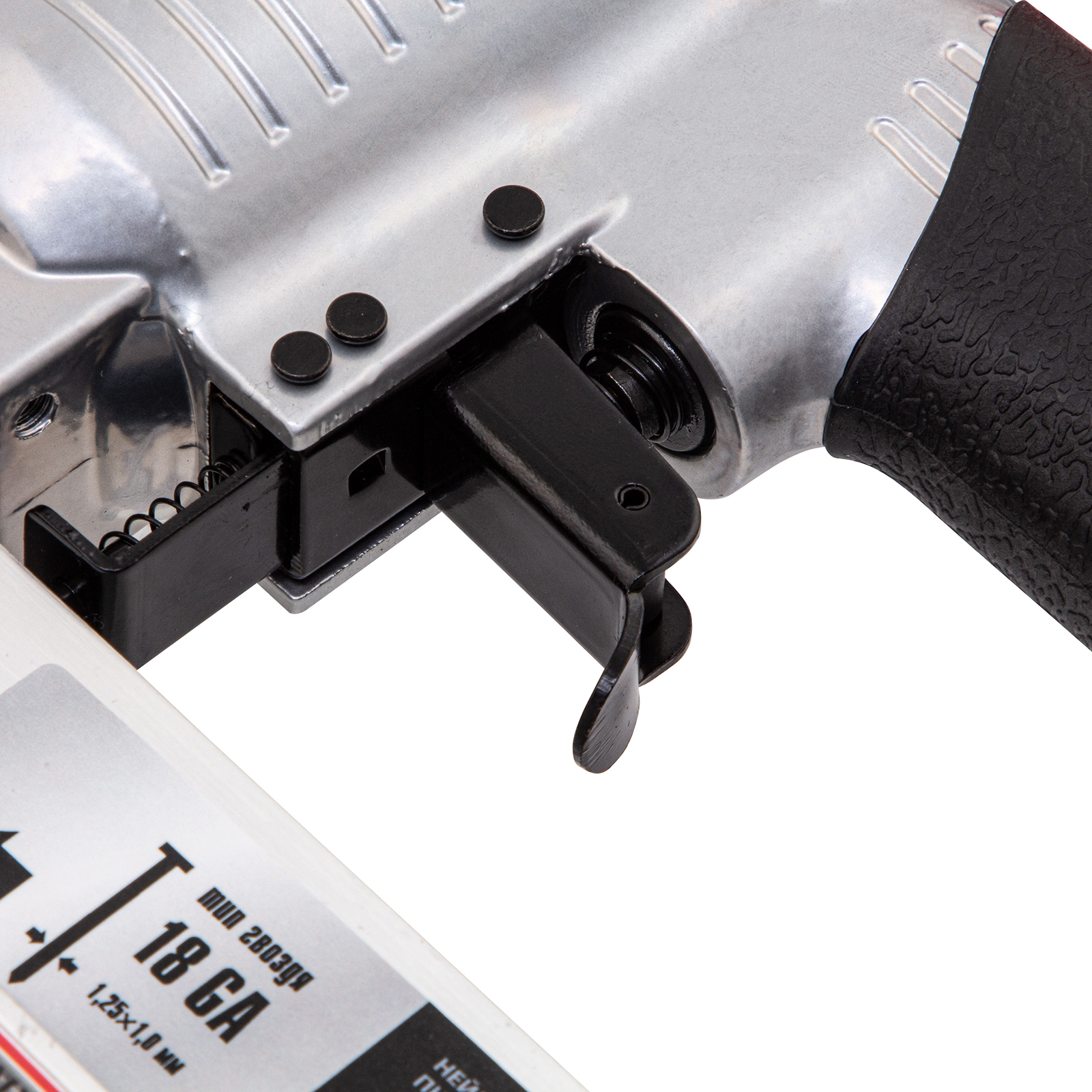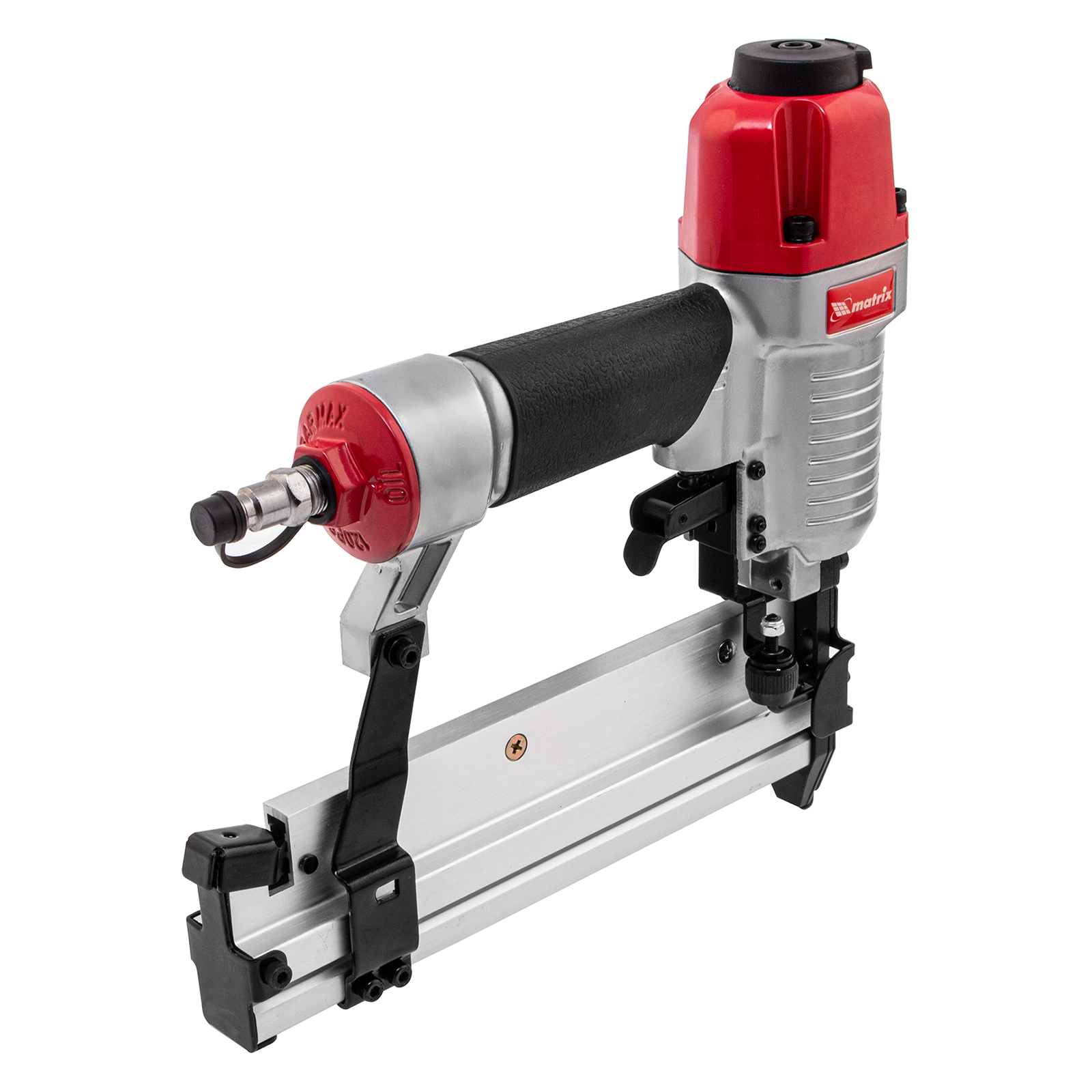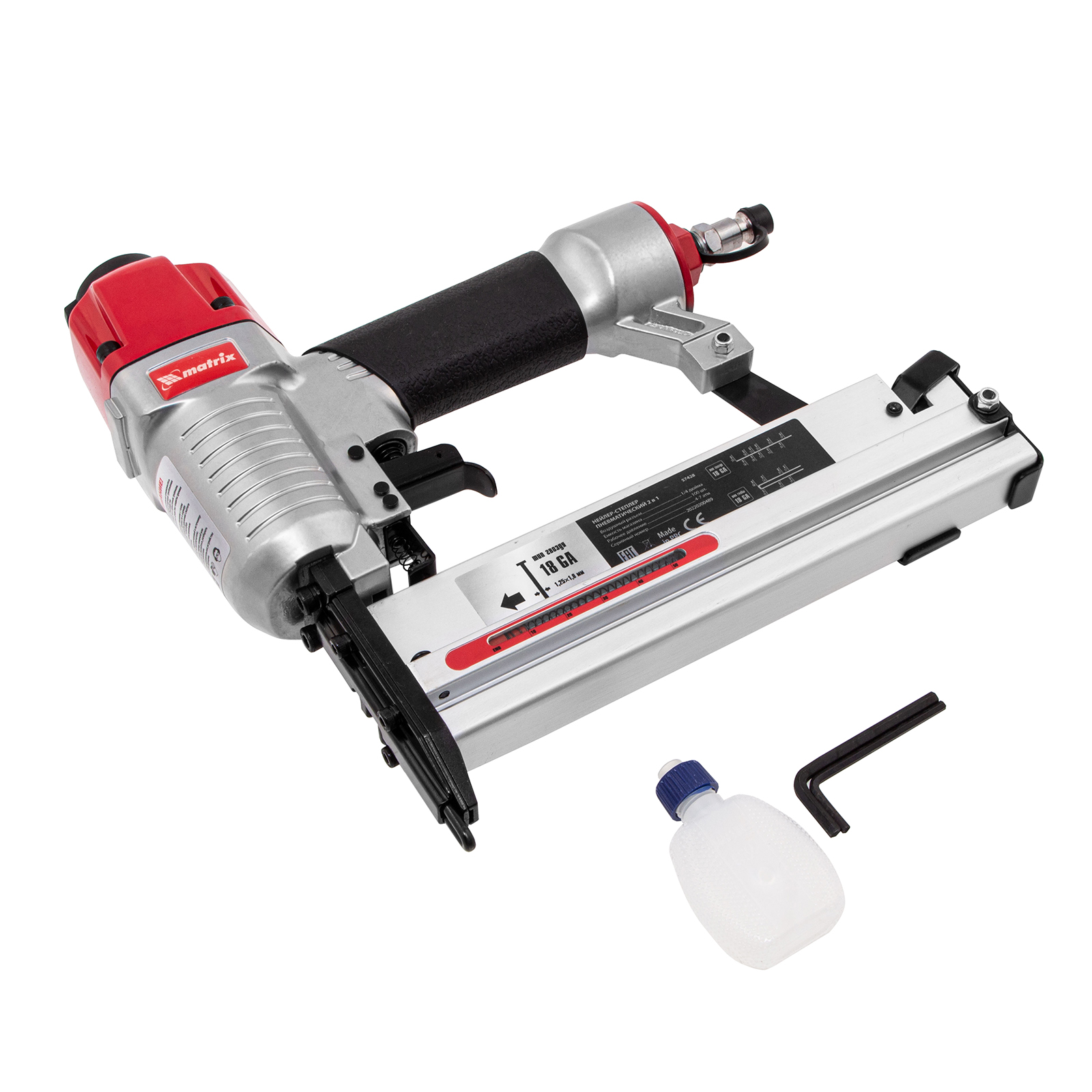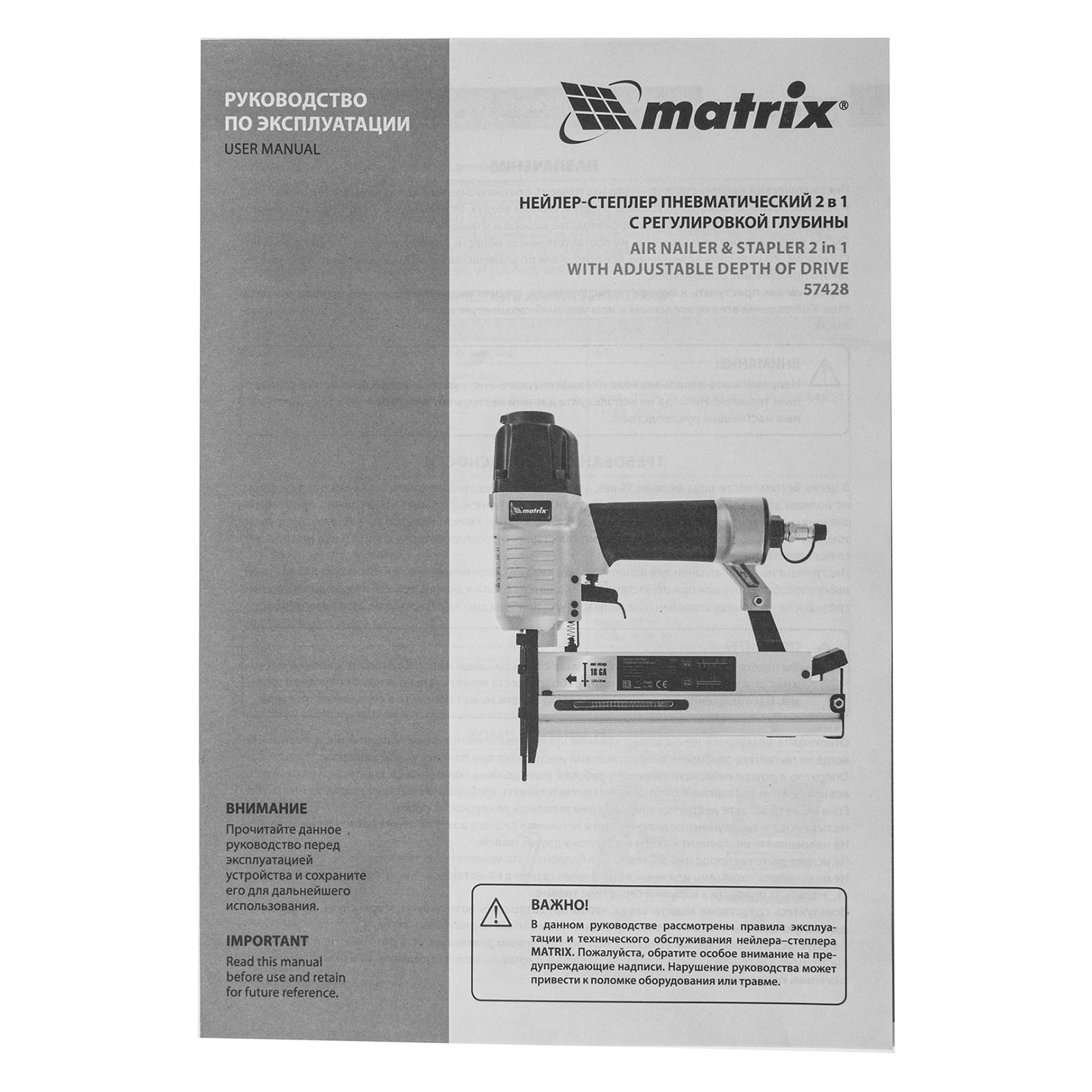 Пневматический нейлер-степлер Matrix 2 в 1 57428 с функцией регулировки глубины забивания предназначен для быстрого скрепления различных материалов гвоздями и скобами 18GA. Его используют для сборки мебели и деревянных каркасов, обшивки и утепления домов, монтажа окон, дверей, плинтусов или напольных покрытий. Нейлер-степлер подключается к любым типам компрессоров, т.к. расход воздуха составляет всего 0,7 л/мин.Преимущества Выбор режима работы — винтовой регулятор позволяет установить оптимальную глубину забивания. Безопасность — предохранитель не допускает случайного выпускания крепежа. Индикатор заполнения магазина — можно отслеживать количество крепежей для своевременной зарядки инструмента. Прочность и долговечность — металлический корпус устойчив к механическим повреждениям. Вместительный магазин — в него помещается 100 гвоздей или скоб, что позволяет реже производить заправку. Комфортная работа — обрезиненная рукоятка удобно ложится в руку и не выскальзывает из ладони Малый вес 1,33 кг — длительная работа со степлером-нейлером не вызывает дискомфорт. Удобное обслуживание — в набор входит масленка и 2 имбусовых ключа. Подтвержденное качество — гарантия на заводской брак действует 3 года.