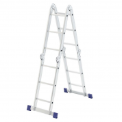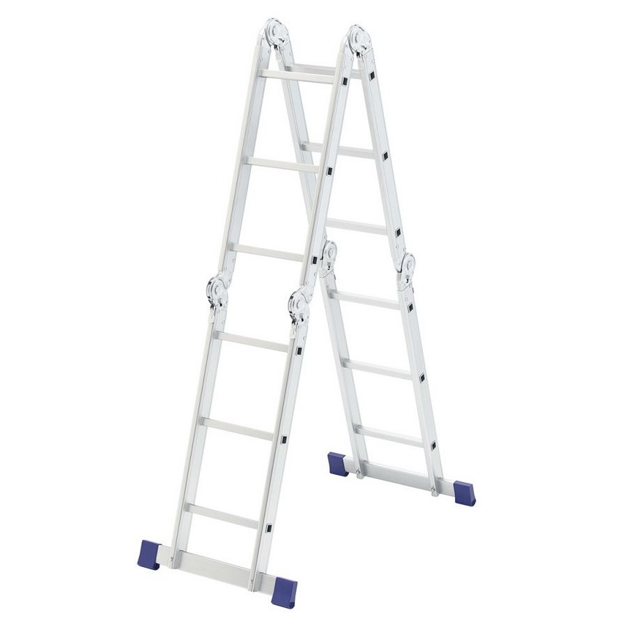Лестница трансформер изготовлена из алюминиевого профиля. Лестница имеет 4 секции по 3 перекладины соединенные между собой шарнирами. Ширина стабилизатора - 70 см. Можно использовать в нескольких положениях: