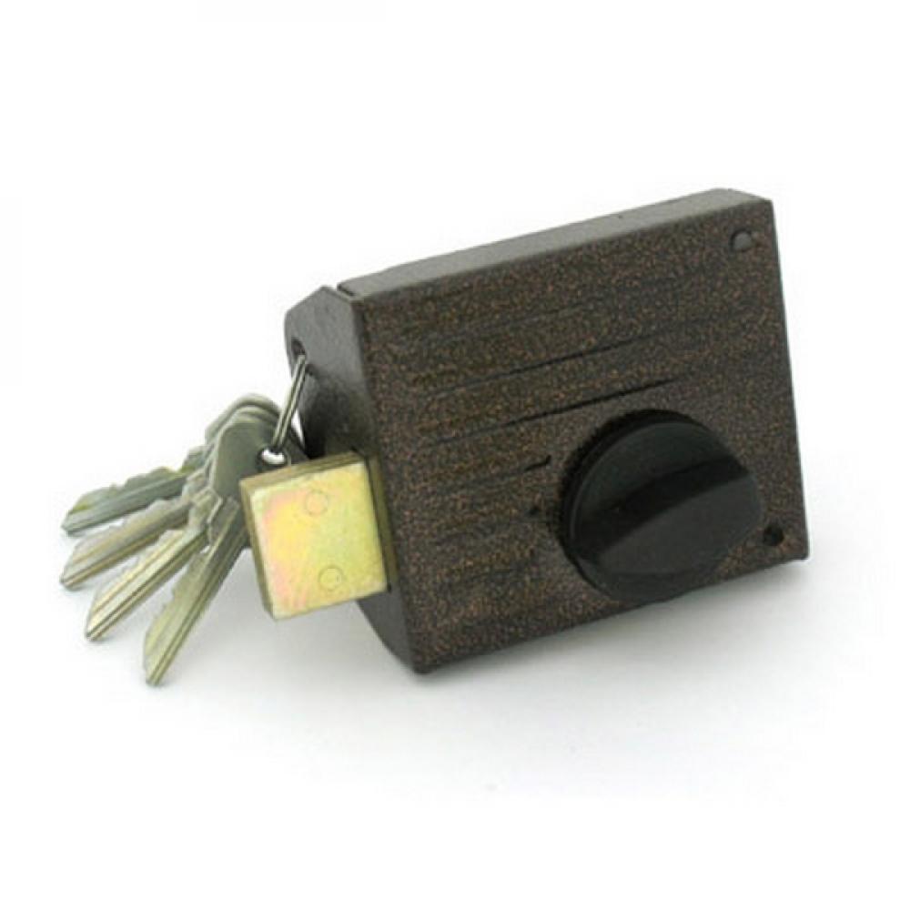 Замок накладной цилиндровый с вертушкой. Предназначен для установки на деревянные двери. Засов прямоугольного сечения размерами 9х28, с максимальным вылетом 25 мм. Удаление ключевого отверстия - 55 мм. Габариты замка - 90,5х78х21 мм. Комплектация - 4 ключа, запорная планка, накладка. Закрывание и открывание замка изнутри производится ручкой, снаружи ключом.