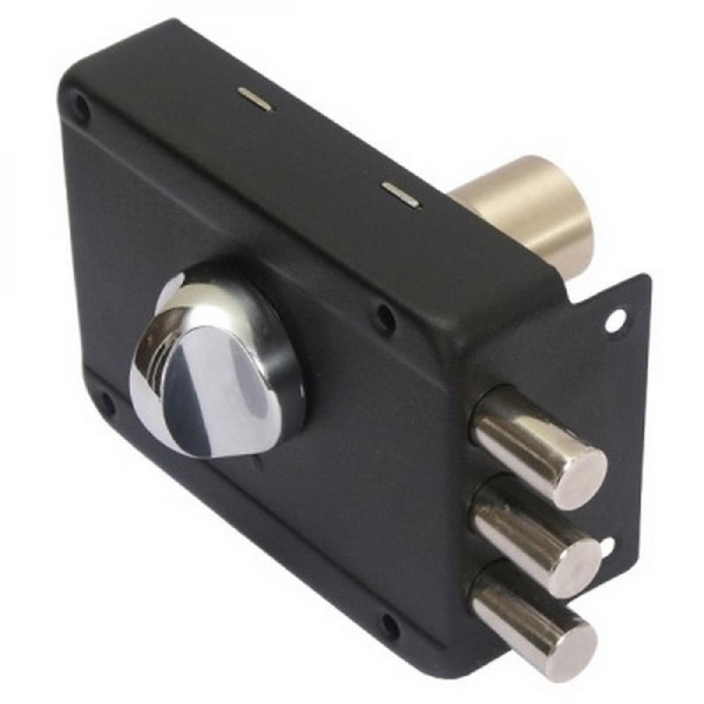 Замок накладной цилиндровый с вертушкой. Предназначен для установки на деревянные двери. Засов из трех цилиндрических ригелей диаметром 14 мм, с максимальным вылетом 24 мм. Удаление ключевого отверстия - 63 мм. Габариты замка - 123х87х31 мм. Комплектация - 5 ключей, запорная планка, накладка. Механизм замка под перфо-ключ, идет совместно с корпусом. Закрывание и открывание замка изнутри производится вертушкой, снаружи ключом.
