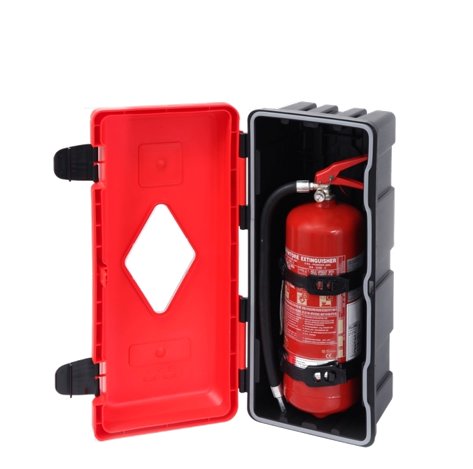 Бокс транспортный для хранения огнетушителей 6-9 кг на бензовозах и других машинах. Ящик пластиковый устанавливается на грузовой транспорт, закрывается на защелку или ключ. Система блокирования огнетушителя с антивибрацией, эргономичные ремни крепления.