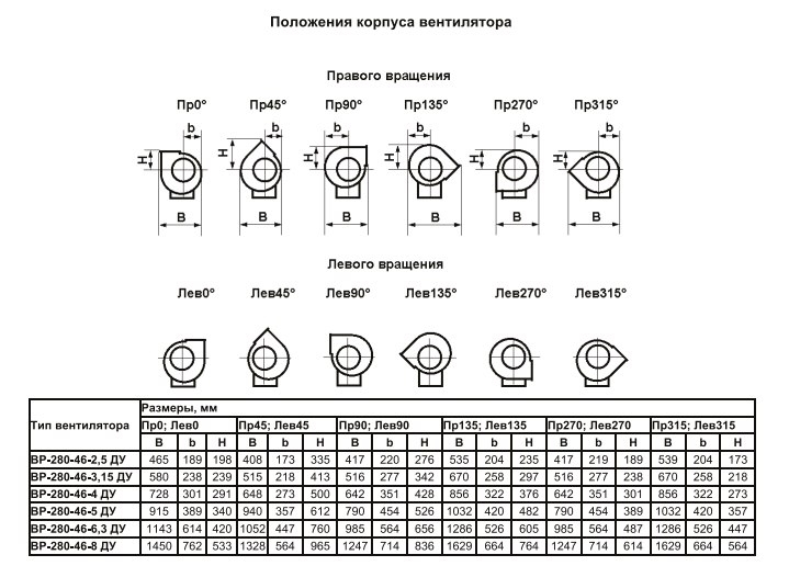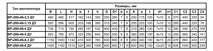 Вентиляторы BP-280-46ДУ со спиральным корпусом оснащаются радиальными колесами с вперед загнутыми лопатками. Рабочие колеса закрепляются непосредственно на валу электродвигателя. Корпус вентилятора, рабочее колесо и рама – сварные.