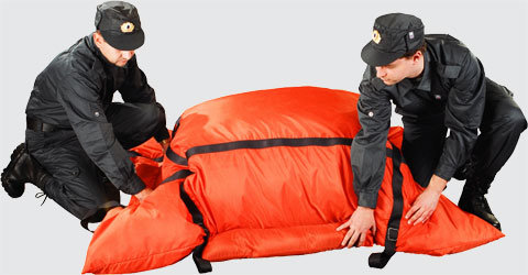 Противоосколочное одеяло "УЮТ" состоит из пакета защитного в тканевом чехле, четырех утяжелителей - мешков с песком, контейнера, который служит для транспортировки и хранения изделия.