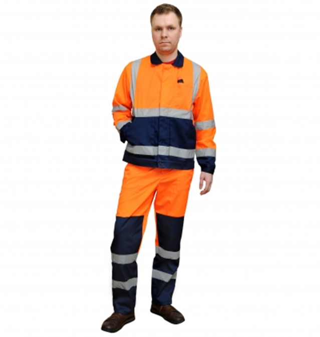 Костюм дорожника состоит из куртки и полукомбинезона. Куртка прямого кроя, с отложным воротником, с центральной супатной застежкой на пуговицы, с нагрудным и двумя накладными боковыми карманами. Световозвращающая лента 5 см.