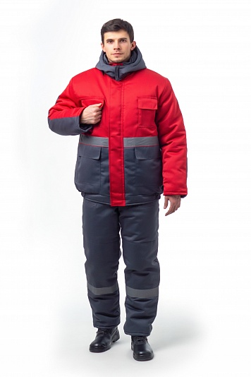 Куртка с застежкой-молнией и ветрозащитным клапаном, пристегивающимся утепленным капюшоном, воротником стойкой, нагрудными и нижними карманами с клапанами на липучке. Полукомбинезон с регулируемыми бретелями, с застежкой-молнией, нагрудными карманами с клапаном, боковыми карманами, эластичной тесьмой по талии спинки. Костюм с отделкой из контрастной ткани широкой СОП.