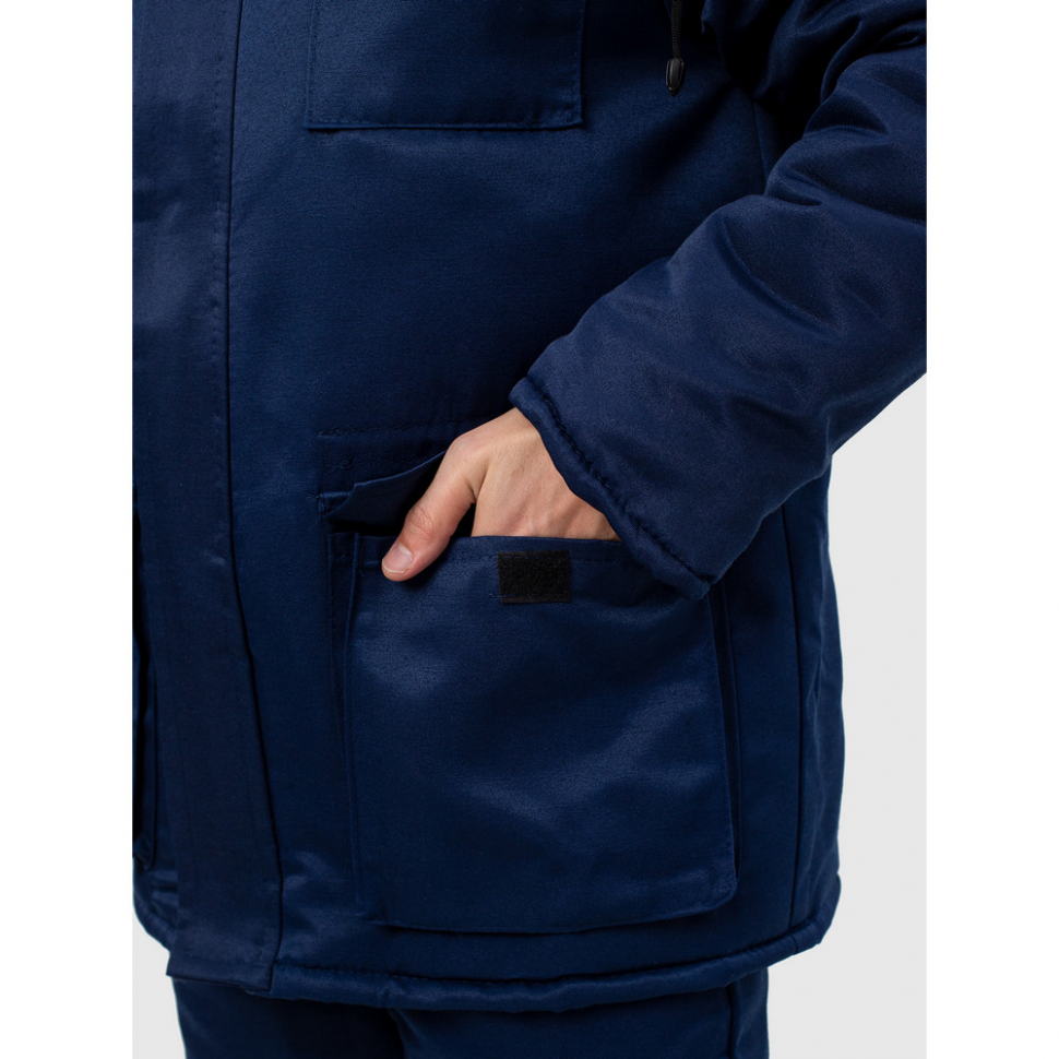 Куртка костюма центральную застежку-молнию, ветрозащитную планку, отложной воротник и съемный капюшон. Регулировка объема по линии талии осуществляется с помощью кулиски. Модель дополнена четырьмя вместительными карманами: двумя нагрудными и двумя боковыми с клапанами на липучках, обеспечивающими безопасное хранение инструментов и личных вещей. Рукава оснащены трикотажными манжетами для защиты от холодного воздуха.