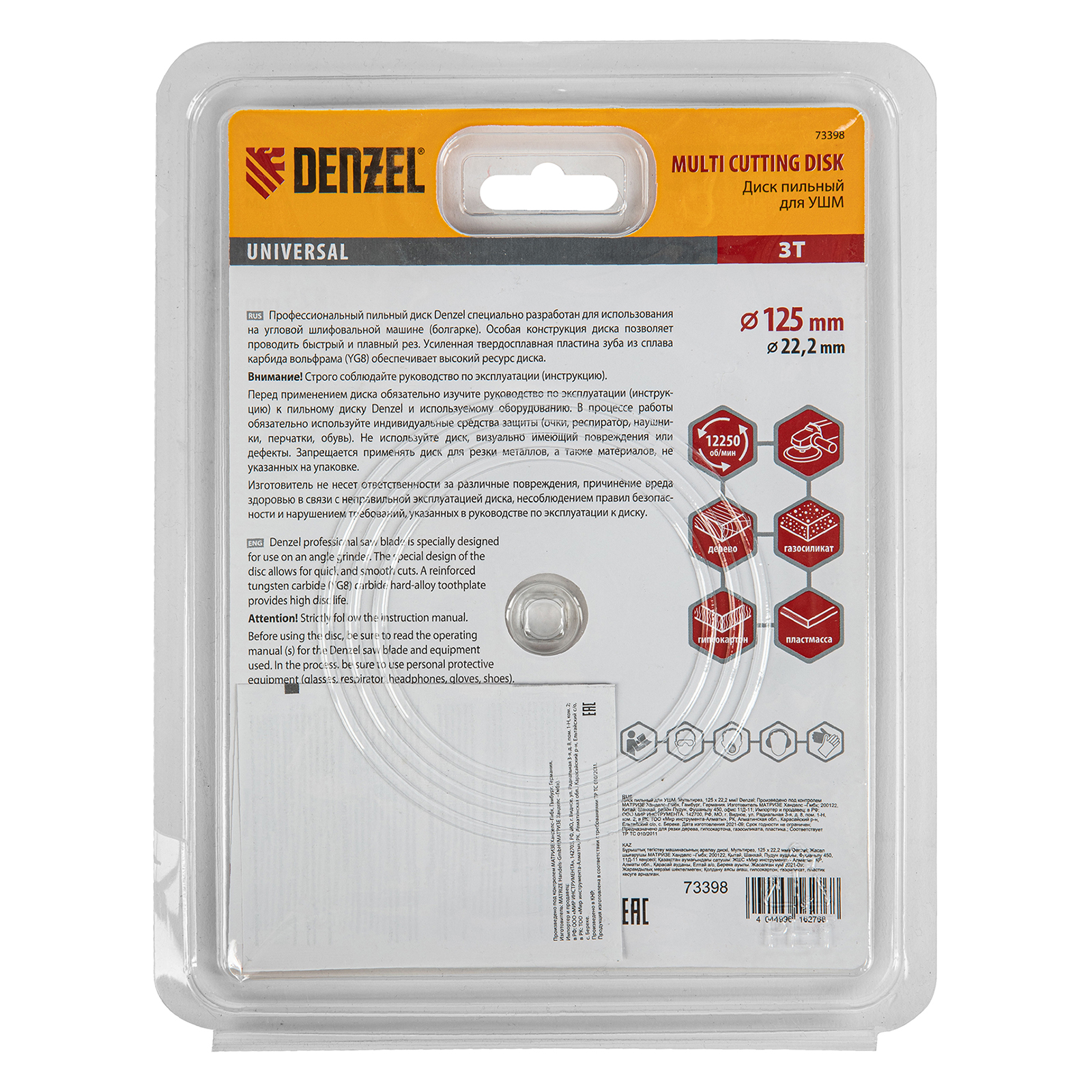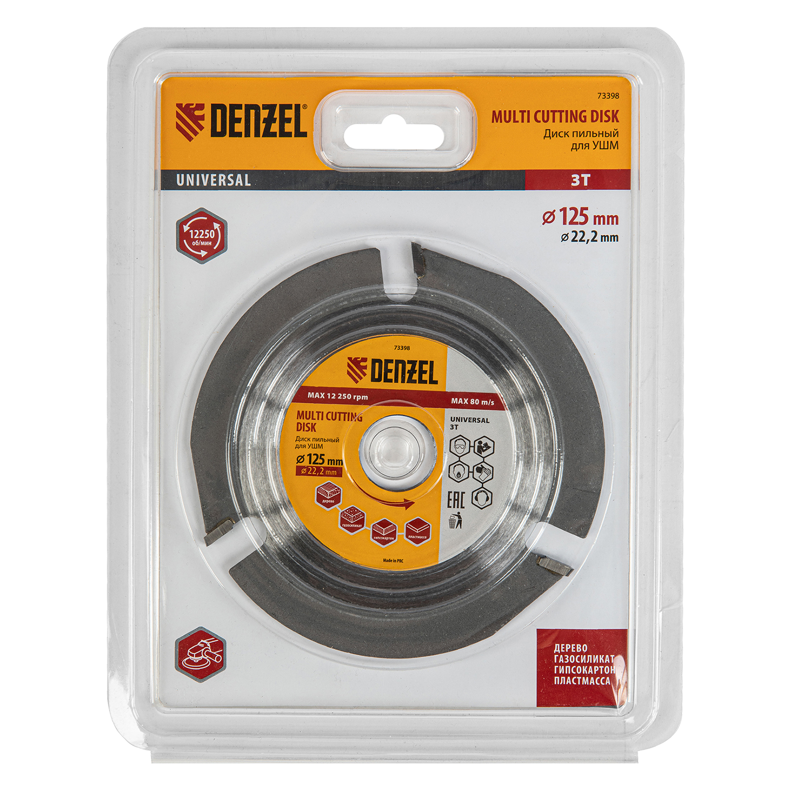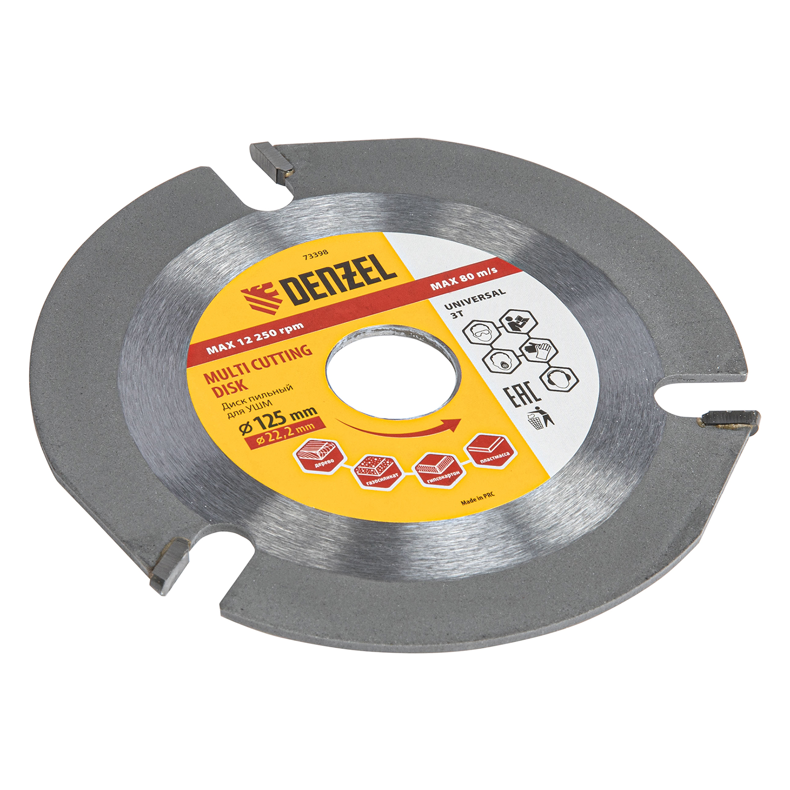 Пильный диск для УШМ Denzel Мультирез 73398, 125 х 22,2 мм, позволяет быстро распилить древесину, тонкий пластик, гипсокартон и газосиликат. Является оснасткой для углошлифовальных машин, что делает его универсальным. Будет полезен как профессиональным мастерам, так и домашним умельцам. Перед эксплуатацией необходимо изучить инструкцию как диска, так и углошлифовальной машины.ПреимуществаДиск имеет высокий рабочий ресурс благодаря усиленным режущим пластинам из высокотвердого сплава карбида вольфрама YG8.Особая форма режущих пластин позволяет делать поперечные выборки древесины и других материалов.За счет продуманной геометрии диск быстро и плавно режет материалы без рывков, обеспечивая высокое качество работ.Прочный корпус не деформируется даже при интенсивном использовании.
