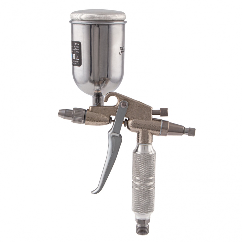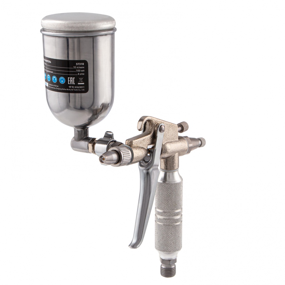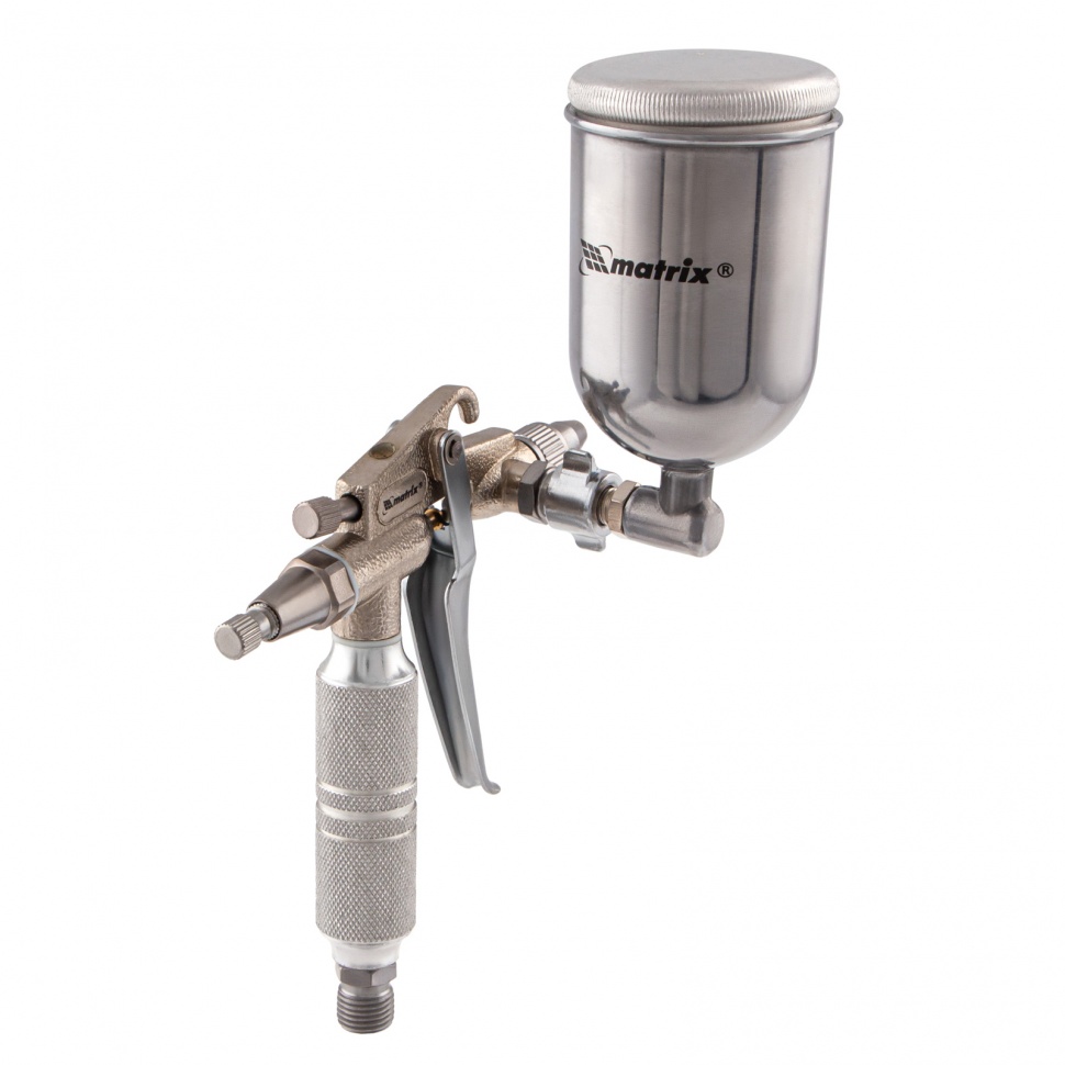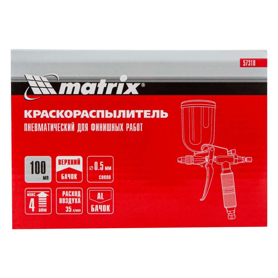 Пневматический краскораспылитель Matrix 57318 с верхним бачком объемом 0,1 л и соплом диаметром 0,5 мм позволяет равномерно распределить грунтовку или краску по поверхности и применяется для финишных работ. Краскопульт можно использовать с масляными и латексными красками. За счет низкого расхода воздуха 35 л/мин его можно подключать даже к небольшим компрессорам.Преимущества Качественное окрашивание — технология распыления MP (среднее давление) повышает коэффициент переноса краски на поверхность. Верхнее расположение бачка — краска расходуется полностью, и ее легко заправлять. Универсальность — бак изготовлен из алюминия, что позволяет использовать краски на основе растворителей. Надежность и долговечность — алюминиевый пистолет устойчив к механическим повреждениям. Комфортная эксплуатация — краскораспылитель оснащен регуляторами расхода краски и формы распыления. Малый вес 0,32 кг — даже продолжительная работа краскораспылителем не вызывает дискомфорт.