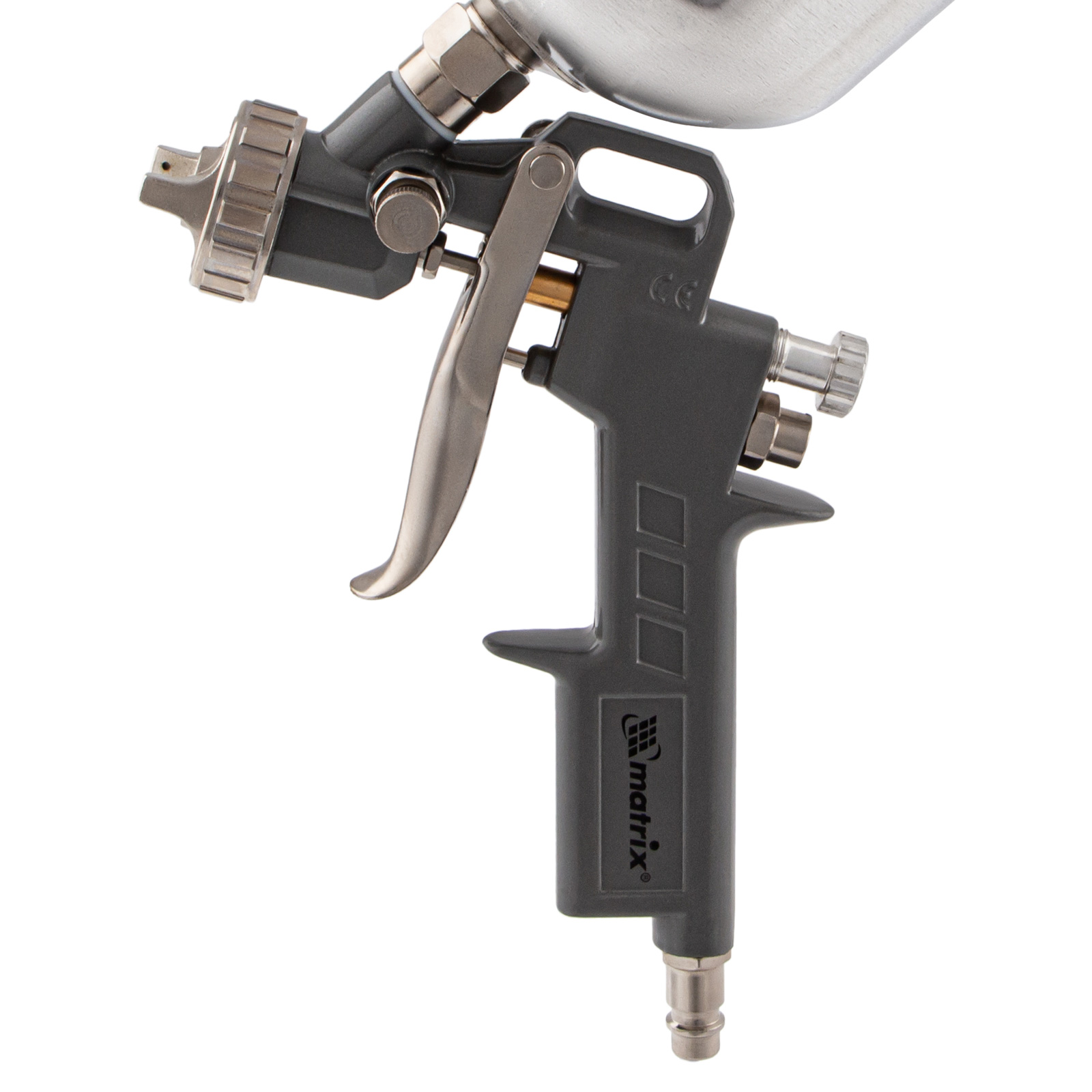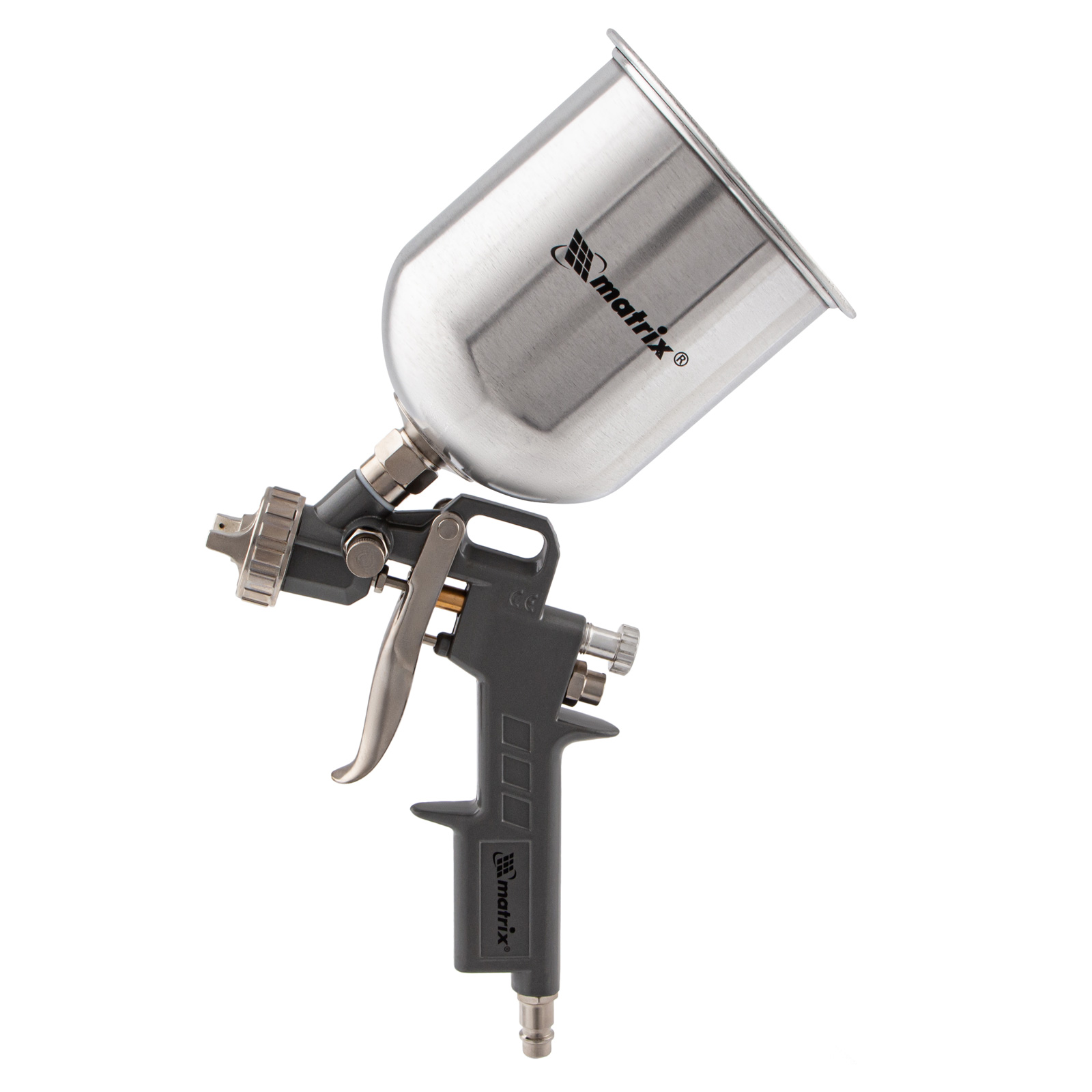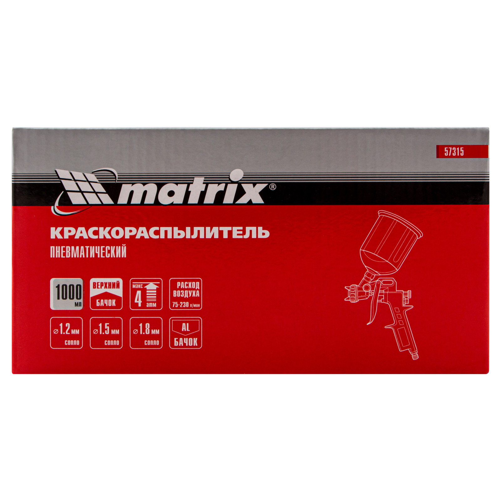 Пневматический краскораспылитель Matrix 57315 с верхним бачком объемом 1,0 л и соплами диаметром 1,2, 1,5 и 1,8 мм используется для окрашивания поверхностей и нанесения защитных составов. Он может работать с различными составами, такими как шпаклевка, лак и краска, т. к. в комплекте идет набор сменных сопел различного диаметра. Краскораспылитель пригодится в автосервисе или на стройке, а также на мебельном производстве для обработки дерева лаком.ПреимуществаВысокое качество работ — тип распыления MP позволяет получить среднее давление на выходе, обеспечивая равномерное окрашивание и снижение потерь краски.Обработка больших поверхностей — увеличенный бак объемом 1 л обеспечивает значительный запас рабочего раствора, что позволяет реже прерываться для заправки.Верхнее расположение бака — такое решение экономит время на заправку, а также позволяет использовать всю краску полностью.Использование красок на основе растворителей — алюминиевый бак выдерживает воздействие агрессивных сред.Долговечность — металлический пистолет устойчив к износу и механическим повреждениям.Настройка параметров работы — можно установить величину расхода краски и выбрать форму распыления в зависимости от материала и площади обрабатываемой поверхности.Малый вес 0,56 кг — руки не устают даже при длительной работе.