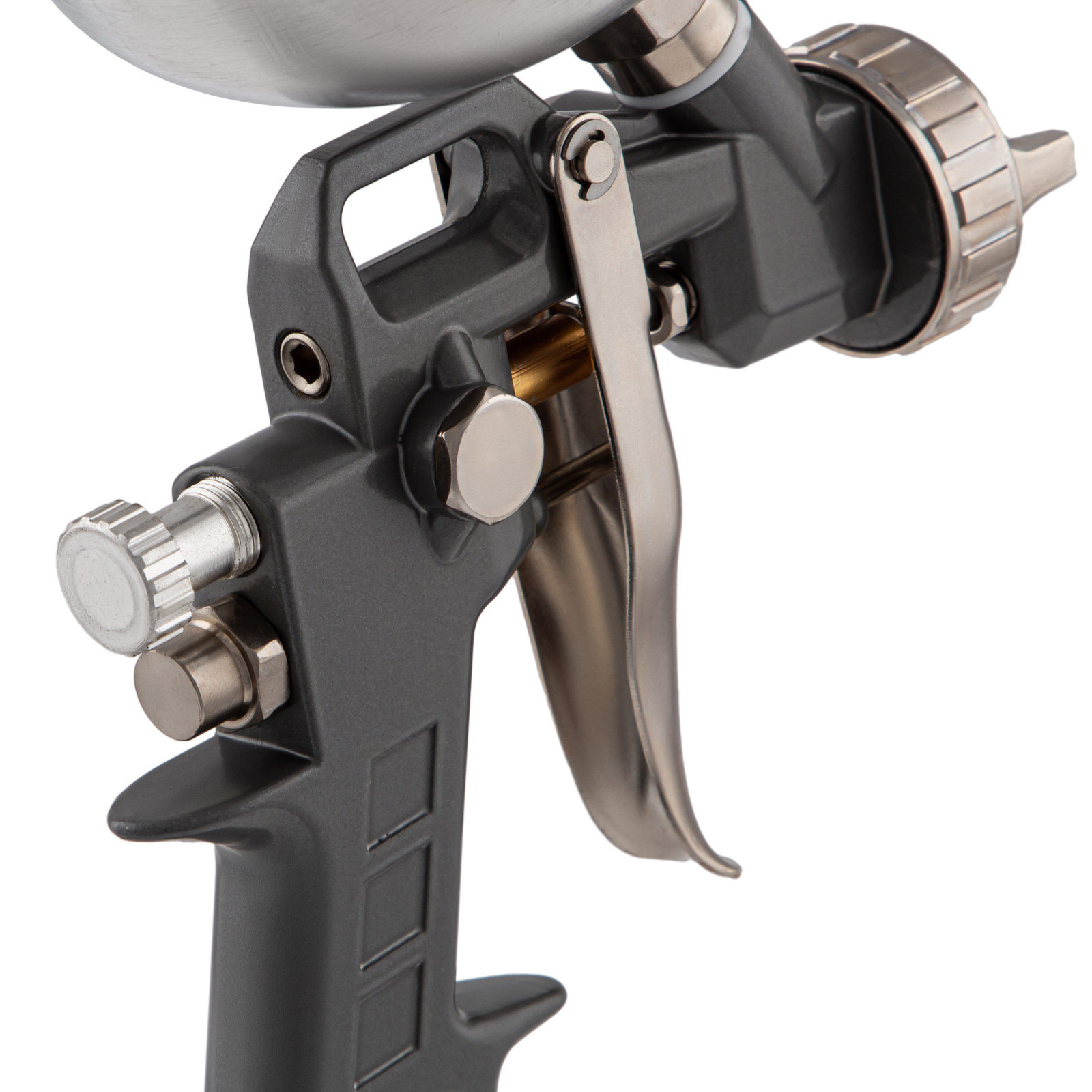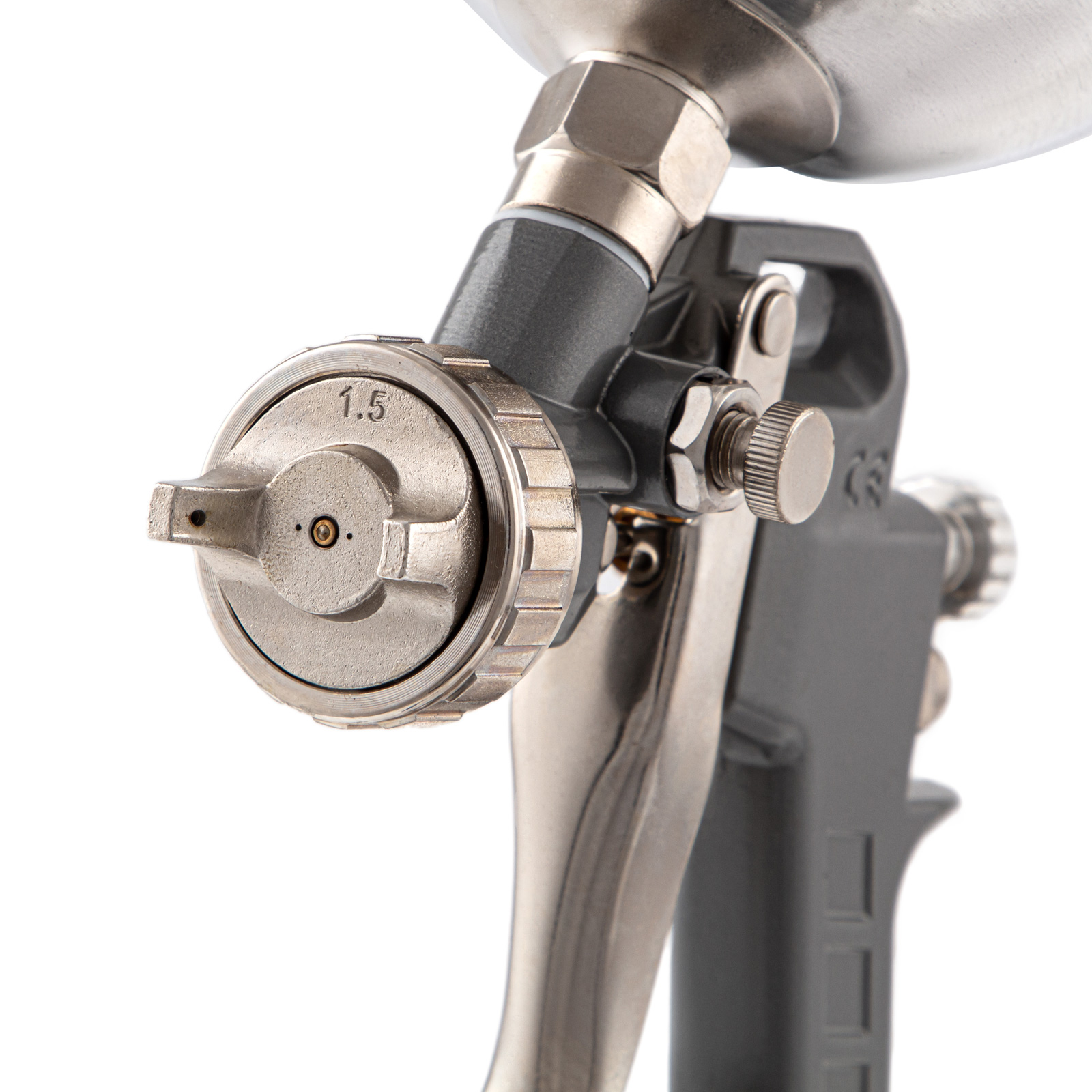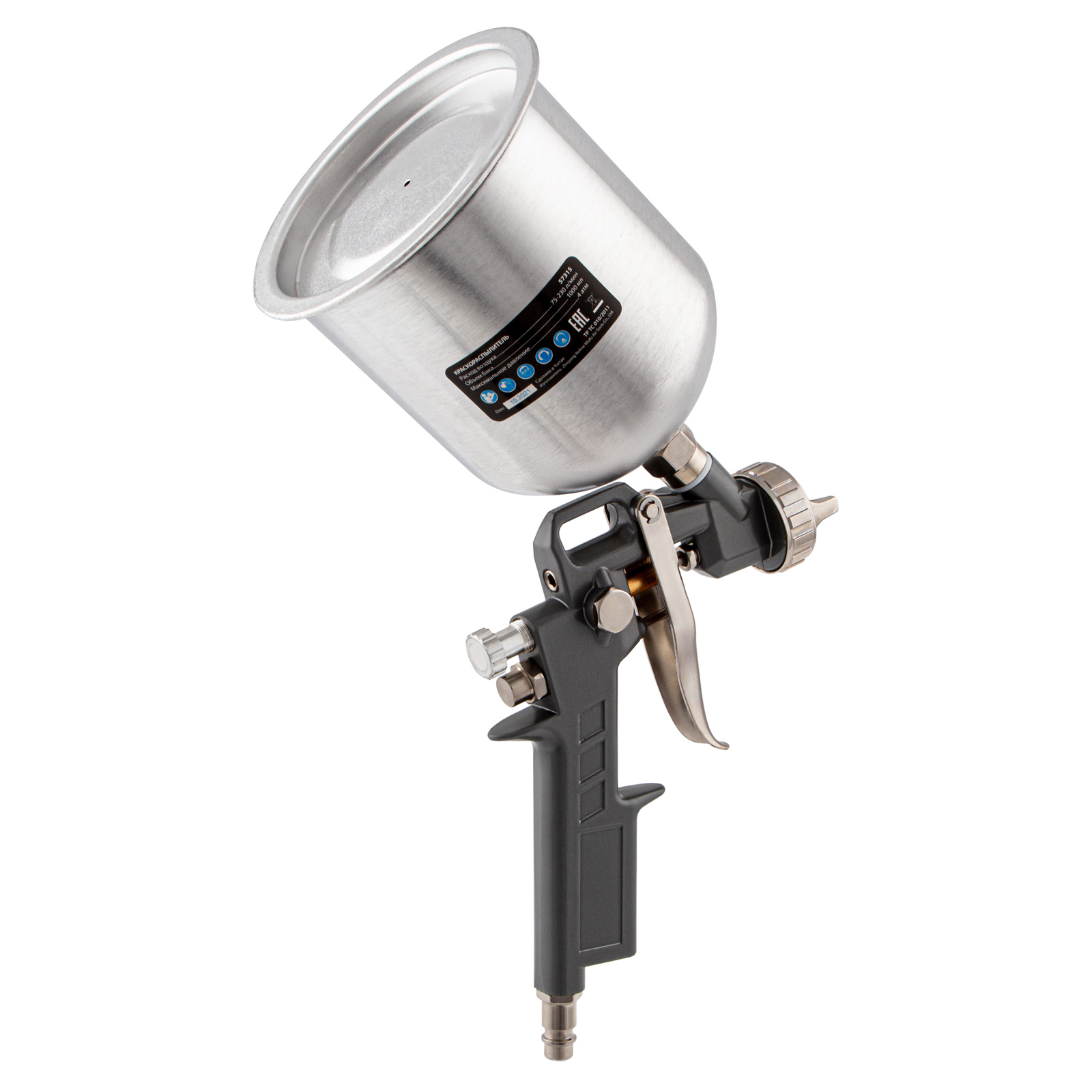 Пневматический краскораспылитель Matrix 57315 с верхним бачком объемом 1,0 л и соплами диаметром 1,2, 1,5 и 1,8 мм используется для окрашивания поверхностей и нанесения защитных составов. Он может работать с различными составами, такими как шпаклевка, лак и краска, т. к. в комплекте идет набор сменных сопел различного диаметра. Краскораспылитель пригодится в автосервисе или на стройке, а также на мебельном производстве для обработки дерева лаком.ПреимуществаВысокое качество работ — тип распыления MP позволяет получить среднее давление на выходе, обеспечивая равномерное окрашивание и снижение потерь краски.Обработка больших поверхностей — увеличенный бак объемом 1 л обеспечивает значительный запас рабочего раствора, что позволяет реже прерываться для заправки.Верхнее расположение бака — такое решение экономит время на заправку, а также позволяет использовать всю краску полностью.Использование красок на основе растворителей — алюминиевый бак выдерживает воздействие агрессивных сред.Долговечность — металлический пистолет устойчив к износу и механическим повреждениям.Настройка параметров работы — можно установить величину расхода краски и выбрать форму распыления в зависимости от материала и площади обрабатываемой поверхности.Малый вес 0,56 кг — руки не устают даже при длительной работе.
