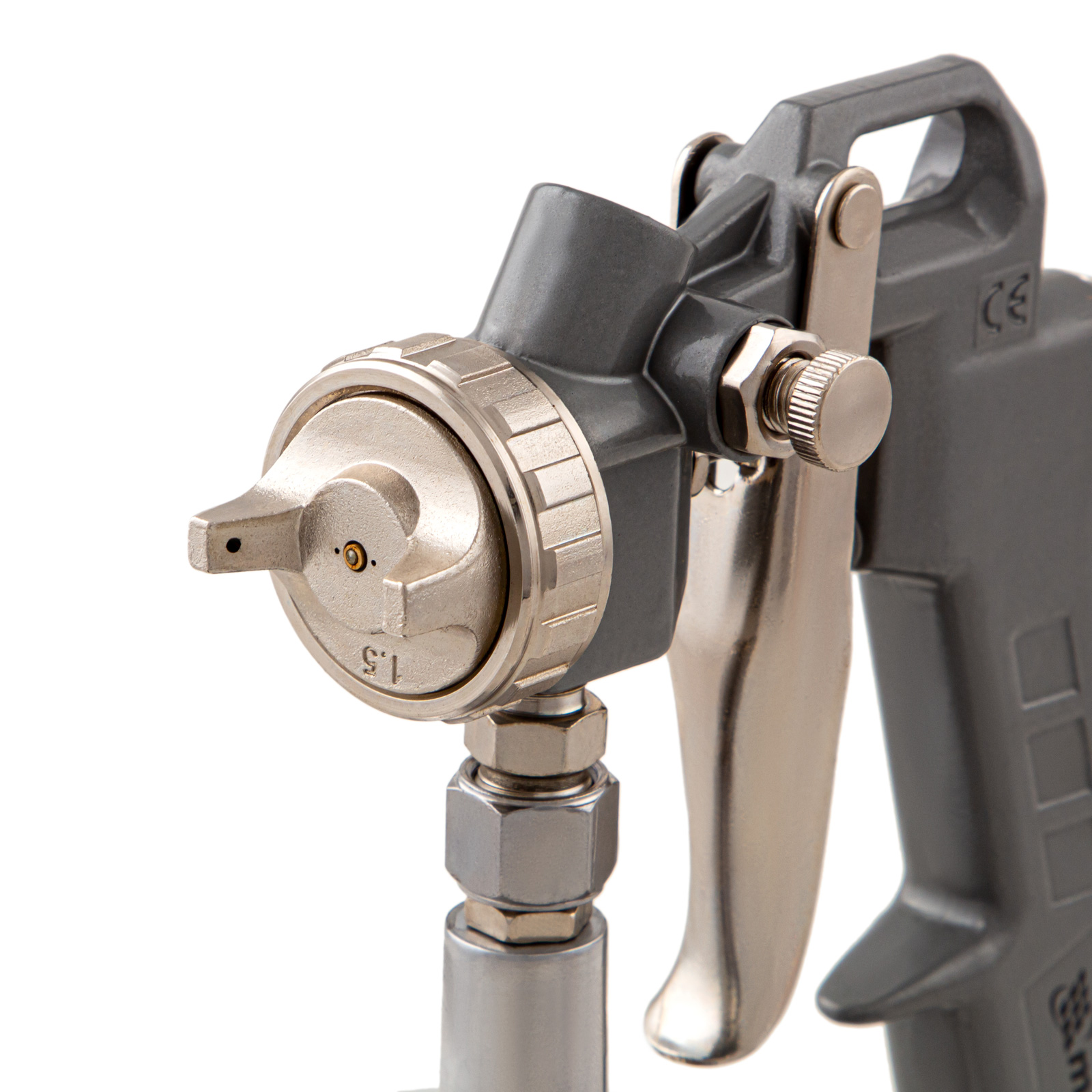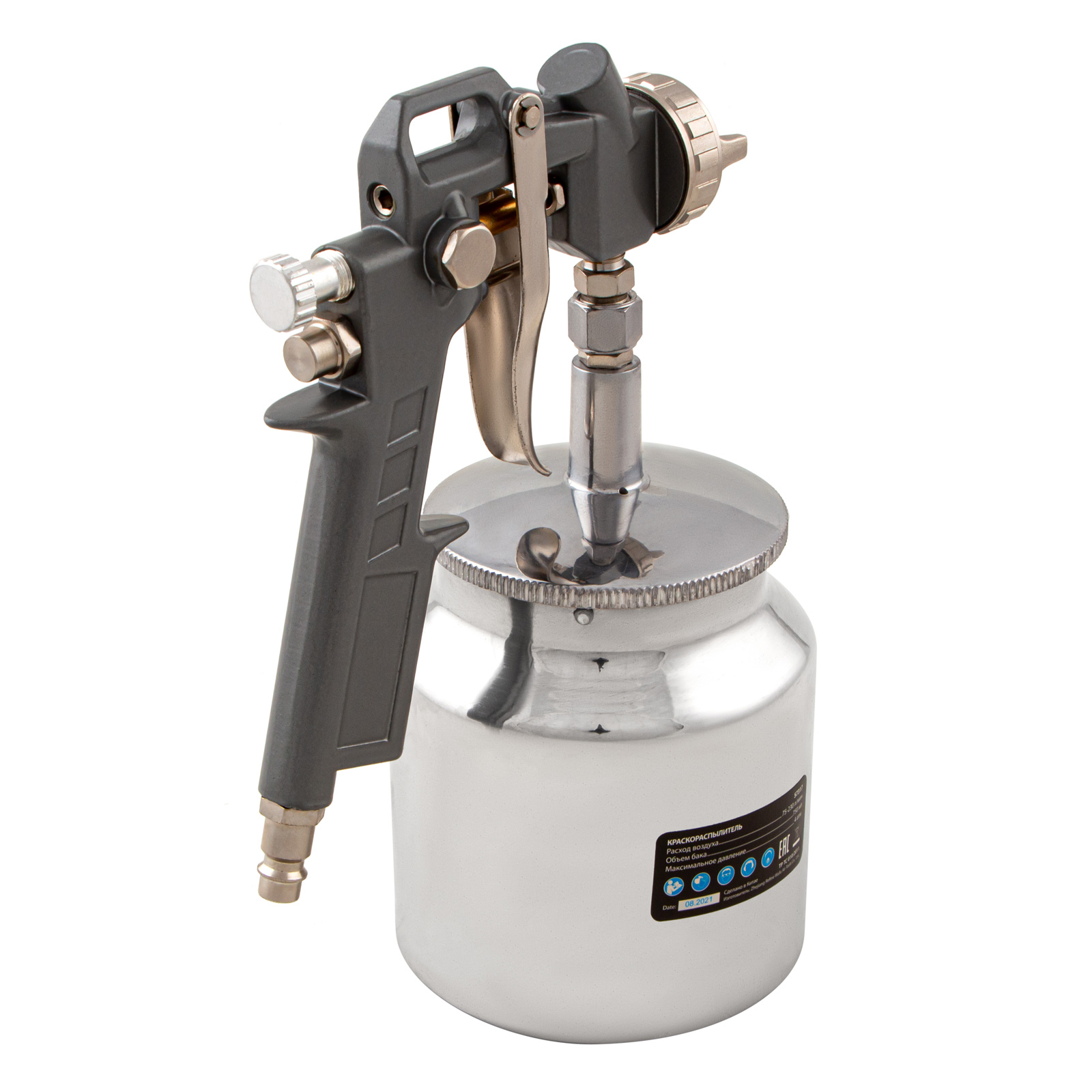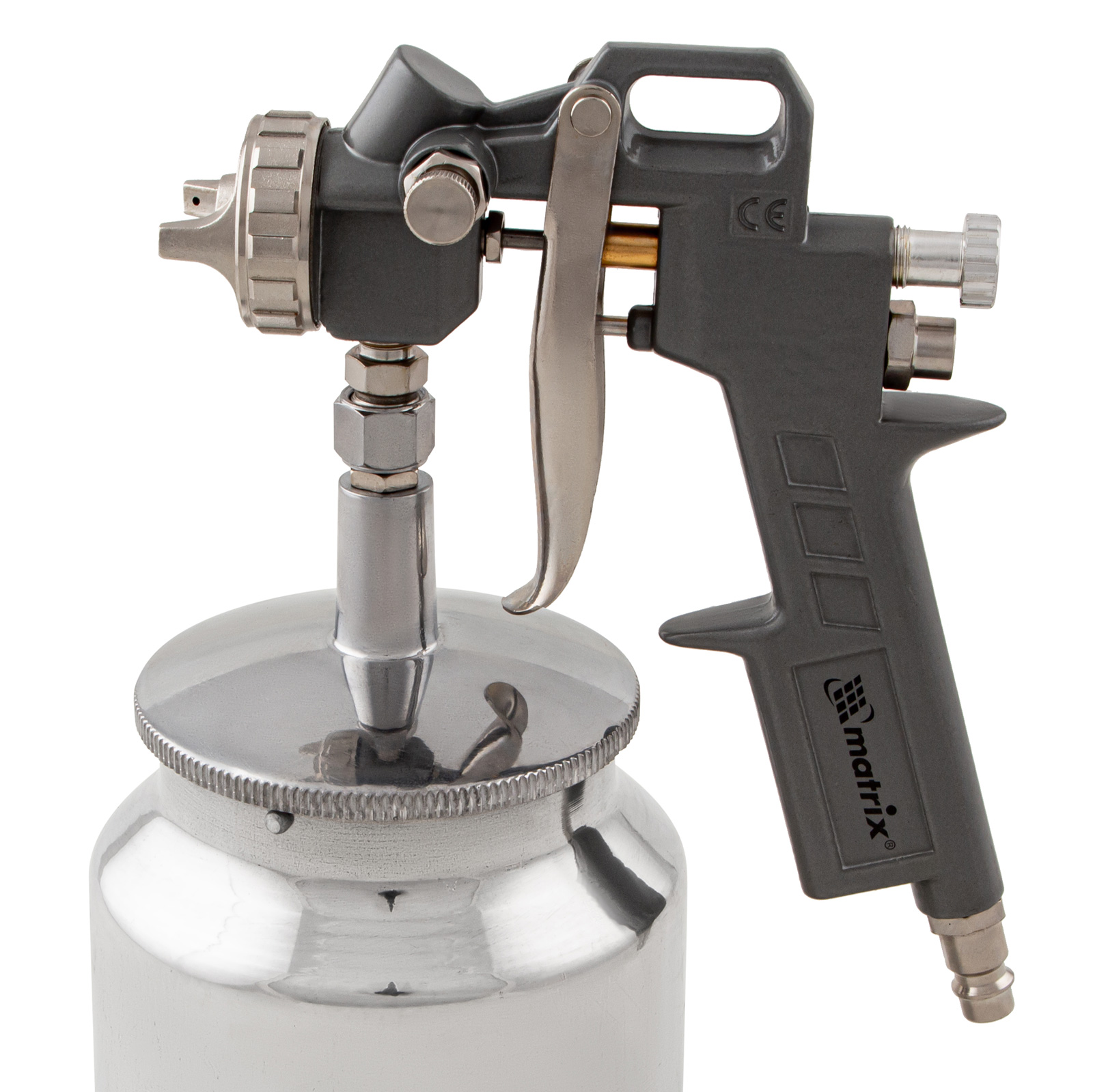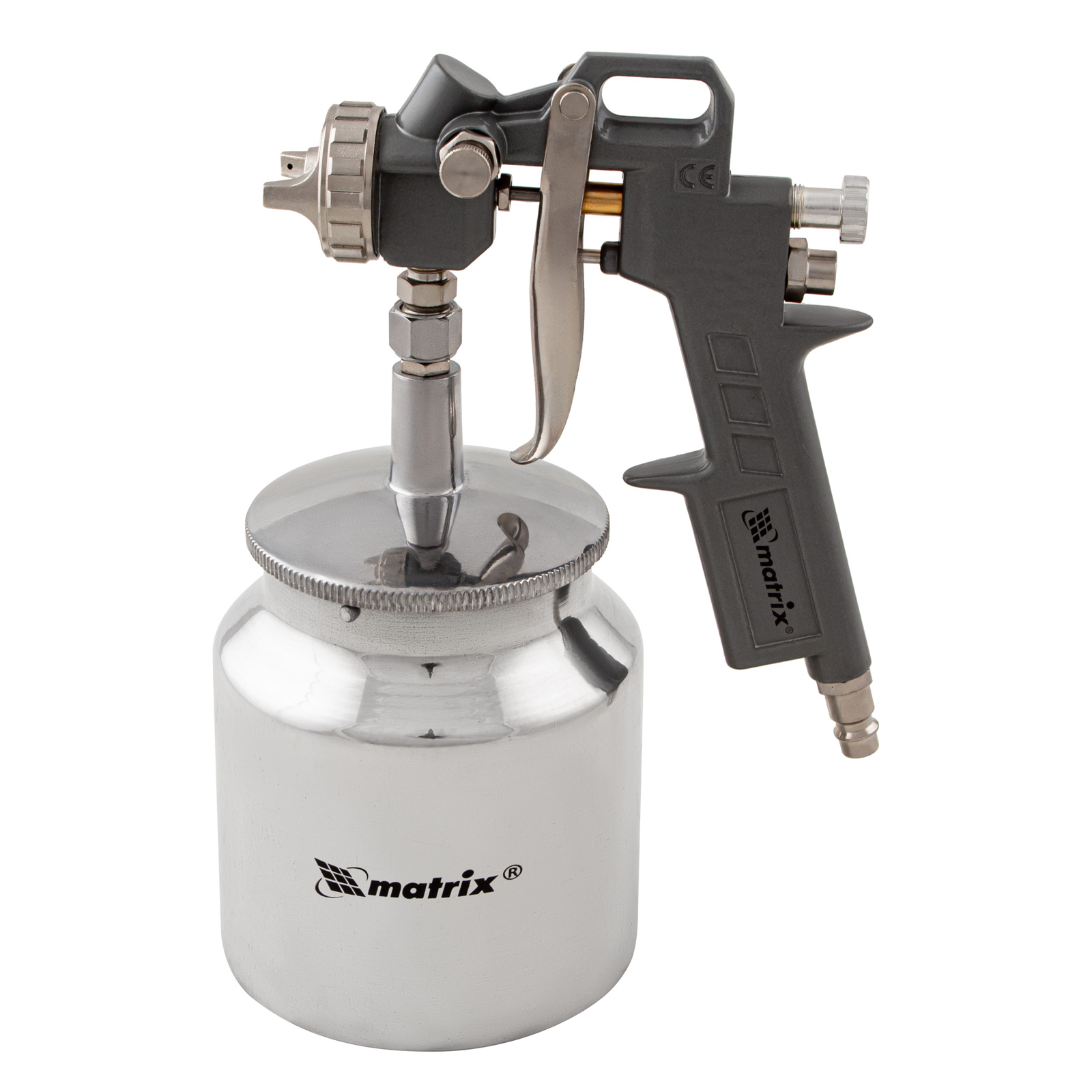 Пневматический краскораспылитель Matrix 57317 с нижним бачком объемом 0.75 л и соплами диаметром 1,2, 1,5 и 1,8 мм используется для окрашивания металлических, деревянных, керамических и пластмассовых поверхностей. Благодаря сменным соплам краскораспылитель может работать с различными по густоте составами: лаком, шпаклевкой, краской. Он пригодится на стройке, в автомастерской и на мебельном производстве.Преимущества Эффективность — краскораспылитель с типом распыления MP (среднее давление) обеспечивает высокое качество окрашивания с невысокими потерями рабочего состава. Вместительный бак — объем 0,75 л позволяет обрабатывать большие площади и реже прерываться для заправки. Нижнее расположение бака — краскораспылитель можно ставить на горизонтальные поверхности, также он не загораживает обзор в процессе работы. Работа с красками на основе растворителя — бак выполнен из алюминия, невосприимчивого к воздействию агрессивных сред Надежность и долговечность — металлический пистолет отличается высокой механической прочностью. Выбор оптимального режима работы — краскопульт имеет функции регулировки расхода краски, а также смены формы распыления. Малый вес 0,62 кг — краскораспылителем можно длительное время работать без усталости.