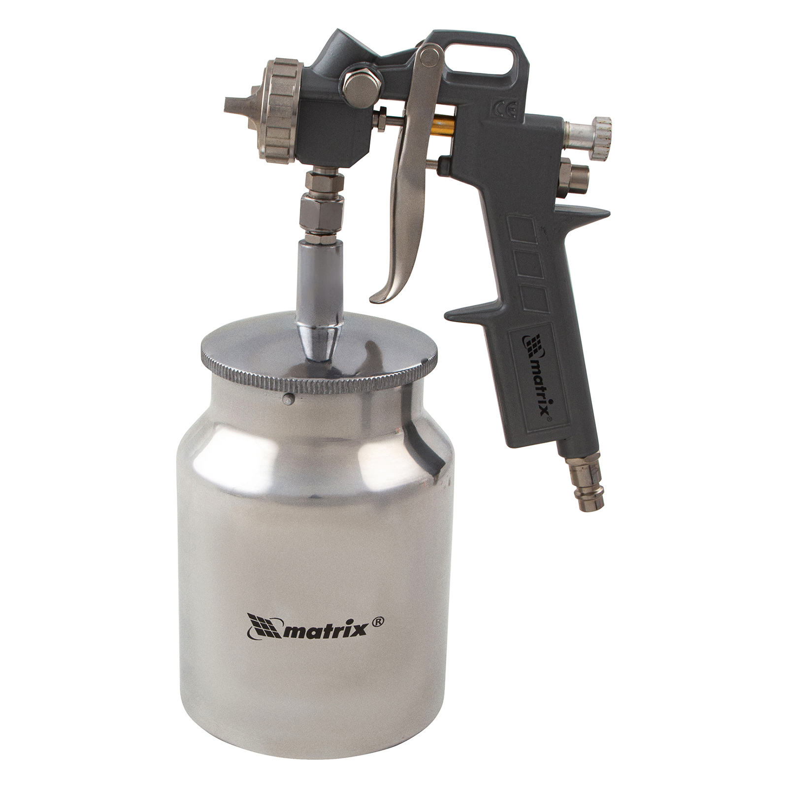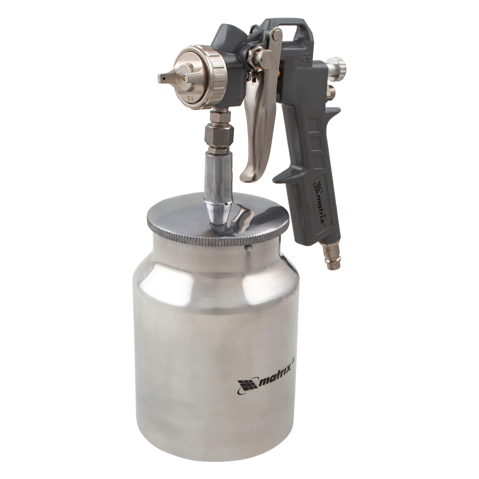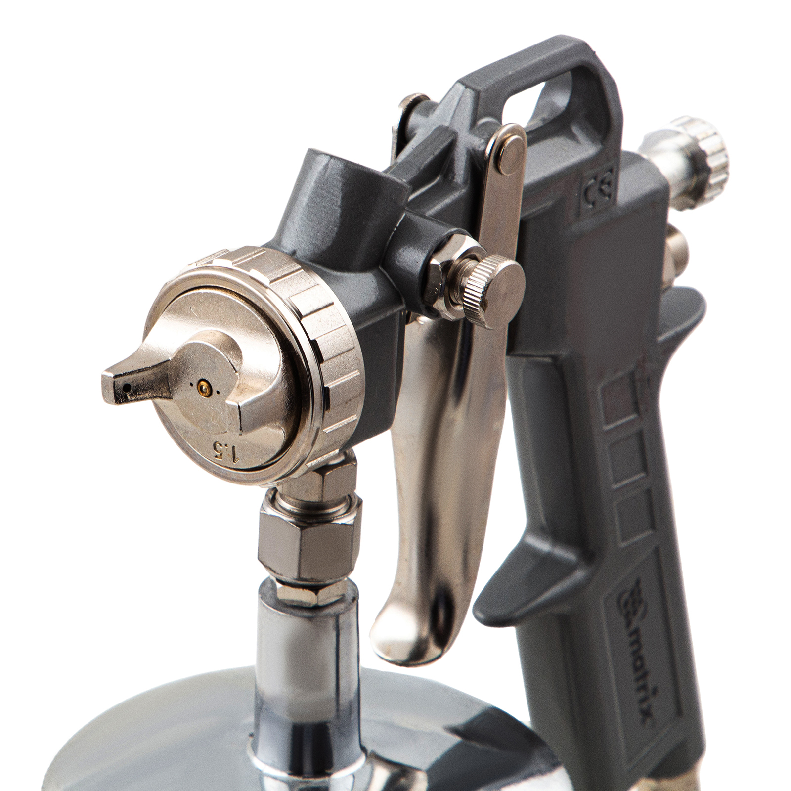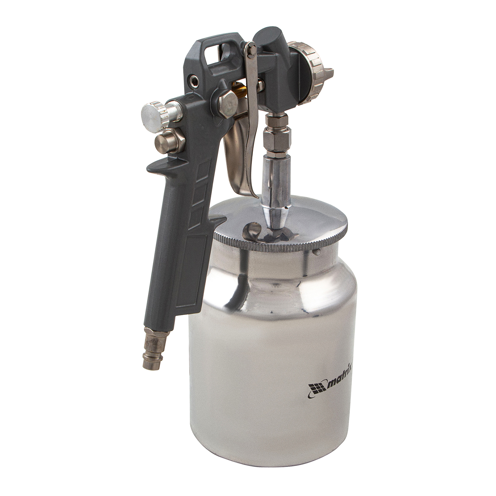 Пневматический краскораспылитель Matrix 57316 с нижним бачком объемом 1,0 л и соплами диаметром 1,2, 1,5 и 1,8 мм используется для окрашивания металлических, деревянных, керамических и пластмассовых поверхностей. Благодаря сменным соплам краскораспылитель может работать с различными по густоте составами: лаком, шпаклевкой, краской. Он пригодится на стройке, в автомастерской и на мебельном производстве.Преимущества Эффективность — краскораспылитель с типом распыления MP (среднее давление) обеспечивает высокое качество окрашивания с невысокими потерями рабочего состава. Вместительный бак — объем 1 л позволяет обрабатывать большие площади и реже прерываться для заправки. Нижнее расположение бака — краскораспылитель можно ставить на горизонтальные поверхности, также он не загораживает обзор в процессе работы. Работа с красками на основе растворителя — бак выполнен из алюминия, невосприимчивого к воздействию агрессивных сред Надежность и долговечность — металлический пистолет отличается высокой механической прочностью. Выбор оптимального режима работы — краскопульт имеет функции регулировки расхода краски, а также смены формы распыления. Малый вес 0,64 кг — краскораспылителем можно длительное время работать без усталости.