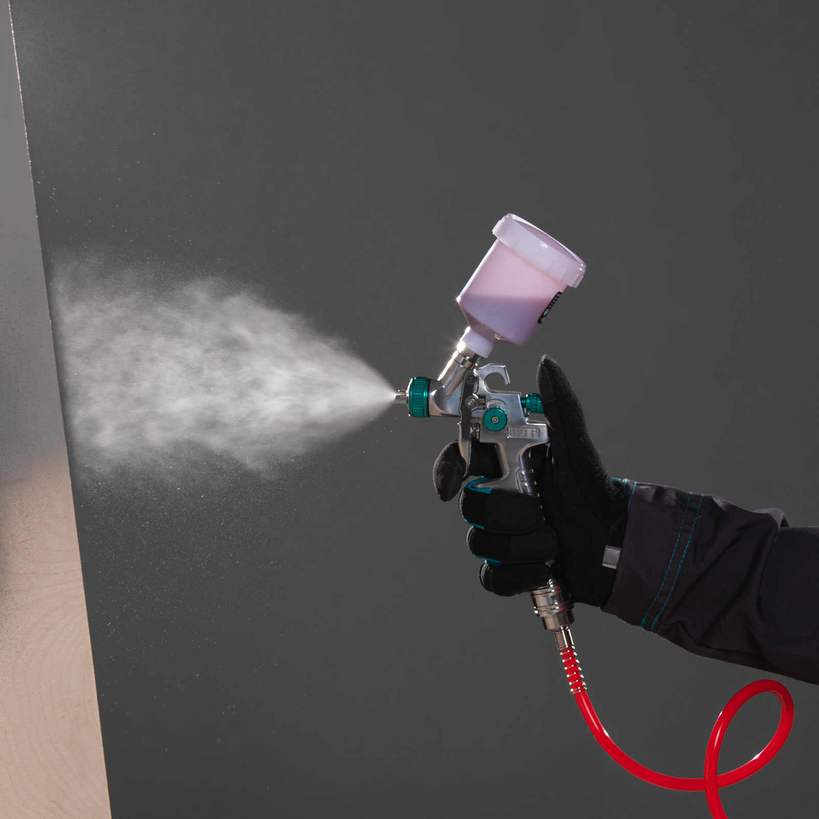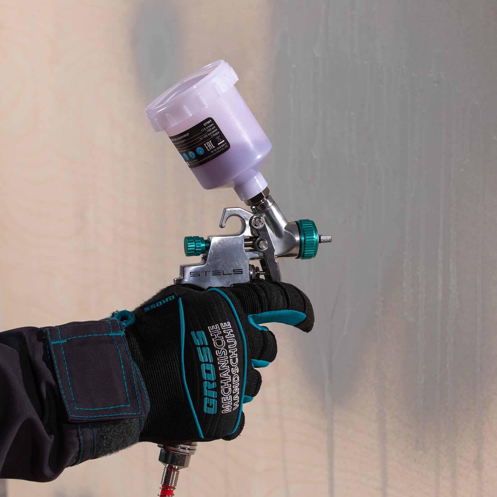 Гравитационный краскораспылитель Stels AG 810 HVLP 57361 с соплами диаметром 0,8 и 1 мм предназначен для выполнения среднего объема работ: декорирования небольших поверхностей, окраски металлических деталей, покрытия мебели лаком. Может использоваться дома, в гараже, автосервисе, частной мастерской, на небольшой строительной площадке. Решать поставленные задачи помогают 2 сопла диаметром 0,8 мм и 1 мм.Благодаря технологии HVLP (High Volume Low Pressure, «Высокий объем, низкое давление») окрасочные работы осуществляются под давлением не более 0,7 бар и с расходом материала всего 70-100 мл/мин. Это позволяет переносить на рабочую зону до 65% всей краски/лака, что на 30-35% выше, чем у краскопультов с высоким давлением. ПреимуществаПродуманная конструкция — бачок с верхним расположением вмещает 100 мл краски или лака, благодаря чему гравитационный краскораспылитель становится мобильным и легко готовится к работе, ведь не нужно подключать его к большим красконагнетательным емкостям.Высокий ресурс — металлический корпус покрыт полированным хромом.Простая подготовка к работе — коннектор Рапид (Евро) делает стыковку с воздушным шлангом компрессора быстрой и легкой.Комфортная эксплуатация — эргономичная рукоятка с рельефным дизайном обеспечивает удобный захват и комфортную работу.Легкий вес 390 грамм — мастер не устанет при выполнении покрасочных работ.Многозадачность — система регулировки подачи материала, направления факела и формы факела помогает подстраиваться под разные задачи и решать их одним инструментом.