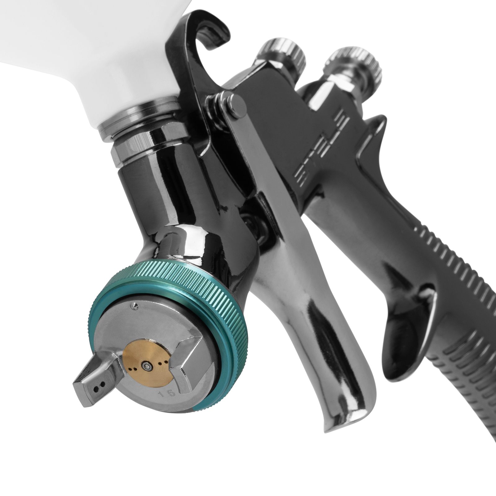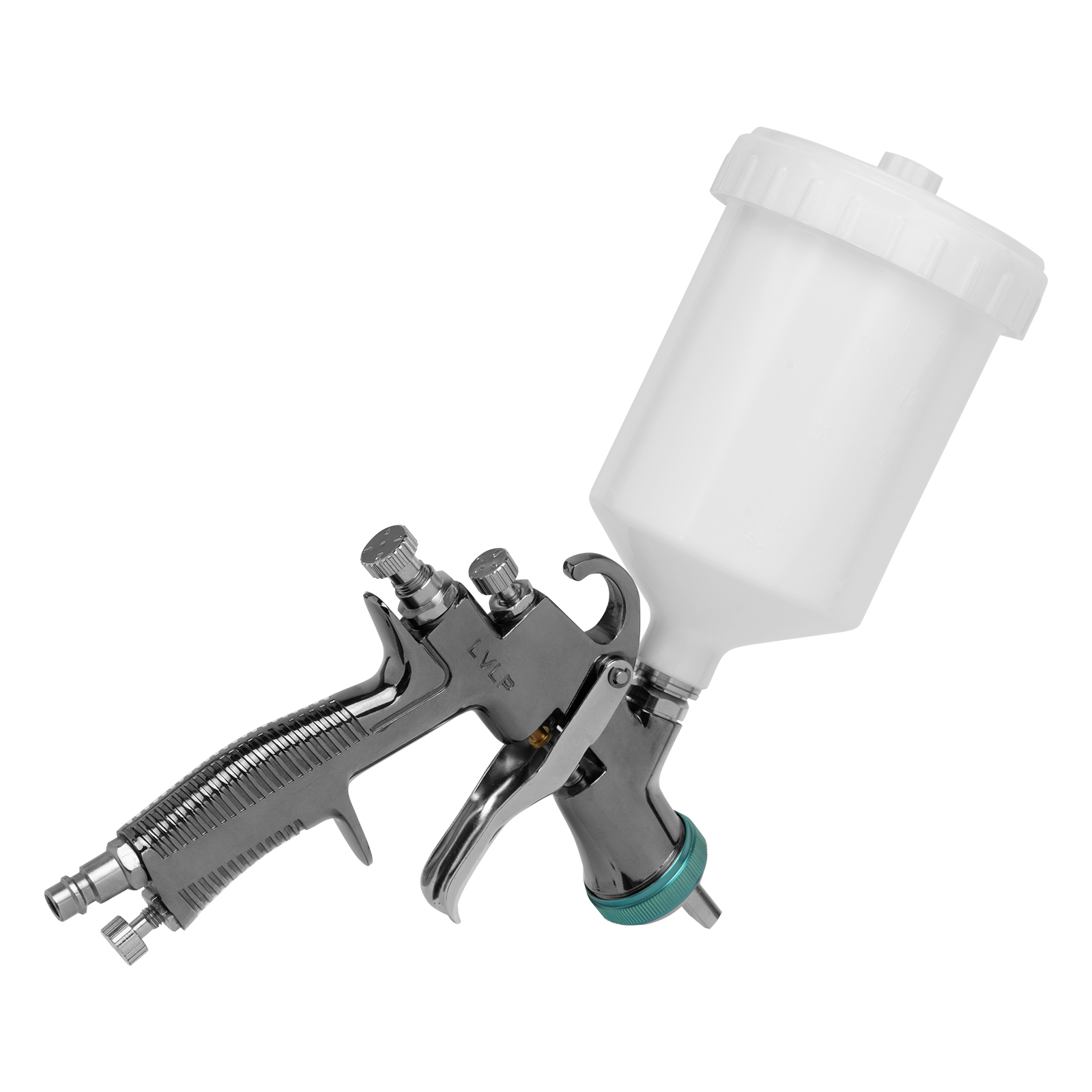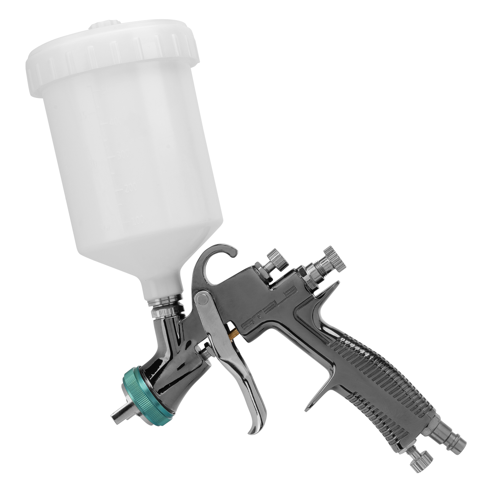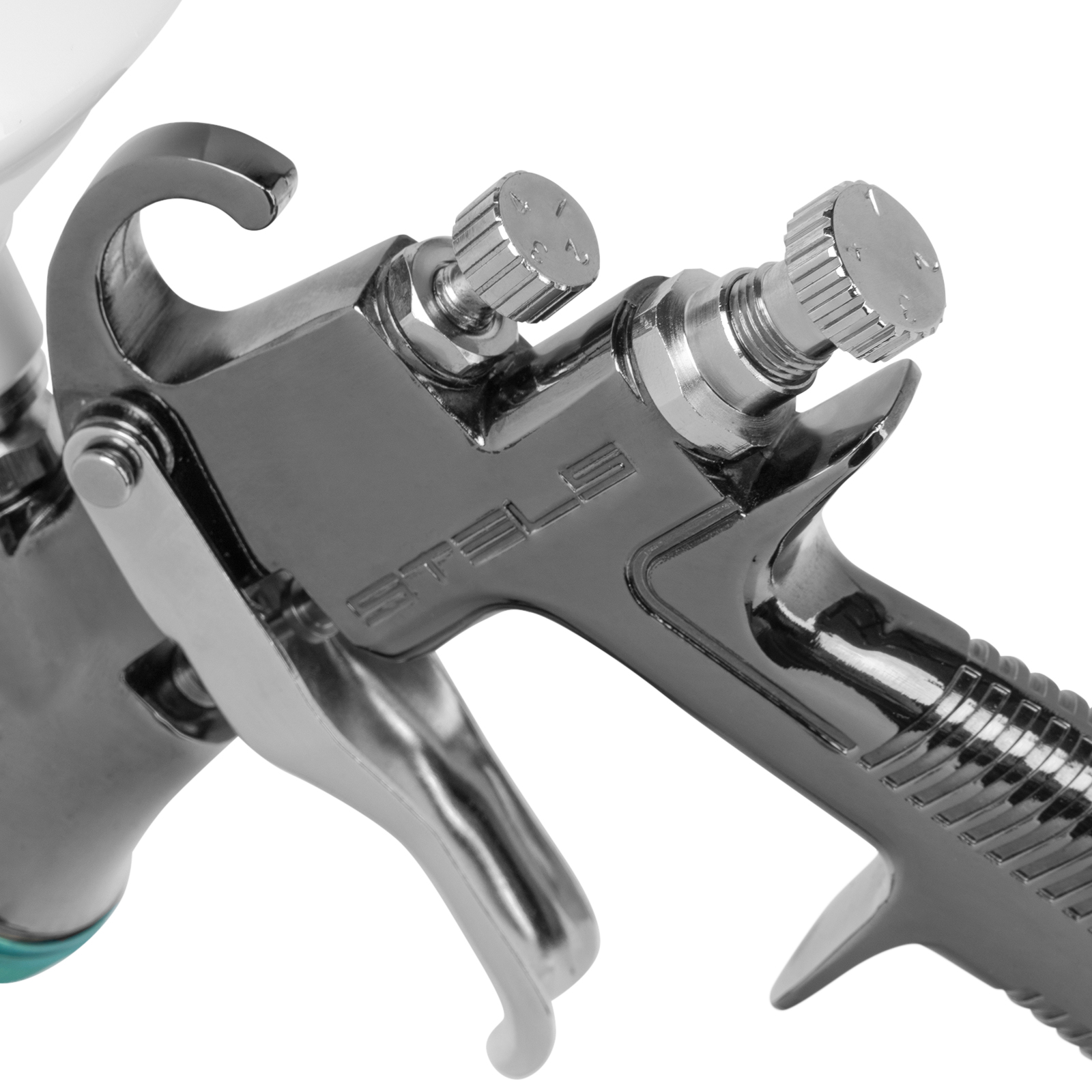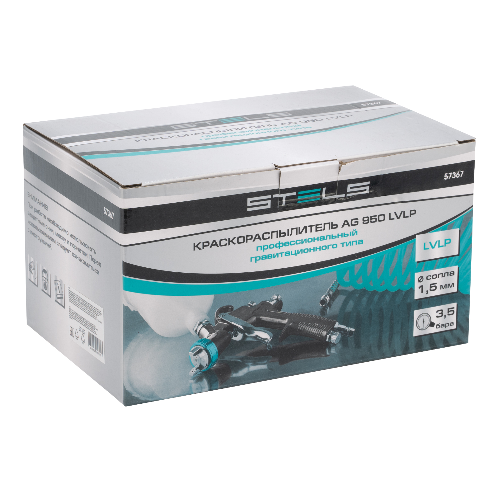 Профессиональный пневматический краскораспылитель гравитационного типа Stels AG 950 LVLP 57367 с соплом диаметром 1,5 мм подходит для проведения окрасочных работ, покрытия керамики глазурью, грунтовки стен, побелки потолков, лакирования дерева. Технология «Низкий объем, низкое давление» (Low Volume Low Pressure) позволяет уменьшить расход окрасочного материала до 140-190 мл/мин и добиться его 80-процентного переноса на обрабатываемую поверхность. Поэтому краскопульт отлично подойдет для применения как в быту, так и на производствах.ПреимуществаШирокий факел и точное распыление — устройство заполняет краской даже мелкие трещины и углубления на обрабатываемой поверхности, отлично справляется с окрашиванием внутренних частей радиаторов и работой в других труднодоступных местах.Прочность и долговечность — металлический корпус покрыт полированным хромом для защиты от механических воздействий.Бачок объемом 0,6 л для окрасочного материала — его наличие повышает мобильность краскопульта — мастеру не нужно подключать инструмент к дополнительным емкостям.Легкая подготовка — регуляторы давления воздуха, количества подаваемой краски и хода иглы с понятными насечками позволяют быстро настроить размер факела и добиться идеального результата.Удобный захват — фактурная рукоятка хорошо ложится в руку и повышает комфорт работы.Коннектор Rapid (Euro) — быстросъемное соединение позволяет подключить краскопульт к компрессору за несколько секунд, поэтому работать с ним сможет даже новичок.