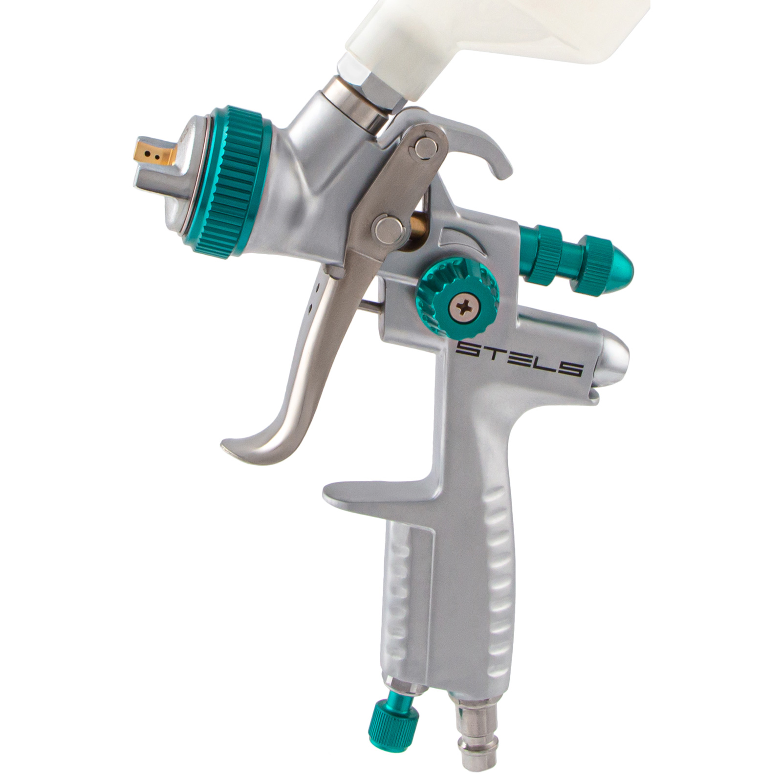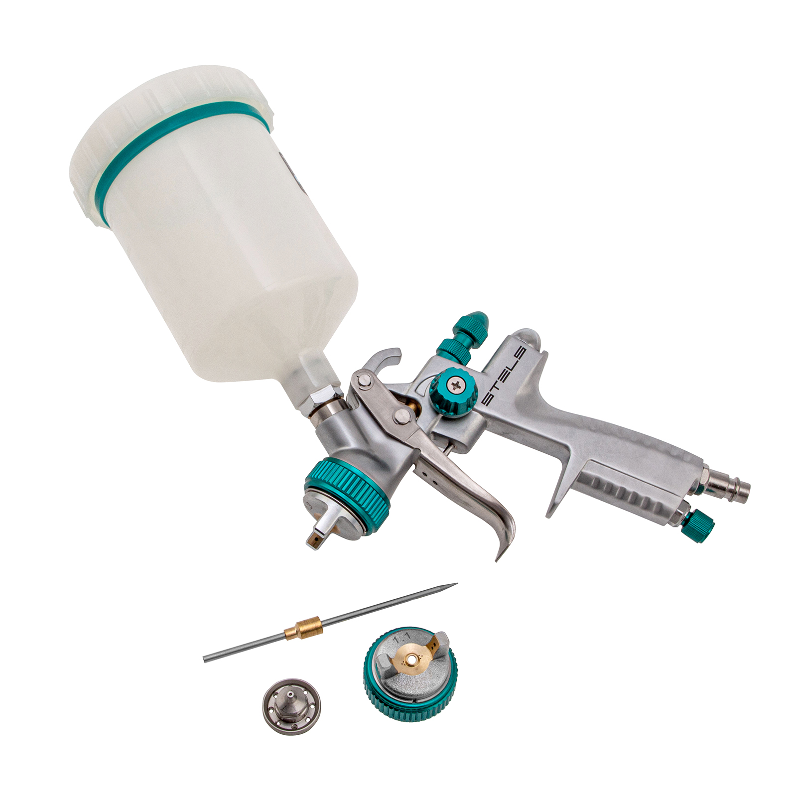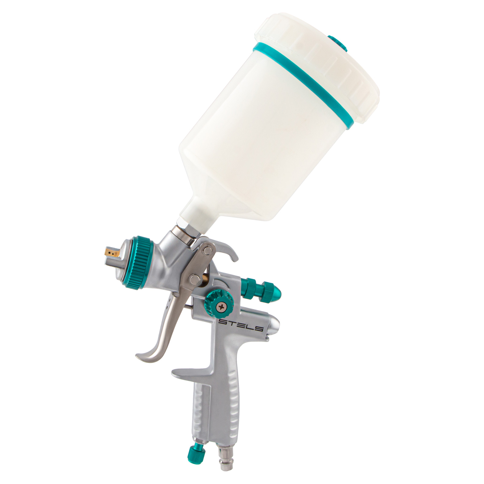 Краскораспылитель гравитационного типа Stels AG 901 LVMP 57365 с соплами диаметром 1,3 и 1,1 мм предназначен для профессионального окрашивания, нанесения эмали и лака на поверхности, грунтовки стен, побелки потолков, опрыскивания растений и т.д. Формирует мягкий широкий факел под давлением 2,5 бар и распыляет материалы равномерно, без образования подтеков.ПреимуществаВысокая производительность — технология LVMP (низкий объем, среднее давление) обеспечивает до 70% переноса окрасочного материала на рабочую зону.Мобильность — краскопульт оснащен пластиковым бачком для лакокрасочных материалов объемом 0,6 л, поэтому подключение к большой емкости не требуется.Экономичность — краскораспылитель расходует всего 165-220 мл/мин раствора благодаря усовершенствованной конструкции диффузной камеры.Высокое качество работы — при распылении лака или краски на обрабатываемой поверхности образуется тонкий слой без подтеков, что позволяет проводить многослойное окрашивание.Защитное покрытие — корпус хромирован для предотвращения образования коррозии и повышения механической прочности.Простое подключение — быстросъемный коннектор рапид облегчает соединение краскораспылителя с компрессором.Широкие возможности — система регулировки давления воздуха, подачи материала и формы факела помогает решать разные задачи при помощи одного инструмента.Необходимые аксессуары в комплекте — краскопульт поставляется с дюзовым набором диаметром 1,3 мм, ершиком для очистки и универсальным ключом.