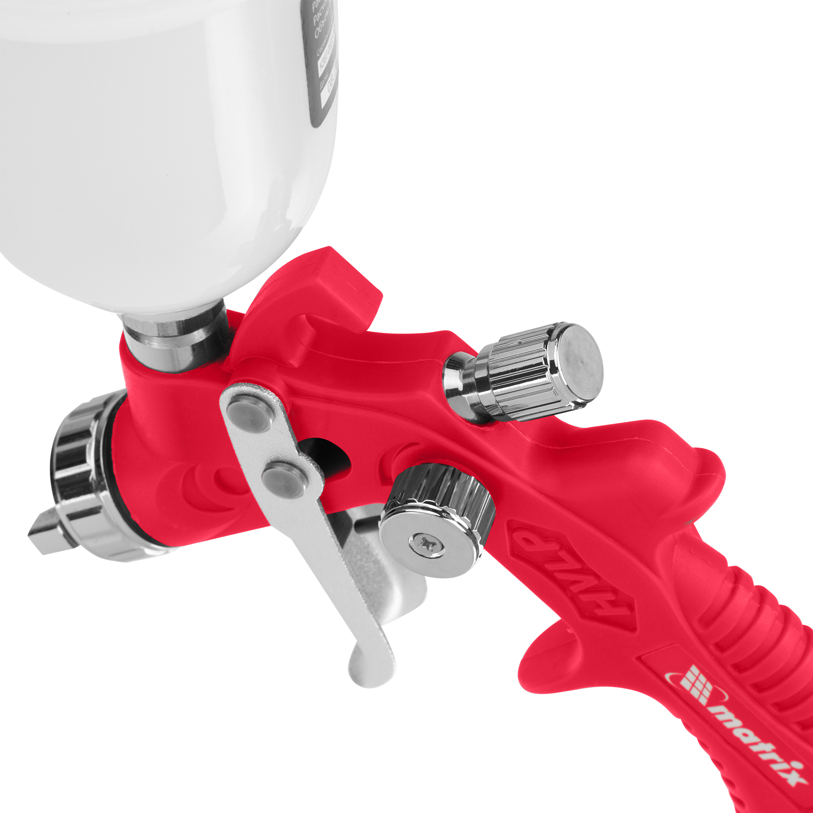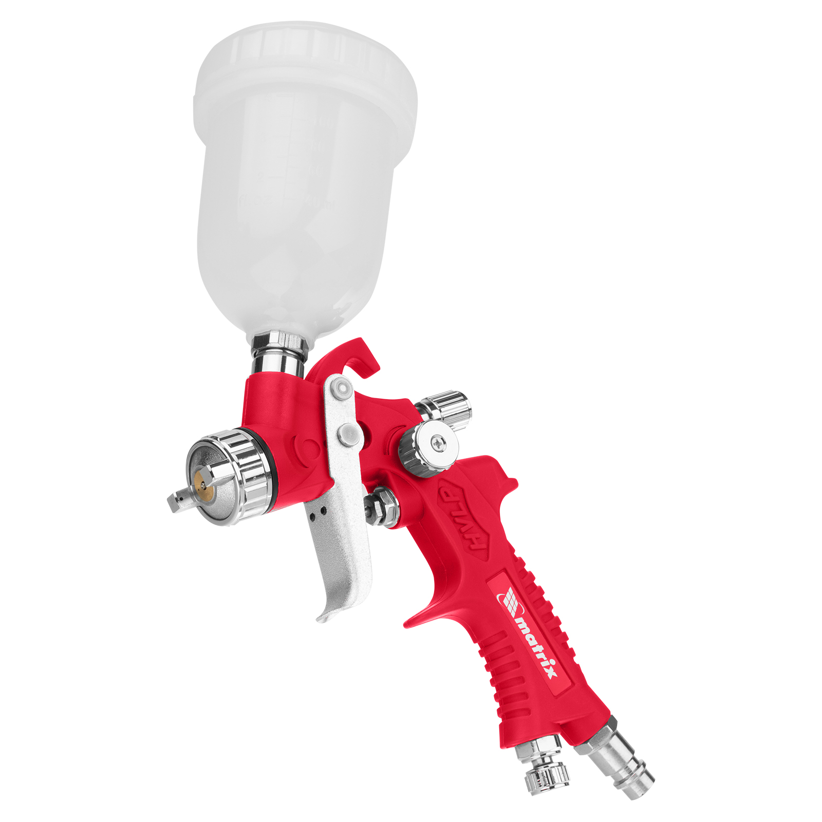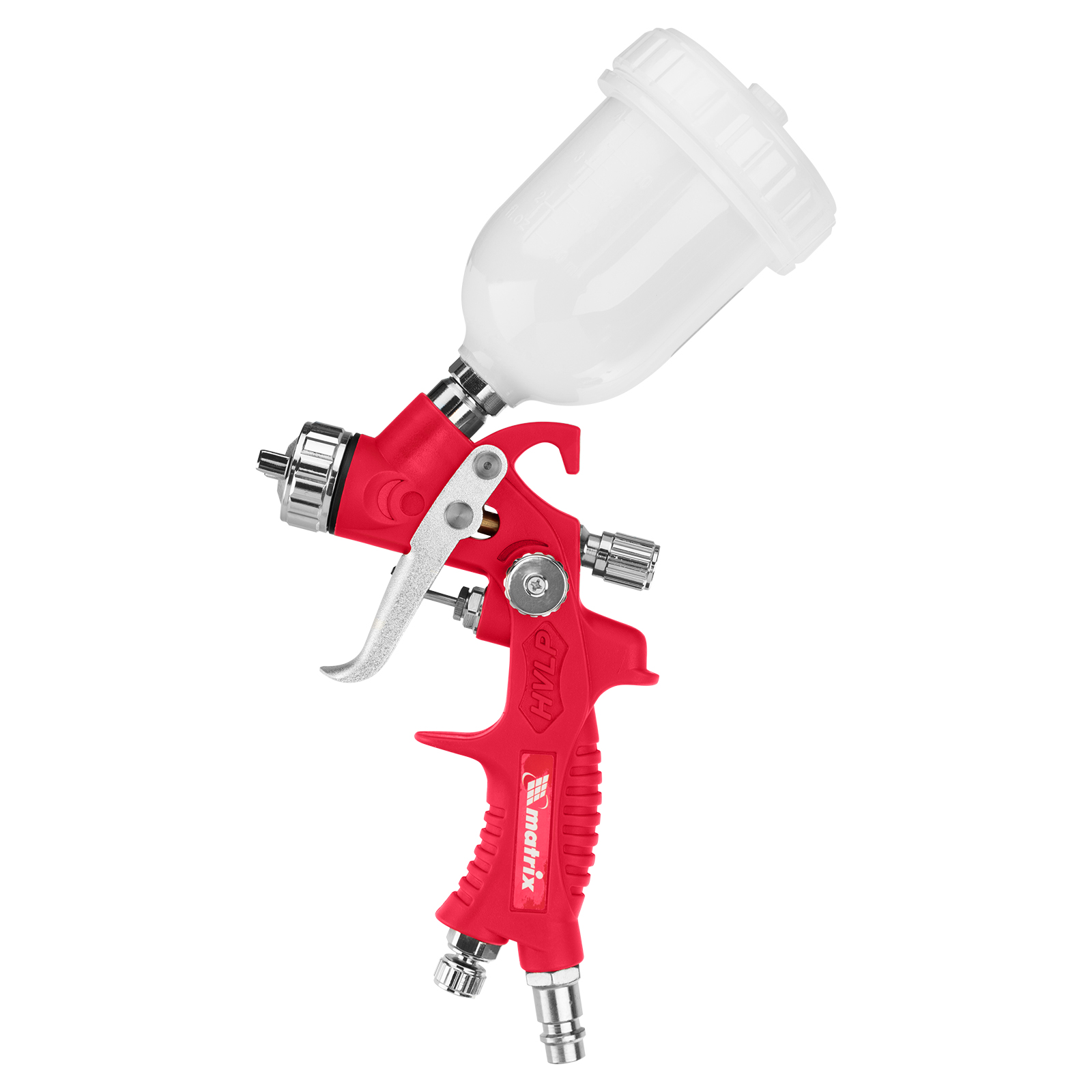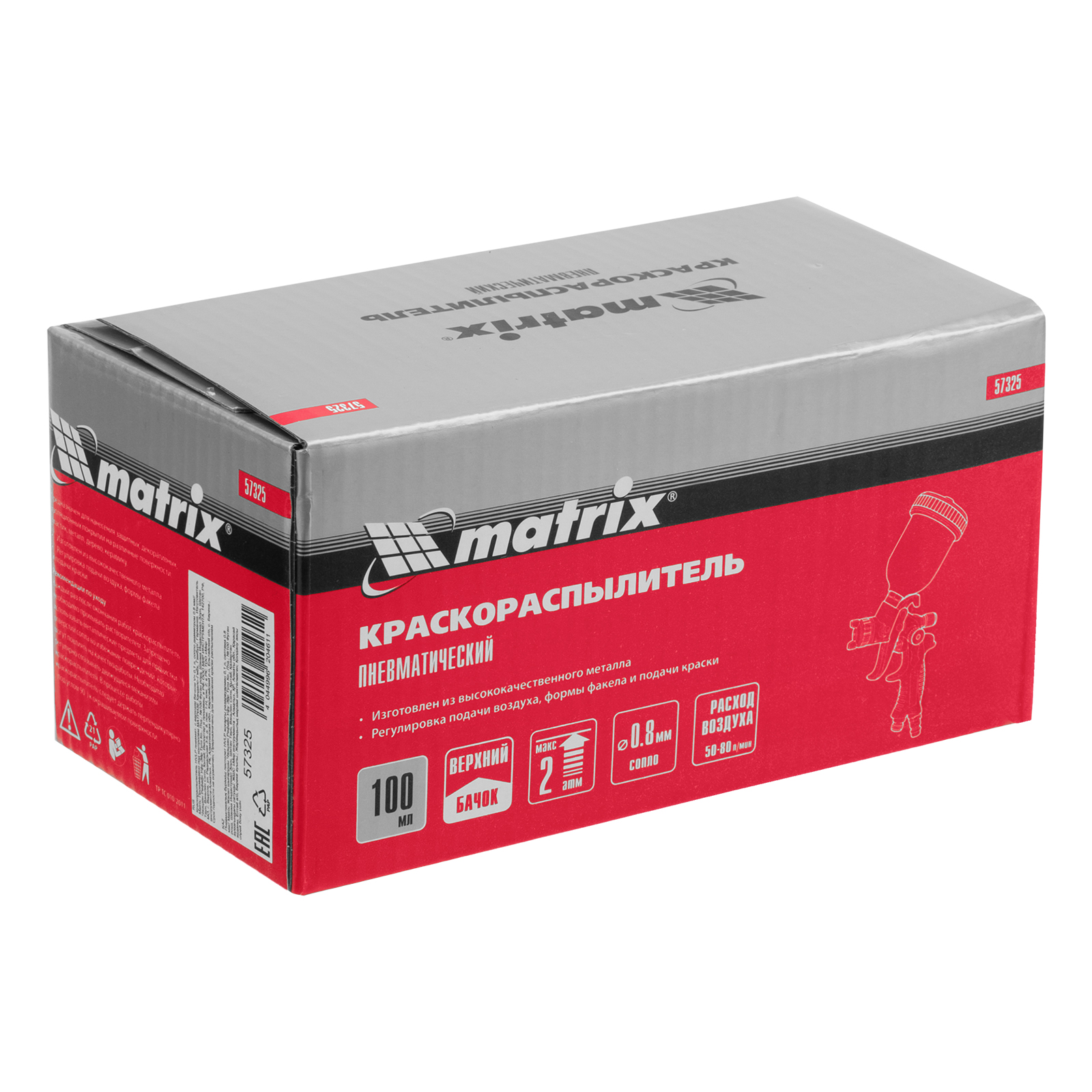 Пневматический краскораспылитель HVLP Matrix 57325 с верхним бачком объемом 0,1 л и соплом диаметром 0,8 мм расходует 50-140 литров в минуту и используется для равномерного нанесения лакокрасочных материалов, пропиток, грунтовок и других растворов. Подходит для обработки небольших участков. Распыление по технологии HVLP (High Volume Low Pressure, высокий объем, низкое давление) обеспечивает качественное нанесение покрытия. Краскораспылитель пригодится во время отделочных, ремонтных работ, а также обслуживания автомобилей.Преимущества Эффективное решение различных задач — регулировка расхода воздуха, подачи краски и формы факела позволяют установить оптимальный режим работы. Верхнее расположение бака — краскопульт удобно заправлять, лакокрасочный материал расходуется полностью. Прочность — полиамидный корпус пистолета устойчив к механическим повреждениям. Коррозионная стойкость — элементы, контактирующие с краской, изготовлены из латуни и высококачественной стали. Эргономичность — облегченная конструкция со сбалансированным центром тяжести удобна для продолжительной работы.