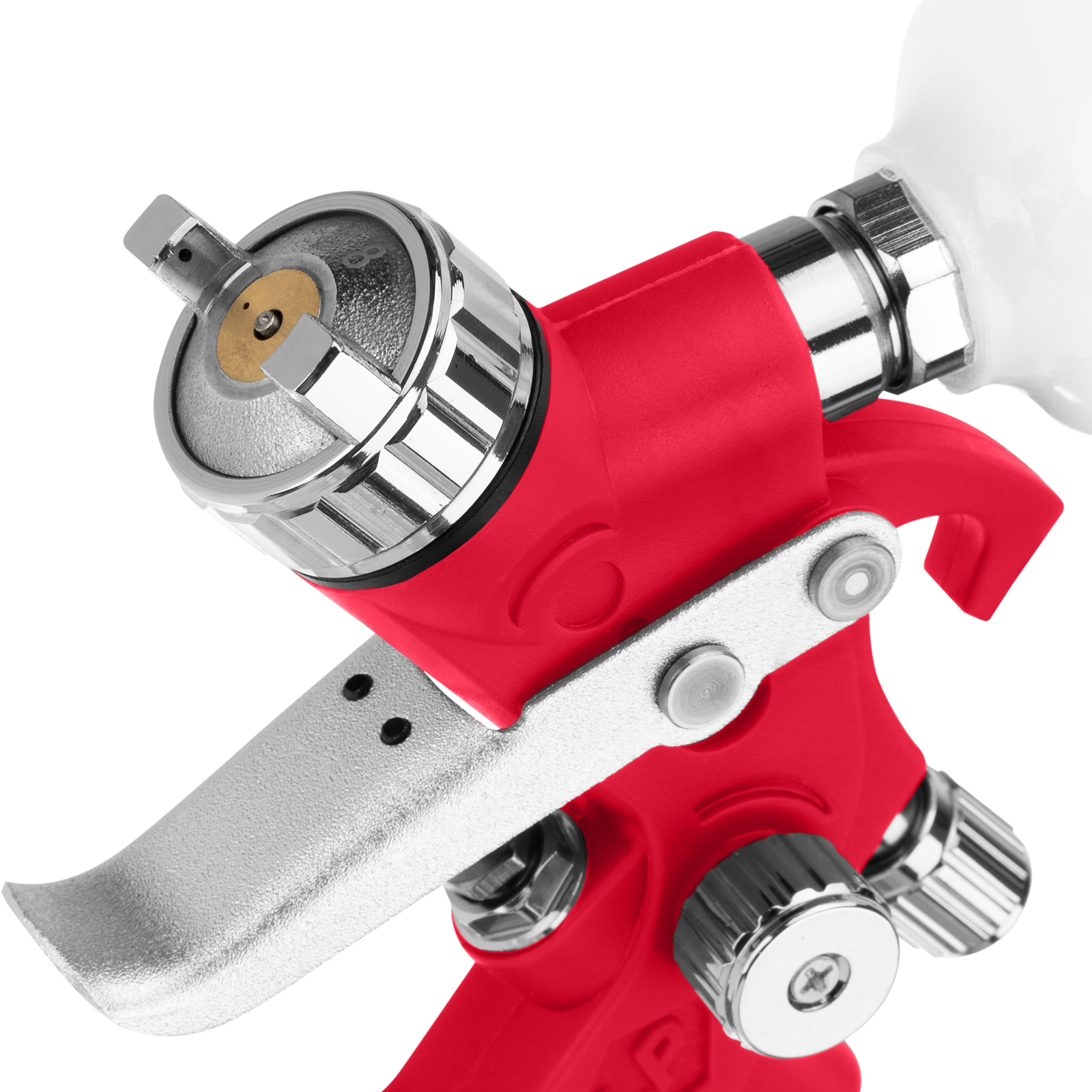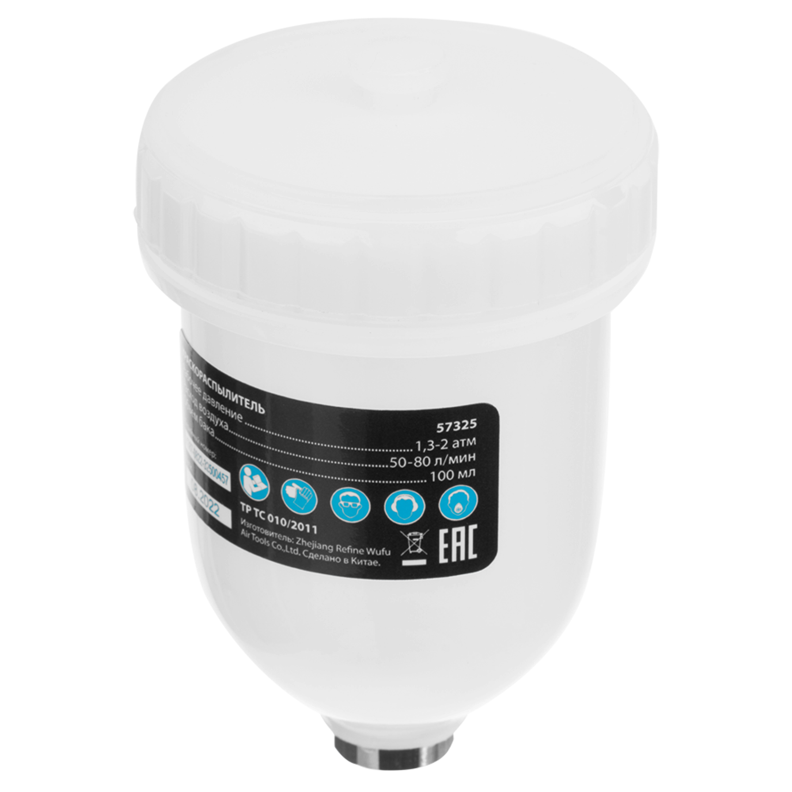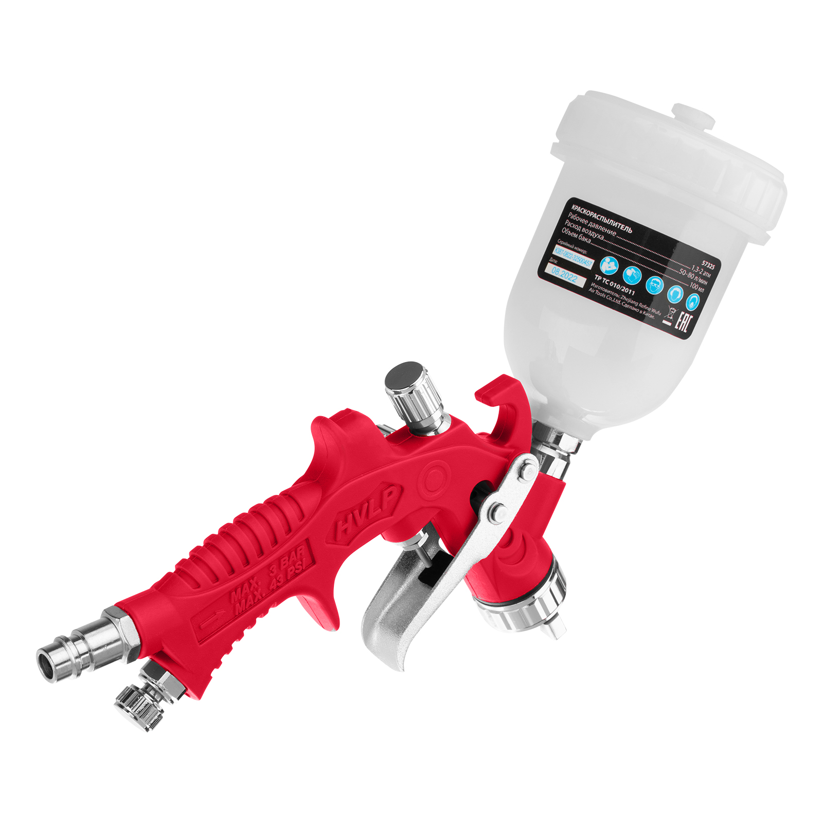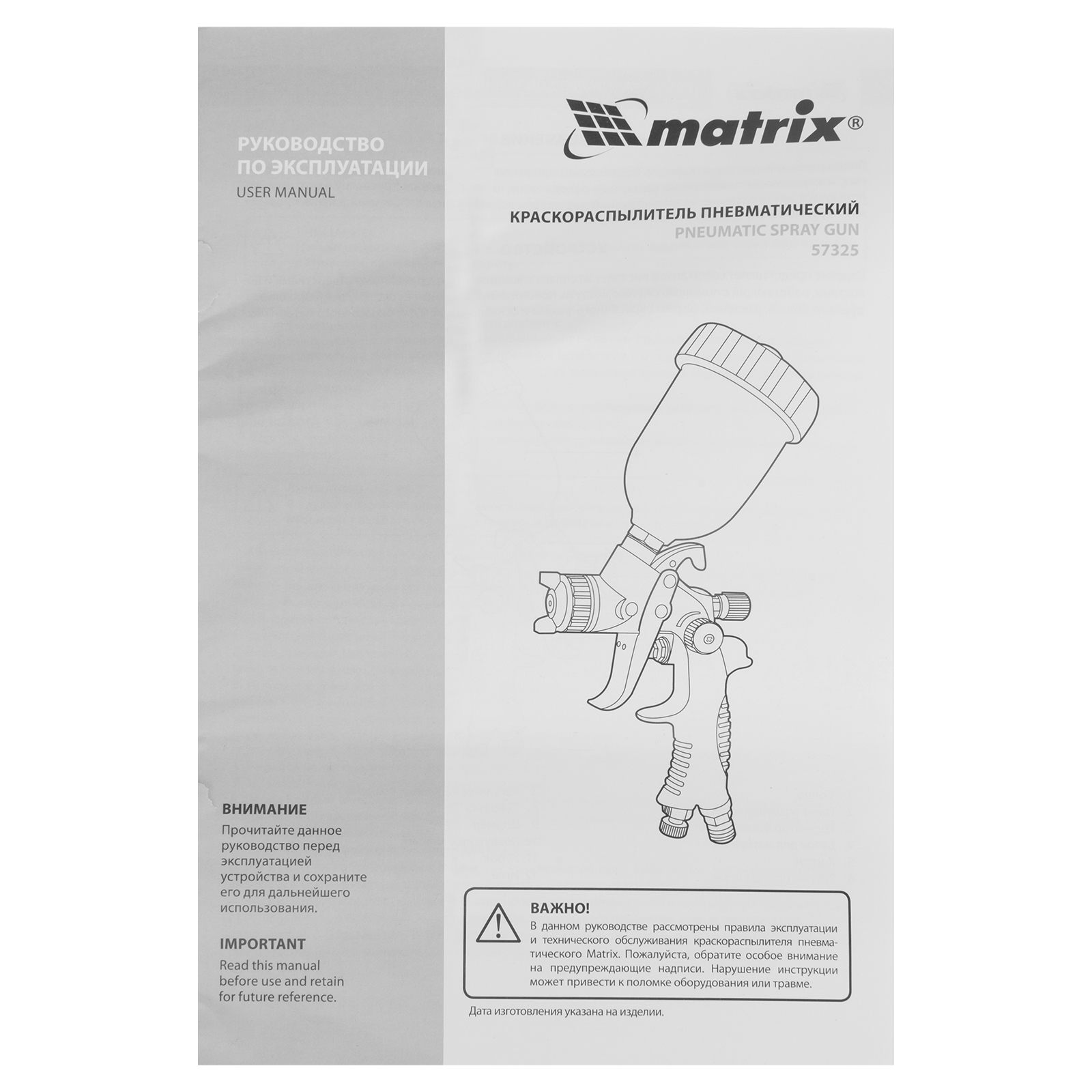 Пневматический краскораспылитель HVLP Matrix 57325 с верхним бачком объемом 0,1 л и соплом диаметром 0,8 мм расходует 50-140 литров в минуту и используется для равномерного нанесения лакокрасочных материалов, пропиток, грунтовок и других растворов. Подходит для обработки небольших участков. Распыление по технологии HVLP (High Volume Low Pressure, высокий объем, низкое давление) обеспечивает качественное нанесение покрытия. Краскораспылитель пригодится во время отделочных, ремонтных работ, а также обслуживания автомобилей.Преимущества Эффективное решение различных задач — регулировка расхода воздуха, подачи краски и формы факела позволяют установить оптимальный режим работы. Верхнее расположение бака — краскопульт удобно заправлять, лакокрасочный материал расходуется полностью. Прочность — полиамидный корпус пистолета устойчив к механическим повреждениям. Коррозионная стойкость — элементы, контактирующие с краской, изготовлены из латуни и высококачественной стали. Эргономичность — облегченная конструкция со сбалансированным центром тяжести удобна для продолжительной работы.