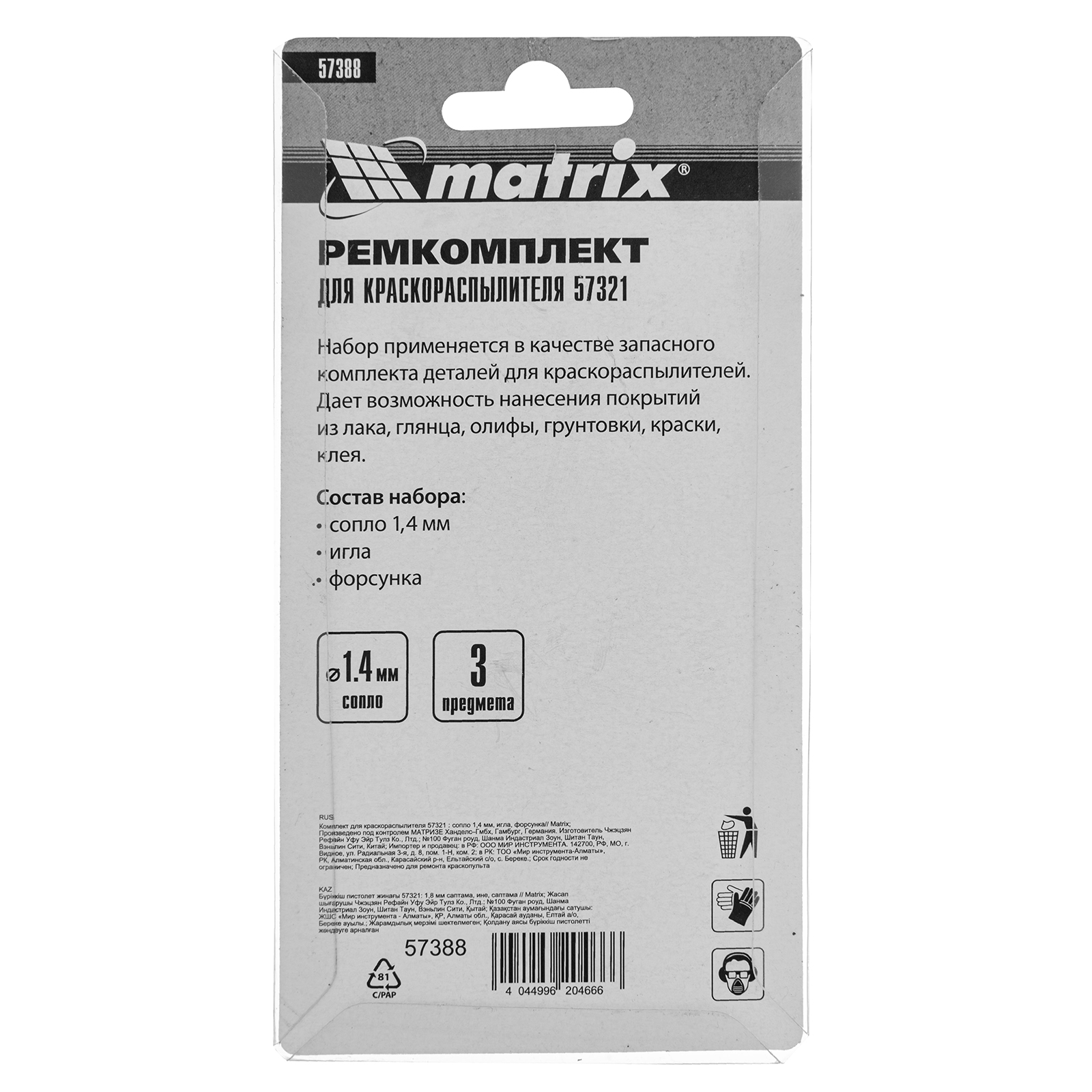 Комплект Matrix 57388 для краскораспылителя Matrix 57321 включает в себя 3 предмета: сопло диаметром 1,4 мм, иглу и форсунку. Их можно использовать для ремонта инструмента или расширения его функциональных возможностей.ПреимуществаВсе предметы изготовлены из высококачественной стали и латуни, поэтому устойчивы к механическим повреждениям.Сопло диаметром 1,4 мм подходит для распыления лаков, олифы, грунтовки, клея и красок, в том числе глянцевых.Форсунка обеспечивает нанесение покрытия под высоким давлением (технология HP), что удобно для окрашивания участков большой площади.Игла мгновенно открывает и закрывает сопло, позволяя точно контролировать подачу лакокрасочного материала.