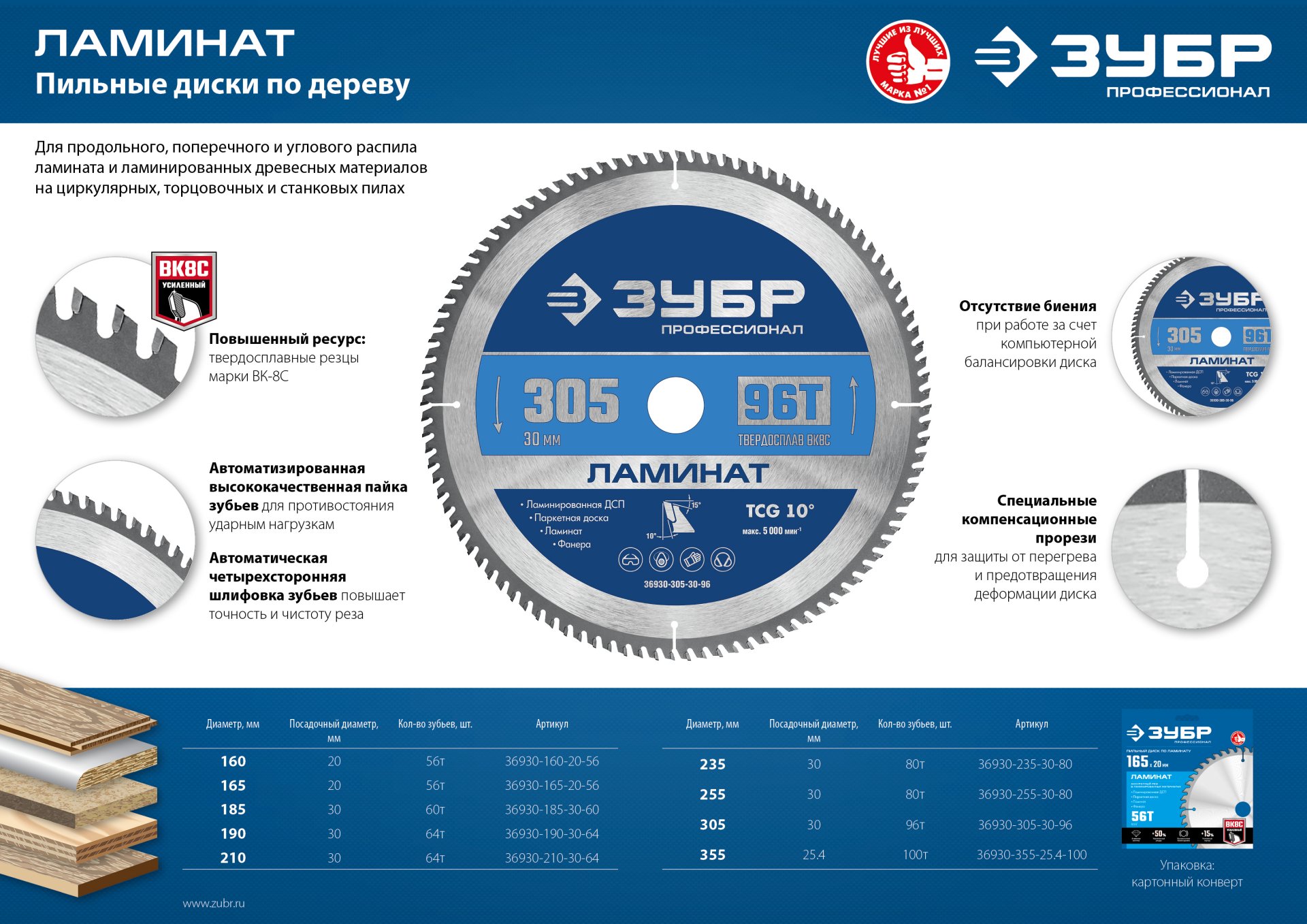 Для продольного, поперечного и углового распила ламината и ламинированных древесных материалов на циркулярных, торцовочных и станковых пилах.