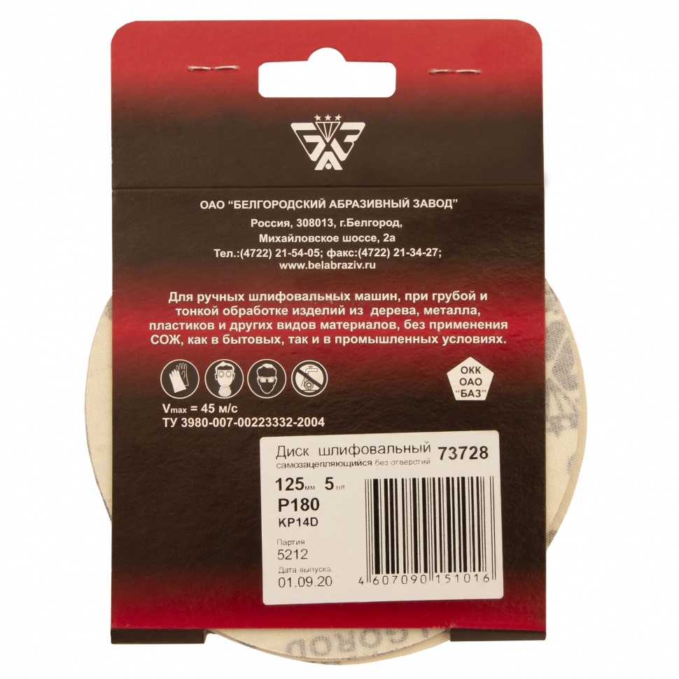 Шлифовальный диск под «липучку» БАЗ KP14D арт. 73728 предназначен для подготовки к покраске или промежуточного шлифования различных типов поверхностей: металла, древесины мягких и твердых пород, пластмассы. Он подходит для ручных шлифовальных машинок и дрелей, оснащенных опорной насадкой диаметром 125 мм. Мелкозернистый абразивный материал P180 с размером частиц 60-80 мкм обеспечивает эффективное устранение шероховатостей, доведение поверхности до желаемой гладкости и т.д.ПреимуществаАбразив из оксида алюминия отличается твердостью и долго не стачивается, поэтому справится с большим объемом работ.Увеличенная плотность ворсовой основы повышает износоустойчивость диска.Специальное пылеотталкивающее покрытие замедляет засаливание абразивного материала и продлевает срок его службы.Высокая производительность при обработке мягкой древесины — благодаря открытой насыпке абразивного зерна диск меньше забивается продуктами обработки.Диск прост в установке, поскольку мгновенно крепится на липучку опорной тарелки шлифмашинки (дрели с опорной тарелкой).Удобная комплектация — диски поставляются наборами по 5 штук.