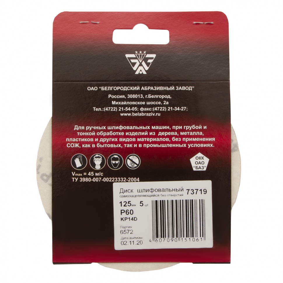 Шлифовальный диск под «липучку» БАЗ KP14D арт. 73719 предназначен для грубого выравнивания металла, древесины мягких и твердых пород, шпатлеванных, грунтованных и окрашенных поверхностей. Он подходит для ручных шлифовальных машинок и дрелей, оснащенных опорной насадкой диаметром 125 мм. Крупнозернистый абразивный материал P60 с размером частиц 250-315 мкм обеспечивает эффективное выполнение поставленных задач: снятие ржавчины, краски, лака, устранение сколов и т.д.ПреимуществаАбразив из оксида алюминия отличается твердостью и долго не стачивается, поэтому справится с большим объемом работ.Увеличенная плотность ворсовой основы повышает износоустойчивость диска.Специальное пылеотталкивающее покрытие замедляет засаливание абразивного материала и продлевает срок его службы.Высокая производительность при обработке мягкой древесины — благодаря открытой насыпке абразивного зерна диск меньше забивается продуктами обработки.Диск прост в установке, поскольку мгновенно крепится на липучку опорной тарелки шлифмашинки (дрели с опорной тарелкой).Удобная комплектация — диски поставляются наборами по 5 штук.