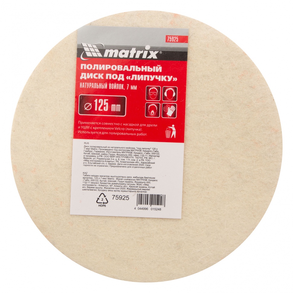 Полировальный диск под «липучку» Matrix 75925 размером 125 х 7 мм предназначен для тонких работ по металлу, стеклу, камню, пластмассе. Устанавливается на полировальную машину, углошлифовальную машинку или дрель, совместимую с опорной тарелкой (насадкой) диаметром 125 мм. Диск изготовлен из натурального войлока, оптимального для полировки материалов, сглаживания микротрещин, придания поверхности блеска, в том числе после обработки мелкозернистым абразивом. Преимущества Долговечность — круг из натурального войлока отличается прочностью, эластичностью и износостойкостью. Защита обрабатываемой поверхности от перегрева — натуральная шерсть эффективно рассеивает тепло. Надежное крепление — диск под «липучку» быстро устанавливается на опорную тарелку и надежно удерживается даже при вращении на высокой скорости. Высокое качество шлифовки — использование с полировочными пастами позволяет добиться максимального эффекта.