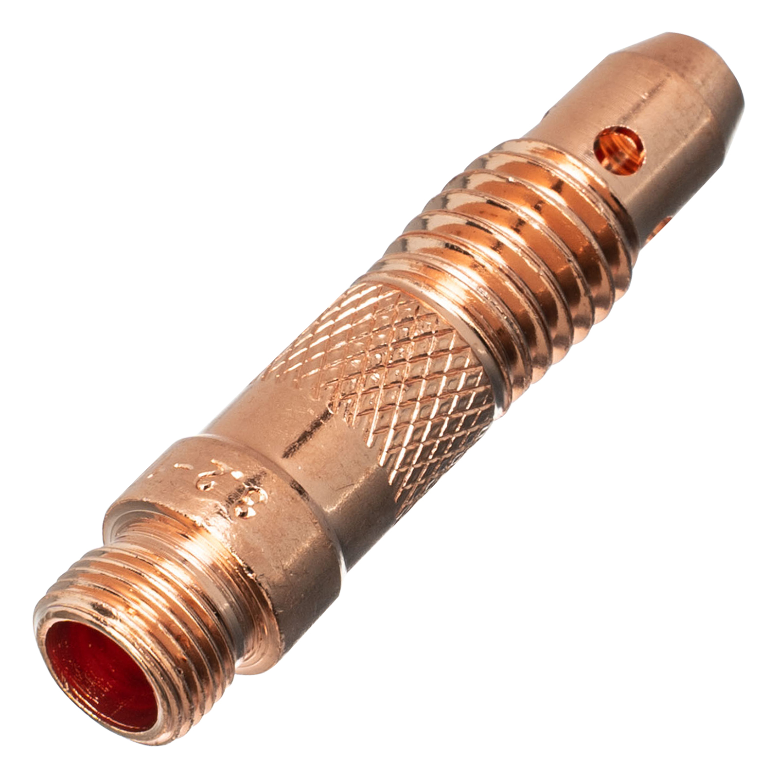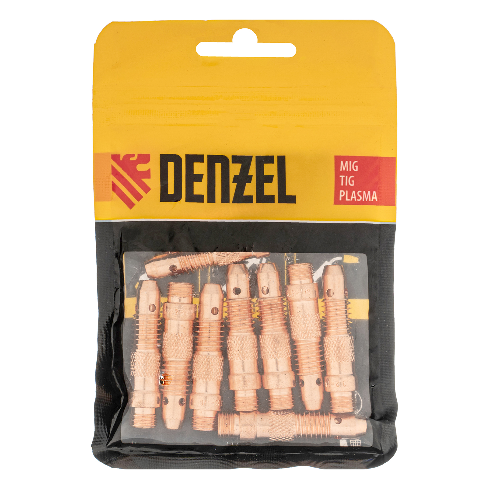 Держатель цанги Denzel 93655 входит в набор из 10 шт. и надежно фиксирует в сопле газовой горелки цангу с электродом диаметром 2, 2,4 и 3,2 мм. Используется для аргонодуговой сварки и совместим со сварочными горелками TIG 93643, 93644, а также может устанавливаться на модели других торговых марок с аналогичным посадочным разъемом. Преимущества Высокое качество сварки — отверстия в корпусе способствуют равномерному распределению защитного газа внутри сопла. Надежность и долговечность — изделие выполнено из электротехнической меди. Удобная комплектация — упаковки из 10 расходников хватит надолго.