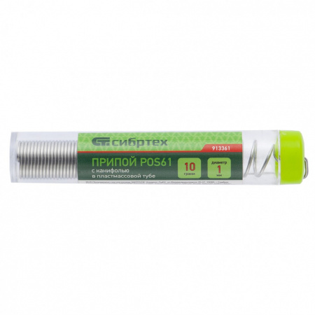 Припой с канифолью POS61 Сибртех 913361 диаметром 1 мм и весом 10 г, в пластмассовой тубе, — материал для пайки, в расплавленном состоянии соединяющий металлические детали. Содержит 39% свинца, 61% олова (Sn61% + Pb39%) и канифоль, не требует очистки припаиваемых поверхностей. Будет полезен для бытового ремонта радиоэлектронной аппаратуры.ПреимуществаФлюс в составе — его не требуется отдельно вносить на участок для пайки.Невысокая температура плавления 190 °C — можно не опасаться перегрева электронных компонентов.Удобное хранение и использование — припой выпускается в форме проволоки, скрученной в спираль и помещенной в пластмассовую тубу.