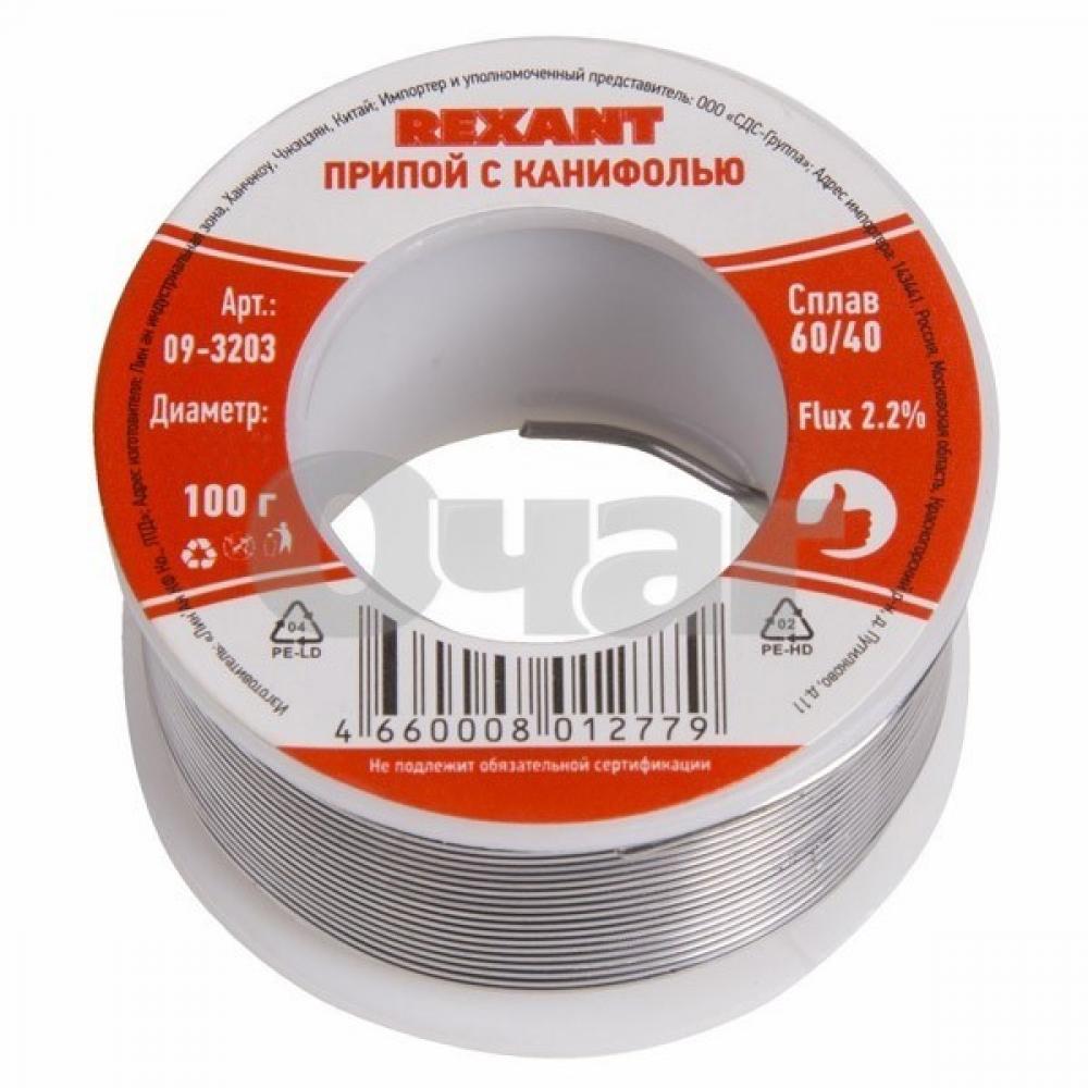 Припой с канифолью REXANT представляет собой проволоку (диаметром 1 мм) из сплава олова (60%) и свинца (40%). Используется в пайке для соединения деталей между собой и позволяет создать герметичный, механически прочный (устойчивый) шов. Нагреваясь до температуры плавления (183-188 С) припой: расплавляется, смачивает спаиваемый металл и, растекаясь по нему - заполняет место между соединяемыми деталями.
