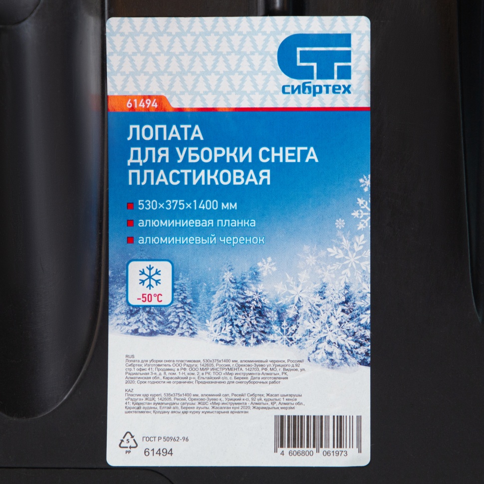 Пластиковая лопата Сибртех 61494 размером 530 х 375 х 1400 мм, с алюминиевым черенком, позволяет облегчить уборку снега. С ее помощью можно очистить дорожки в загородном доме, выезд из гаража и т.д. С облегченной лопатой 1,22 кг легко справятся женщины и подростки. А за счет длины 1400 мм с ней комфортно работать, т.к. снижается нагрузка на спину.ПреимуществаКовш выполнен из ударопрочного полипропилена, который выдерживает морозы до -50 °С.Кромка ковша оснащена защитной накладкой из алюминиевого сплава, благодаря чему он защищен от повреждений и износа, а также справляется с очисткой слежавшегося снега и наста.Дополнительные ребра жесткости повышают устойчивость ковша к нагрузкам.Высокую эффективность и скорость работы обеспечивает углубленный ковш, вмещающий большое количество снега.Рабочая часть оснащена высокими бортиками, поэтому снег не вываливается во время работы.Черенок изготовлен алюминия и оснащен дополнительной рукояткой для комфортной работы.