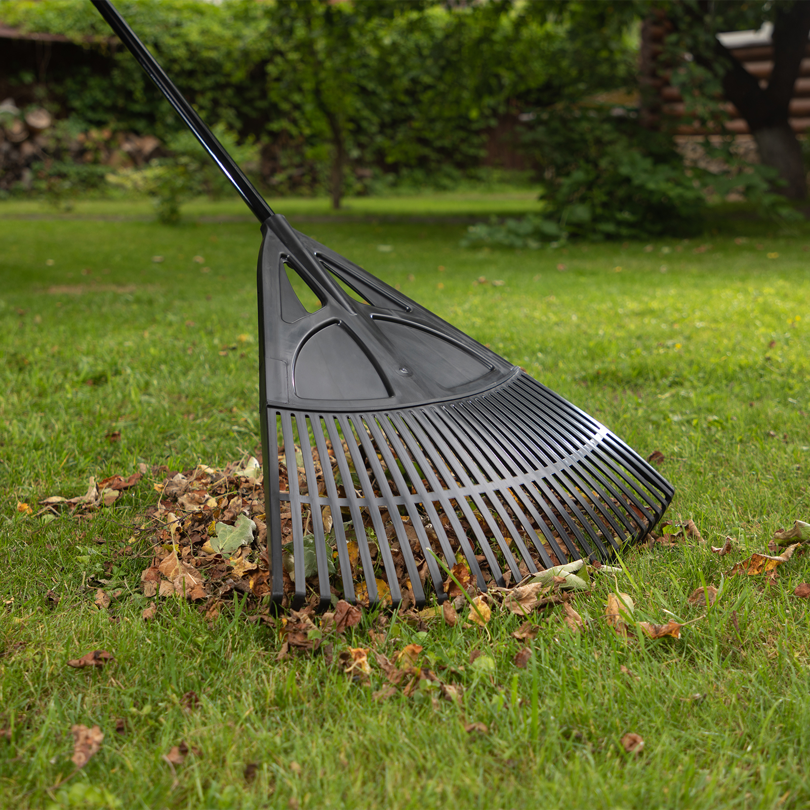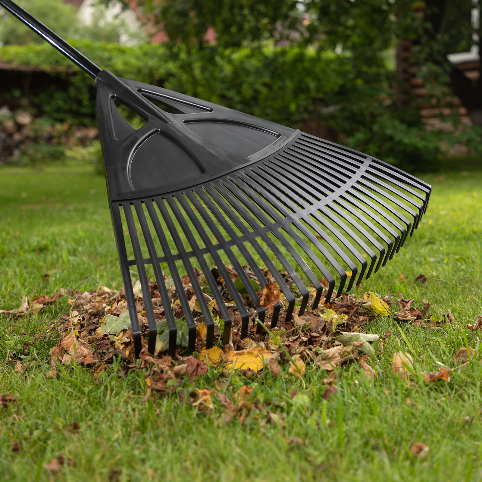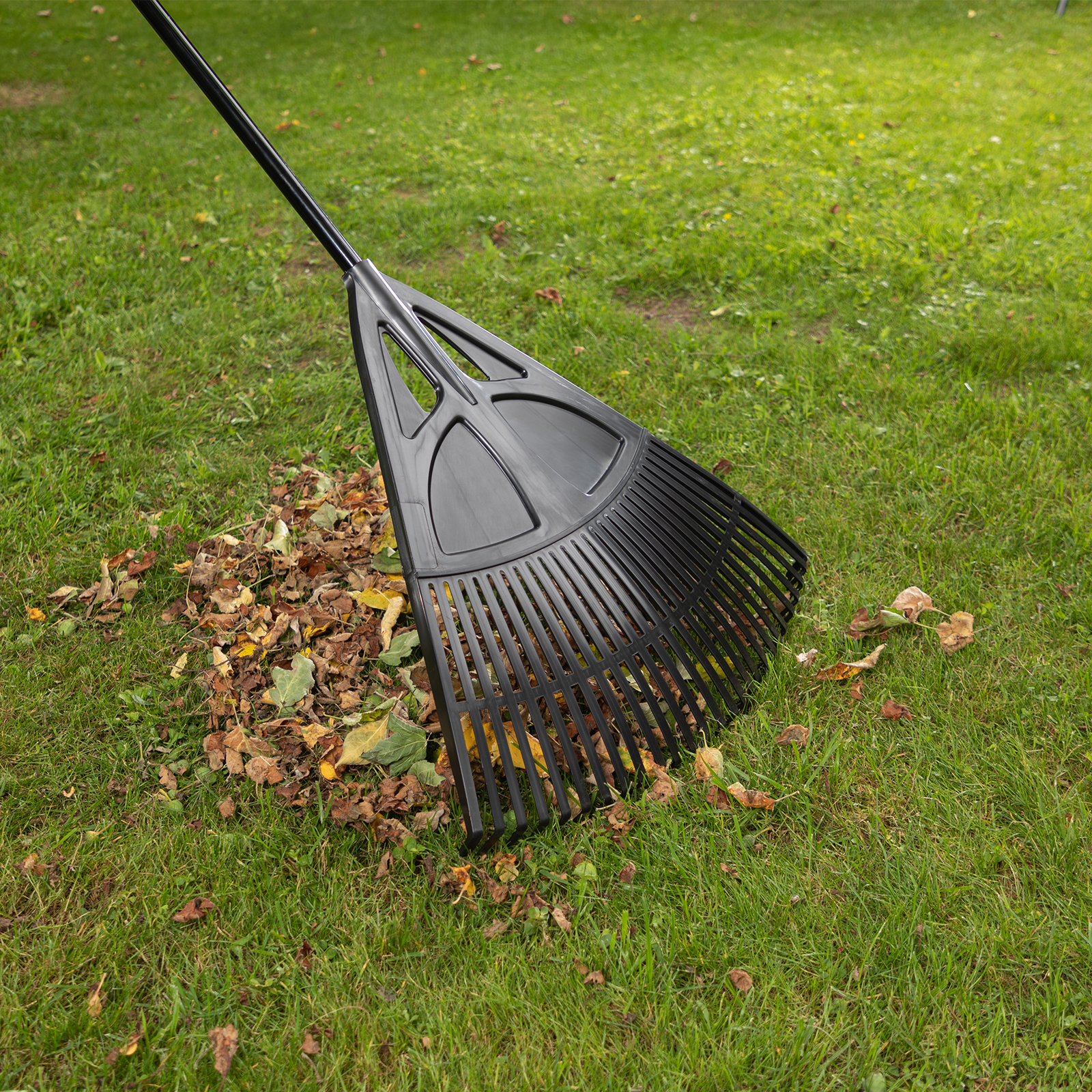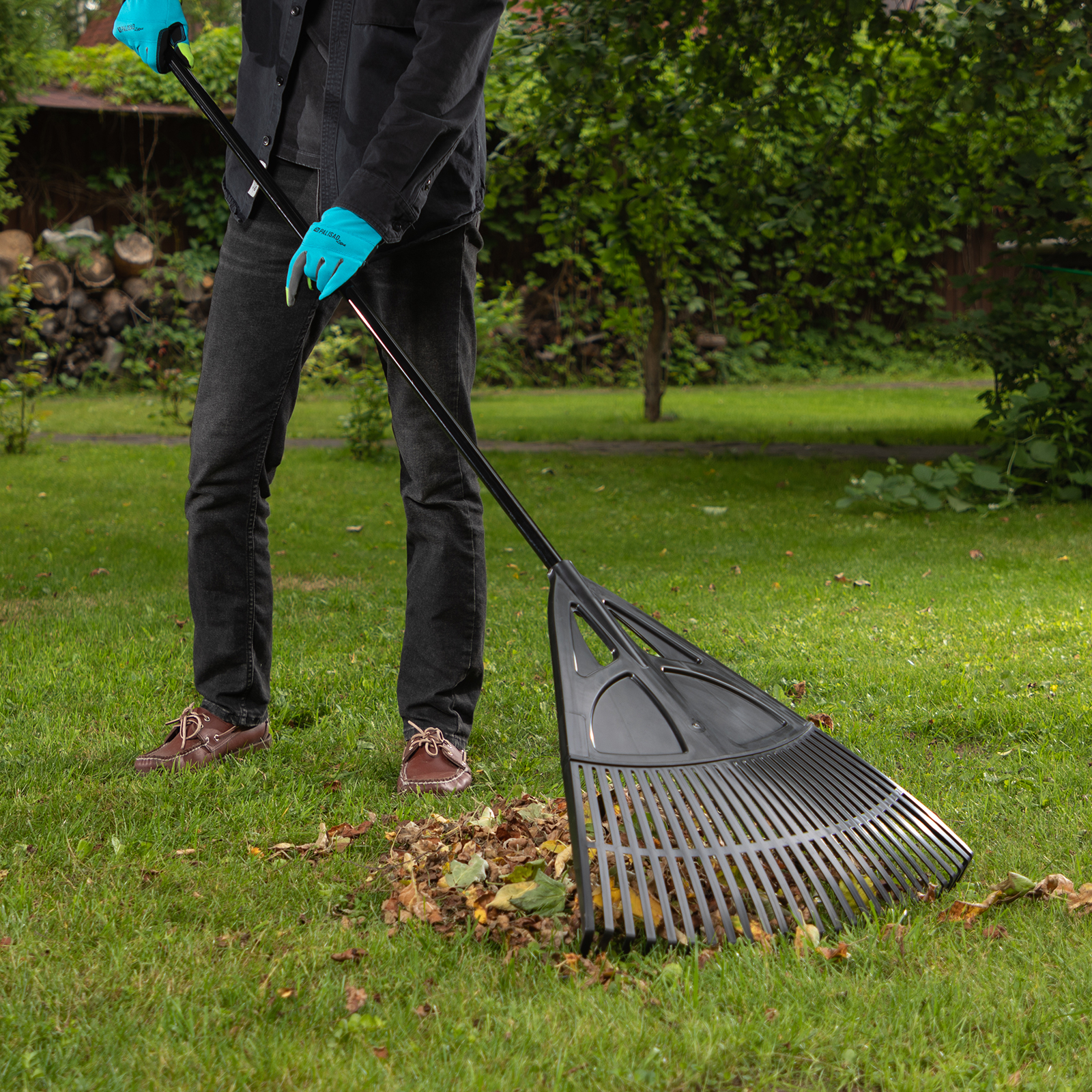 Грабли веерные пластиковые Palisad 61806 с 27 плоскими зубьями и шириной рабочей части 620 мм, с алюминиевым черенком, - садовый инвентарь, предназначенный для уборки мелкого мусора и листьев с газонов и грядок. Плоские зубья эффективно очищают территорию, не повреждая растительность. Грабли поставляются в сборе с черенком.ПреимуществаРабочая часть шириной 620 мм обеспечивает максимальный охват участка, что сокращает время уборки.Грабли изготовлены из эластичного и стойкого к ультрафиолету полипропилена, поэтому прослужат долго.На основании имеются ребра жесткости, повышающие прочность инструмента.Зубья дополнены распоркой для надежной защиты от поломок.