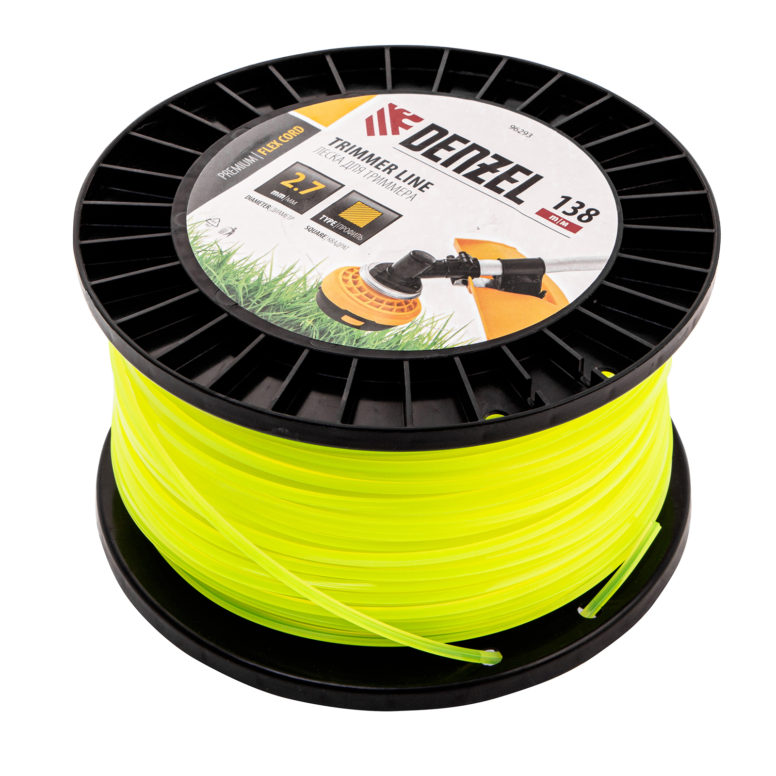 Леска для триммера Denzel FLEX CORD 96293 с сечением «квадрат», толщиной 2,7 мм и длиной 138 м, на DIN-катушке, предназначена для скашивания крупностеблевой растительности. Заправляется в катушку бензотриммеров с объемом двигателя 25-52 см3 и электротриммеров мощностью от 1 до 1,5 кВт.ПреимуществаНадежность — квадратное сечение и толщина корда увеличивают устойчивость корда к излому.Прочность — леска изготовлена из полиамида РА6 с добавлением полиамида BASF.Высокая производительность — благодаря острым граням леска быстро срезает траву.Длина 138 м — корда хватит для выполнения большого объема работ.Удобное хранение и транспортировка — концы лески можно закрепить в отверстиях DIN-катушки.