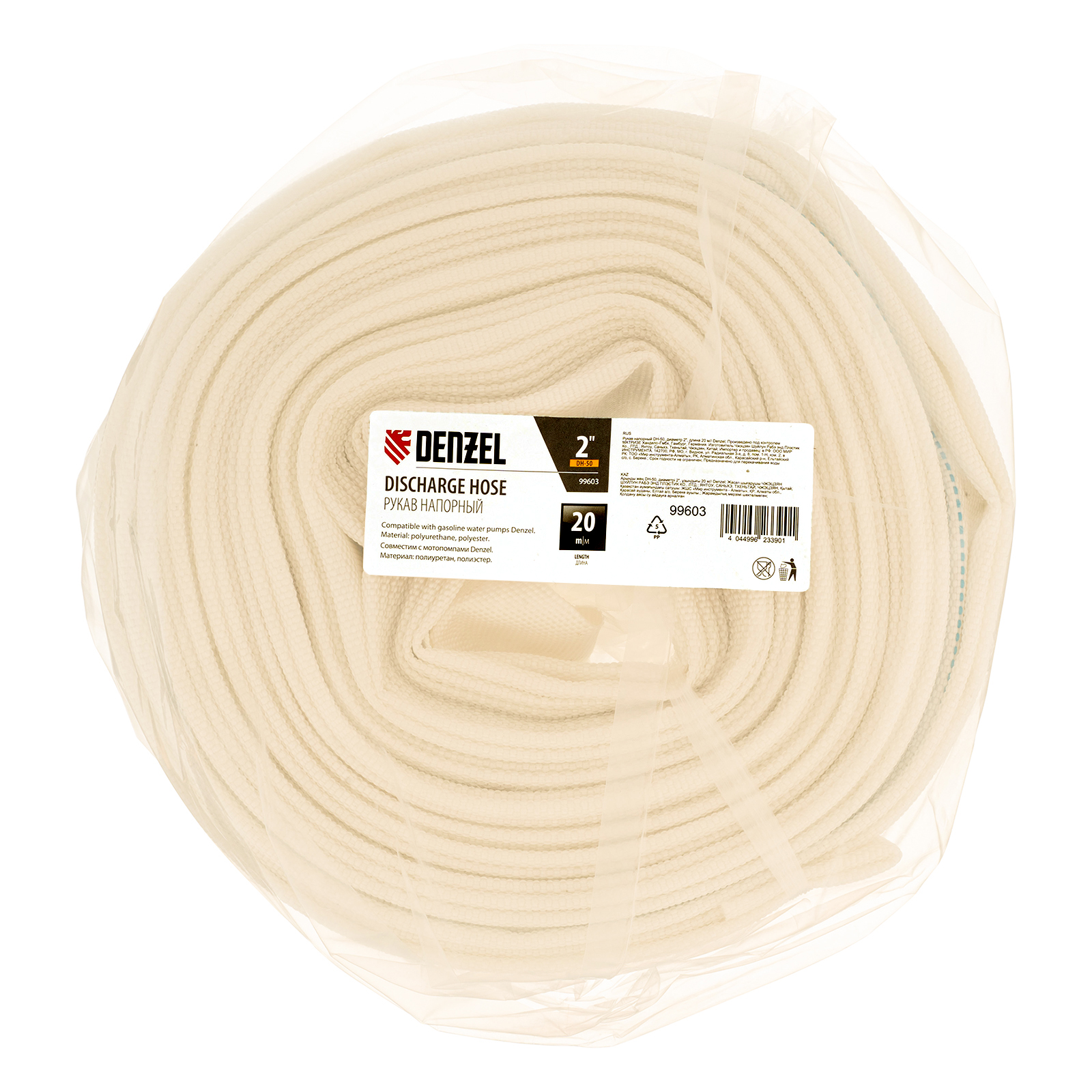 Напорный рукав Denzel DH-50 99603 диаметром 2"" и длиной 20 м выдерживает рабочее давление 1 МПа и предназначен для подачи воды от мотопомпы к месту водоразбора или тушения пожара. Совместим с мотопомпами Denzel 99201 и 99203.ПреимуществаНадежность — рукав отличается устойчивостью к перепадам температур и ультрафиолетовому излучению.Стойкость к разрыву — 2-слойная структура обеспечивает эластичность, гибкость и герметичность.Компактность и малый вес — рукав удобен в хранении и транспортировке.