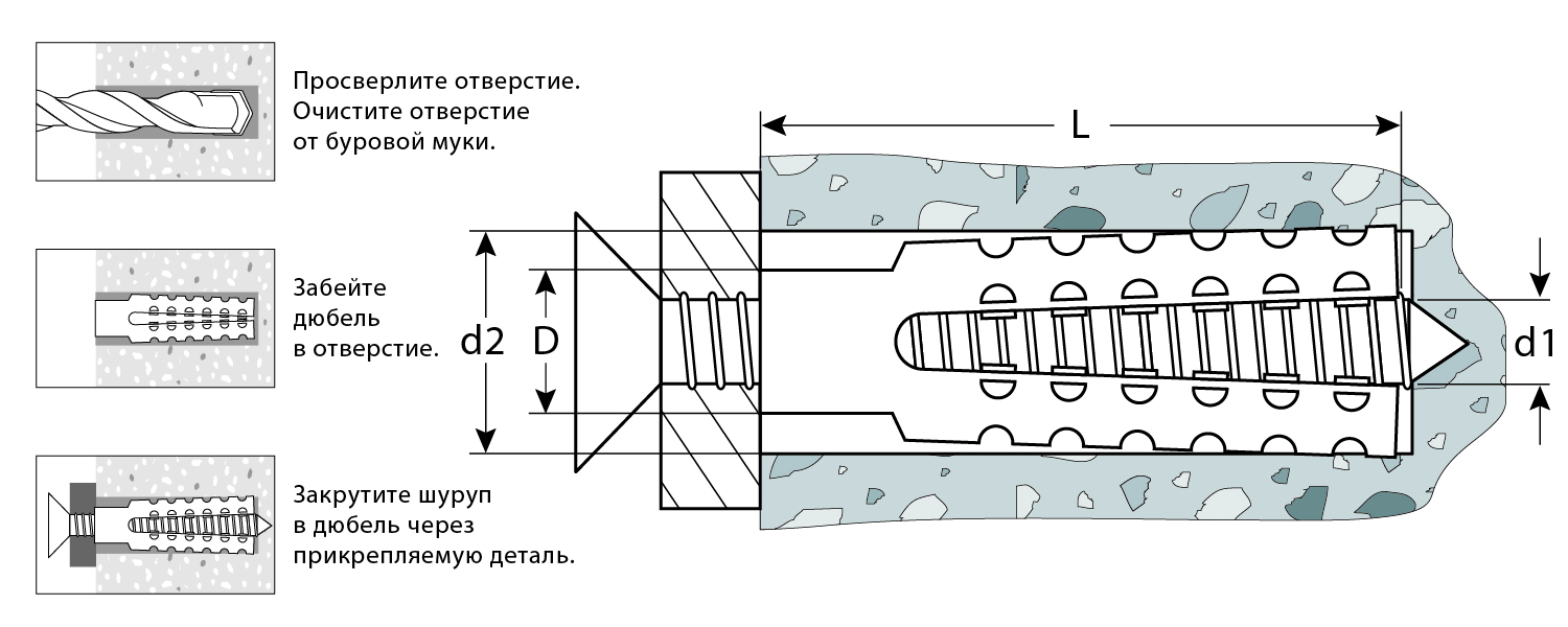 - Простота установки - дюбель вставляется в предварительно просверленное отверстие и расклинивается при вкручивании шурупа