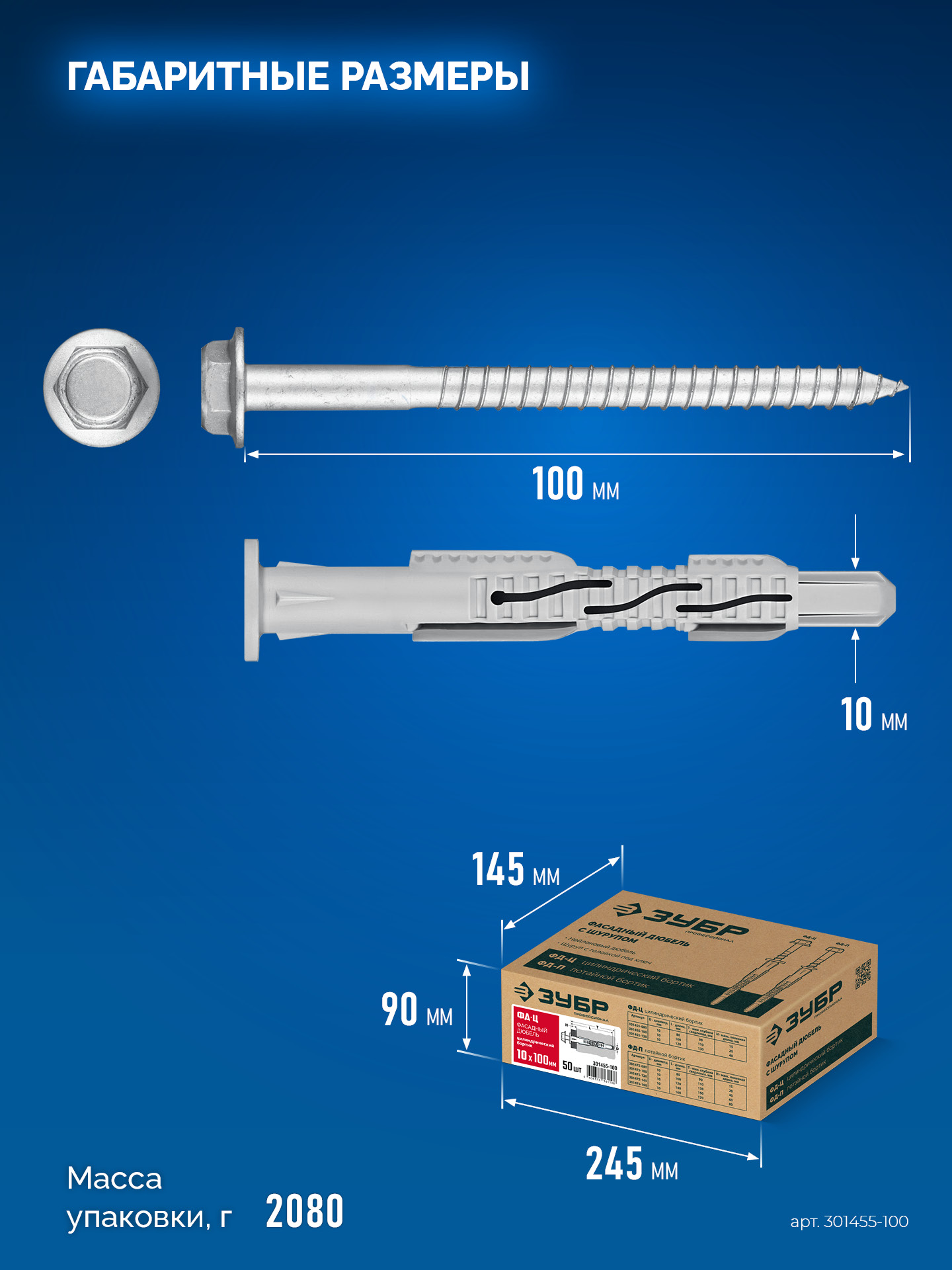 —ЗУБР ФД-Ц 10x 100 мм, фасадный дюбель, нейлон/цинк, 50 шт (301455-100)