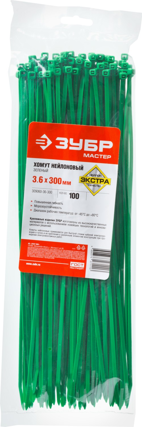 —ЗУБР КС-З1, 3.6 x 300 мм, нейлон РА66, 100 шт, зеленые, кабельные стяжки, Профессионал (309060-36-300)