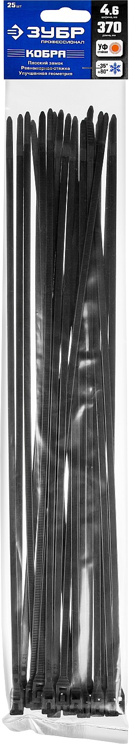 —ЗУБР КОБРА, 4.6 x 370 мм, нейлон РА66, 25 шт, черные, кабельные стяжки с плоским замком, Профессионал (30935-46-370)