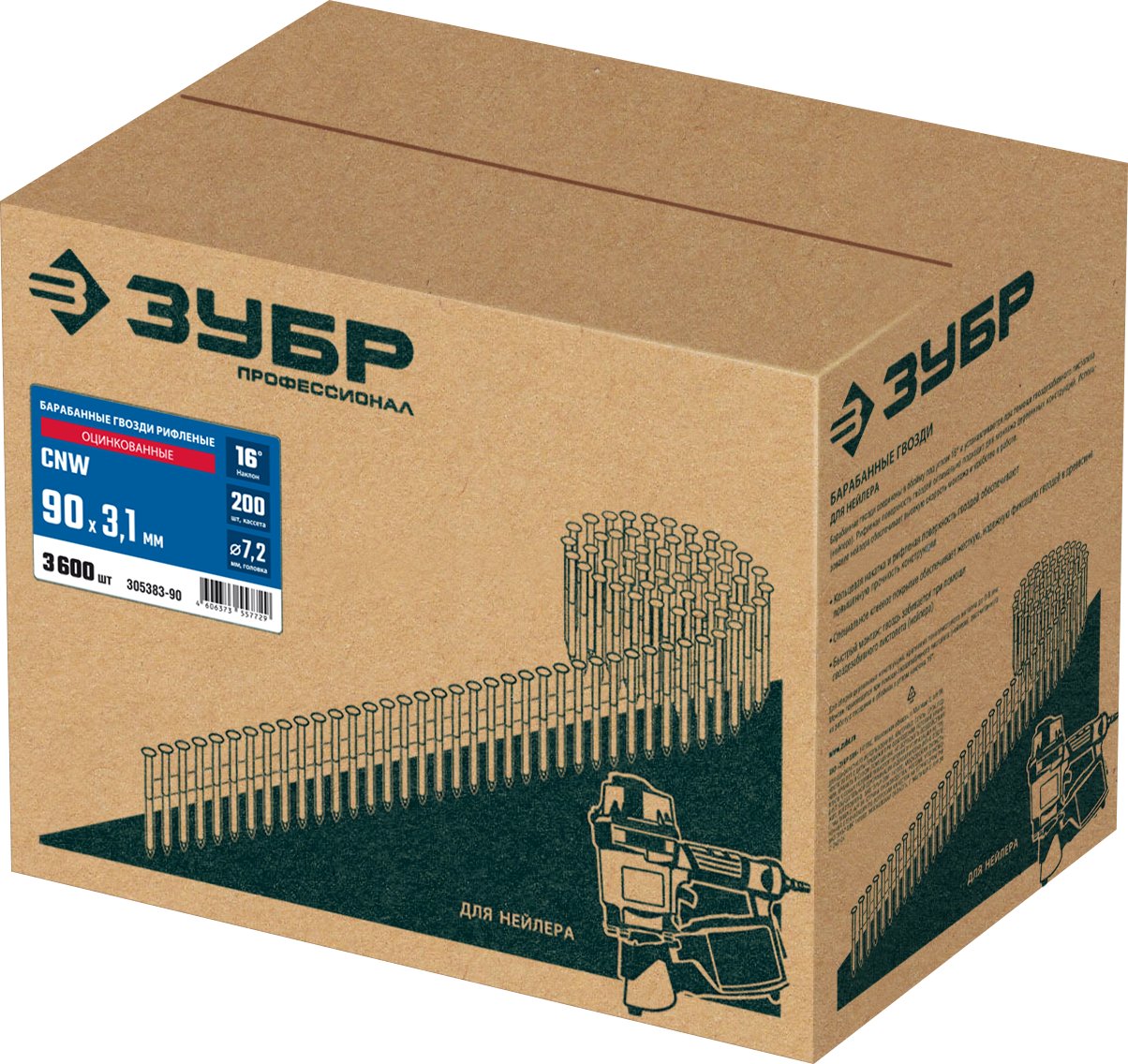 Для сборки деревянных конструкций, крепления тонколистового металла до 0.9 мм. В каркасном домостроении используются для сборки каркаса дома и установки черновых полов. Монтаж производится при помощи гвоздезабивного пистолета (нейлера) ЗУБР CNW-90 (арт. 31914), ЗУБР CNW-100 (арт. 31915) или аналогичного, рассчитанного на работу с барабанными гвоздями с углом наклона 16 град.