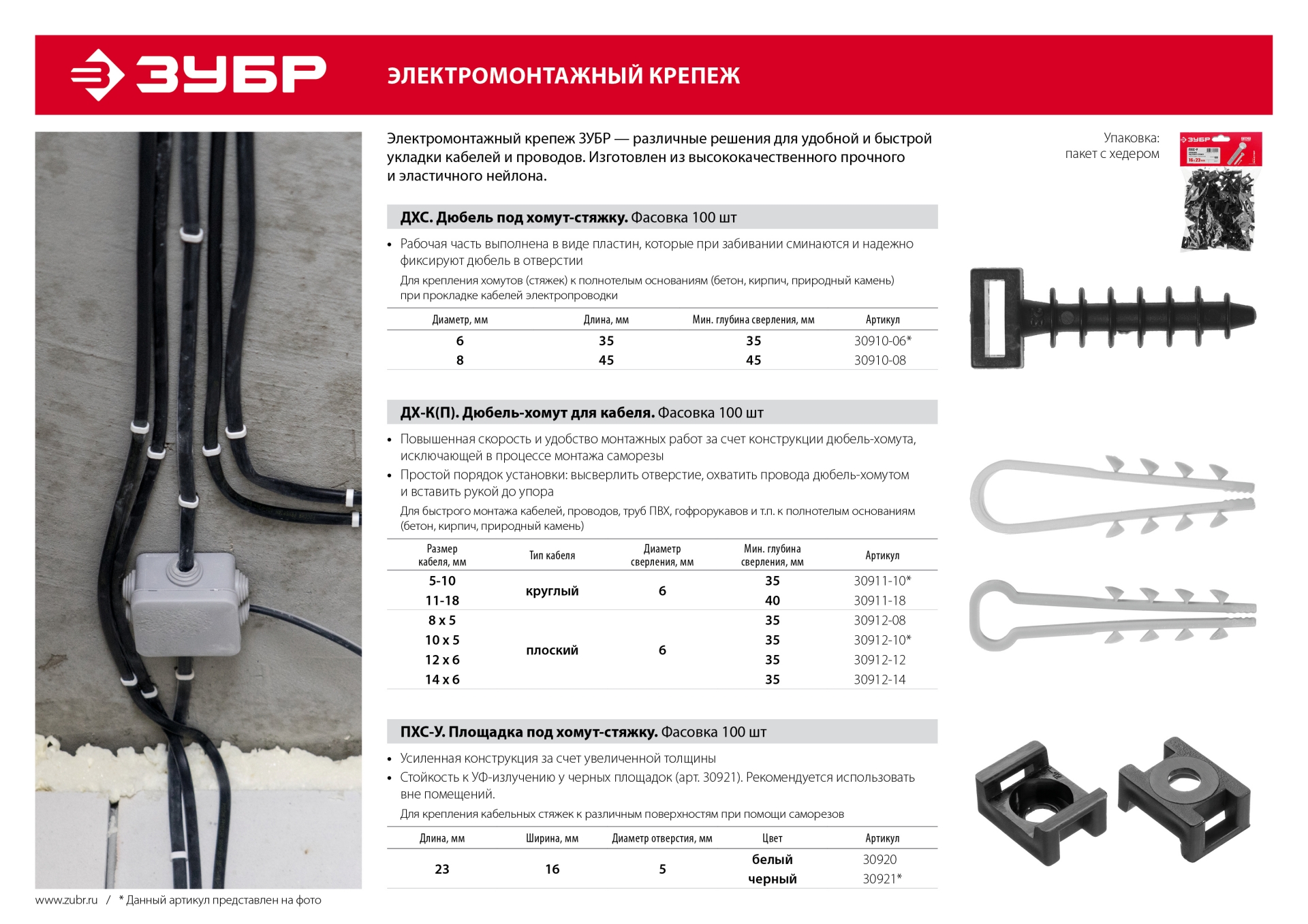Электромонтажный крепеж предназначен для стяжки кабелей и проводов в пучки, а также крепления электропроводки к различным поверхностям. Стяжки, клипсы, дюбель-хомуты и монтажные площадки легко, быстро и удобно монтировать как внутри, так и вне помещений. Дюбель-хомуты предназначены для крепления кабелей, проводов, металлорукавов или гофрорукавов к полнотелым основаниям (бетон, кирпич, природный камень). Изготовлены из высококачественного полипропилена.