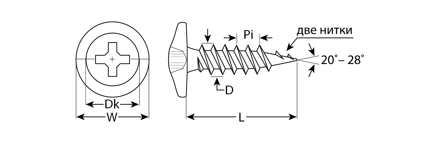 Саморезы с пресс-шайбой для листового металла изготовлены из стального прутка с высоким содержанием углерода. Контроль за геометрией самореза начинается с калибровки прутка и заканчивается тщательной проверкой размеров готового изделия. Нормативная твердость стали достигается термической обработкой. Поверхностная твердость 550-720HV, твердость в сердцевине 240-450HV. Саморезы легко вкручиваются обычным шуруповертом или отверткой с крестообразным шлицем PH2 (DIN). Предварительное сверление в скрепляемых материалах не требуется. Геометрические размеры: диаметр пресс-шайбы (W) - 10.5-11.0мм, диаметр головки (Dk) - 6.5-7.0мм, диаметр резьбы (D) - 4.1-4.3мм, шаг резьбы (Pi) - 3.38мм.