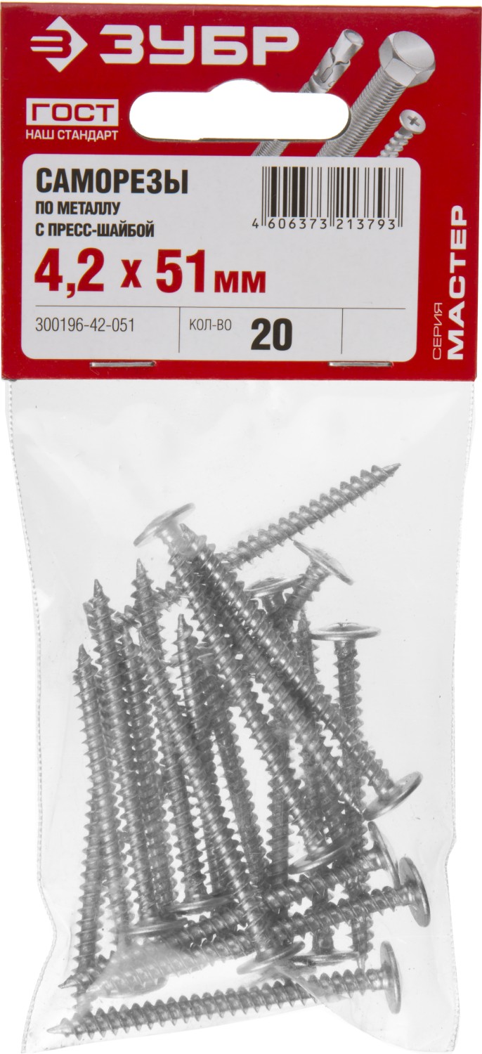 Саморезы с пресс-шайбой для листового металла изготовлены из стального прутка с высоким содержанием углерода. Контроль за геометрией самореза начинается с калибровки прутка и заканчивается тщательной проверкой размеров готового изделия. Нормативная твердость стали достигается термической обработкой. Поверхностная твердость 550-720HV, твердость в сердцевине 240-450HV. Саморезы легко вкручиваются обычным шуруповертом или отверткой с крестообразным шлицем PH2 (DIN). Предварительное сверление в скрепляемых материалах не требуется. Геометрические размеры: диаметр пресс-шайбы (W) - 10.5-11.0мм, диаметр головки (Dk) - 6.5-7.0мм, диаметр резьбы (D) - 4.1-4.3мм, шаг резьбы (Pi) - 3.38мм.