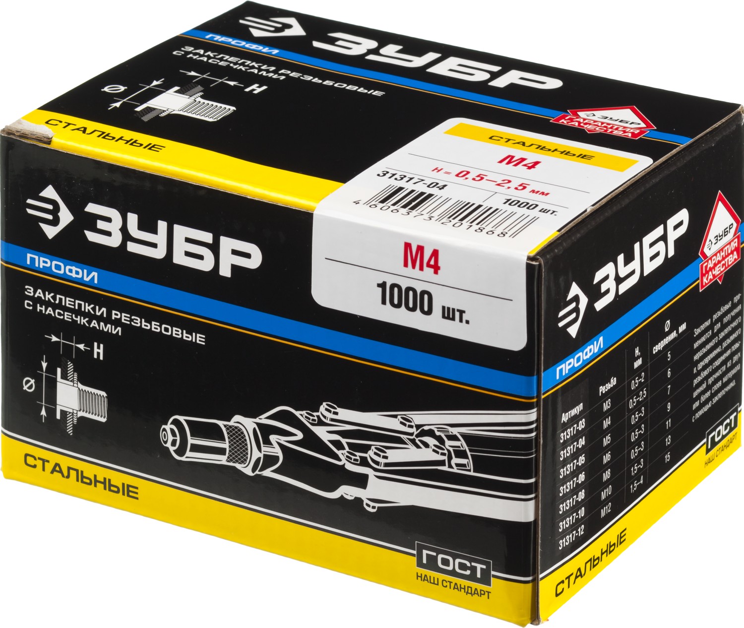 —ЗУБР М4, станд. бортик, 1000 шт, стальные резьбовые заклепки с насечками, Профессионал (31317-04)