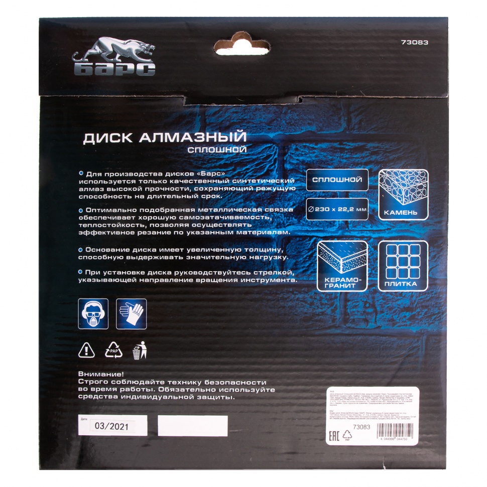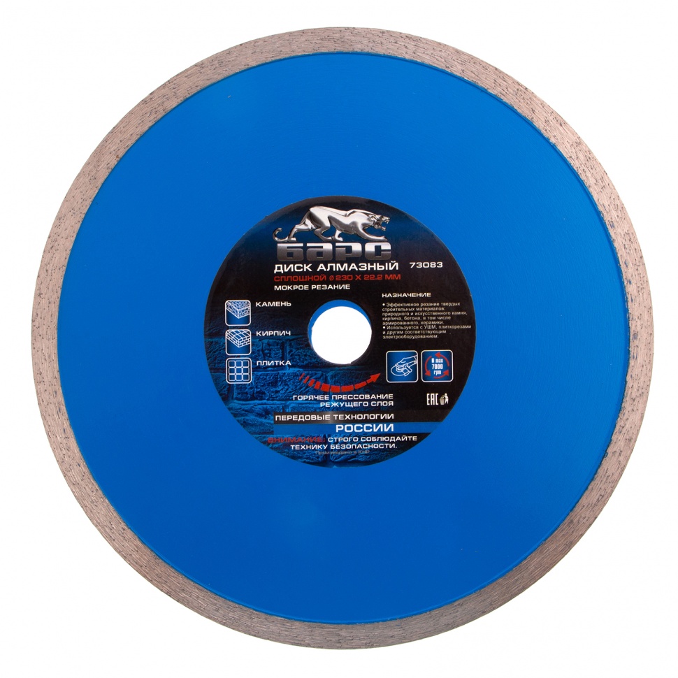 Сплошной алмазный диск Барс ф230х22,2 мм 73083 применяется совместно с УШМ или плиткорезами для мокрого резания твердых материалов: гранит и керамогранит, кафель, плитка, мрамор, натуральный и искусственный камень. Сплошная форма диска позволяет добиться ровного среза без трещин и сколов. Водяное охлаждение предотвращает перегрев диска, а также повышает его ресурс.ПреимуществаРежущая часть шириной 10 мм с высокой концентрацией алмазных зерен обеспечивает эффективную быструю работу и возможность профессионального применения.Рабочая часть включает в себя только высококачественные синтетические алмазы повышенной прочности, поэтому диск долго сохраняет режущие свойства.Оптимально сбалансированная металлическая связка позволяет проводить рез различных материалов.При изготовлении диска используется технология горячего прессования, поэтому он обладает высоким ресурсом и обеспечивает стабильный рез.Стальной корпус увеличенной толщины позволяет диску выдерживать высокие нагрузки без риска деформации.