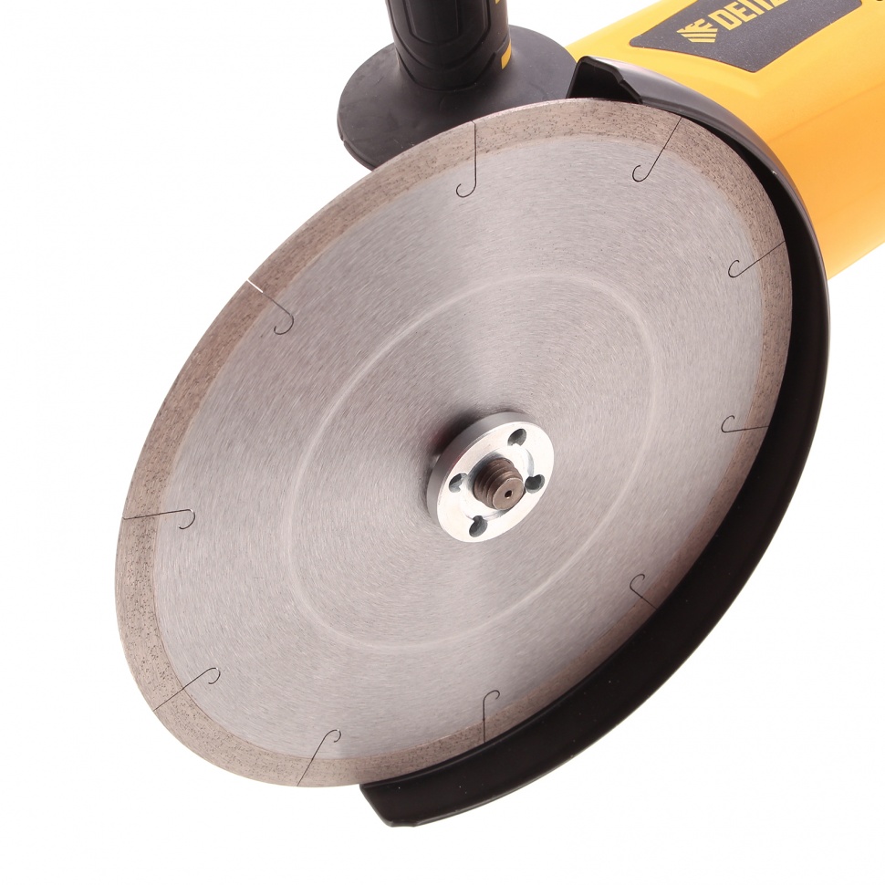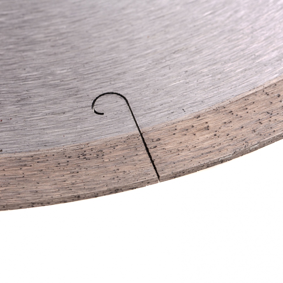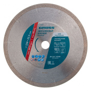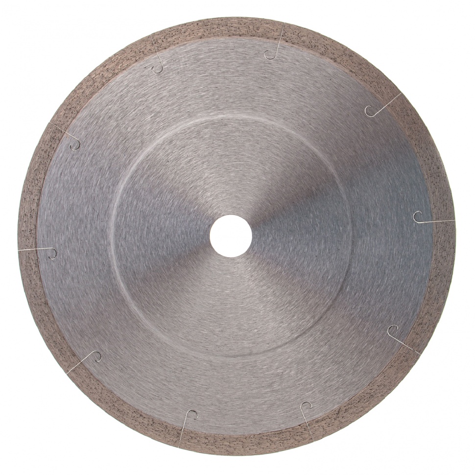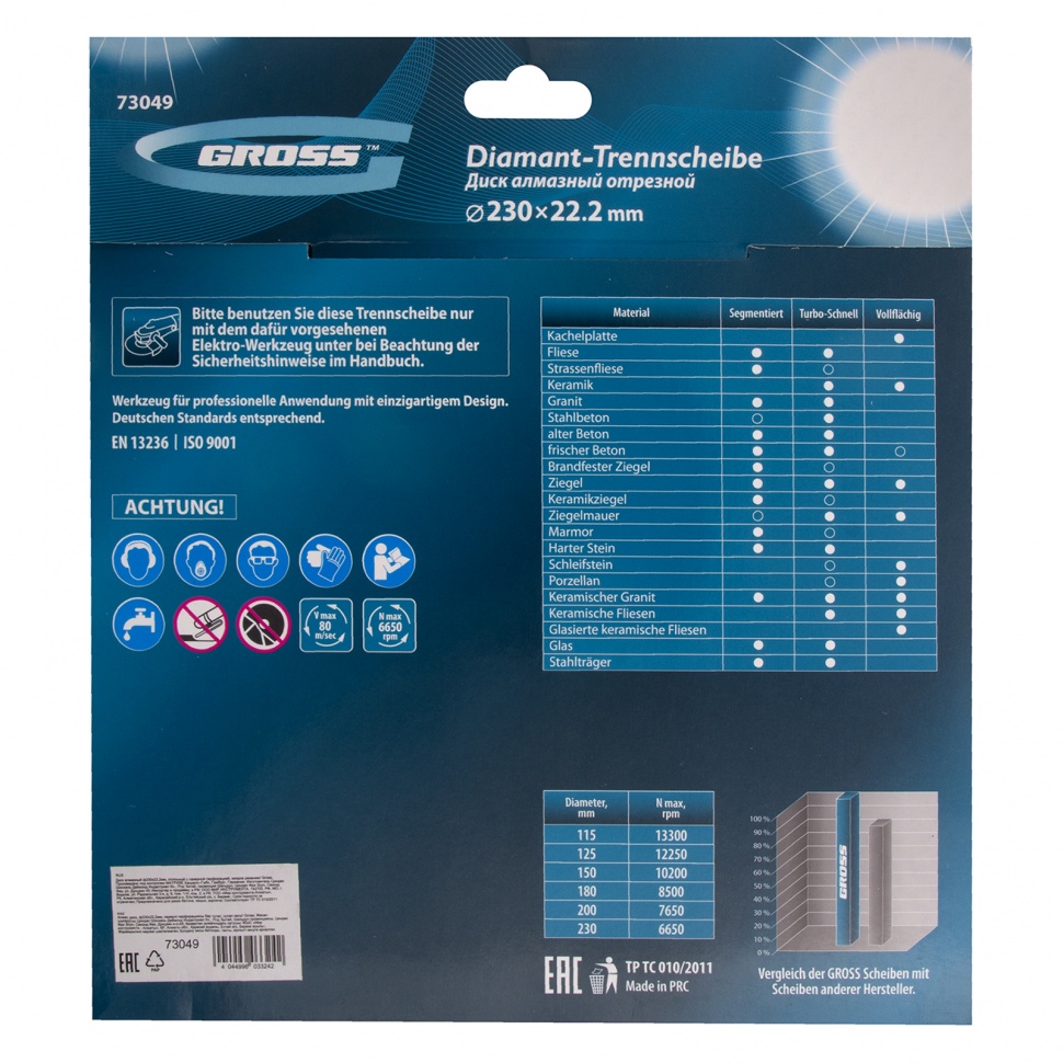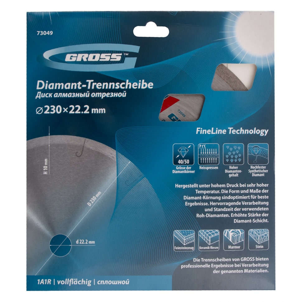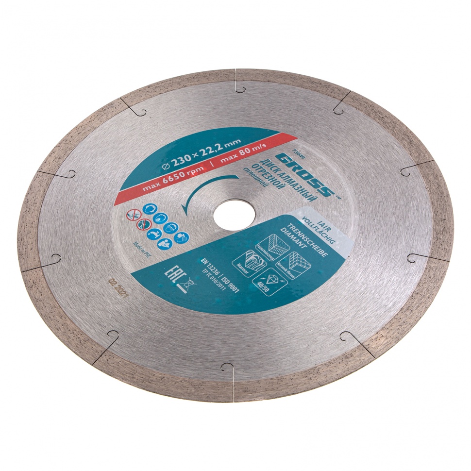 Сплошной алмазный диск Gross ф230х22,2 мм 73049 с лазерной перфорацией для мокрого резания используется в качестве расходника на УШМ или плиткорезах с посадочным размером 22,2 мм. Оптимальное соотношение серебра, кобальта и других качественных компонентов в металлической связке позволяет работать с гранитом, керамикой, керамогранитом, мрамором, натуральным и искусственным камнем. Метод мокрого шлифования подразумевает использование водяного охлаждения, что способствует снижению перегрева и эффективному отводу пыли.ПреимуществаДиск имеет большой ресурс, надежность и может использоваться профессионально, т.к. изготовлен по технологии горячего прессования.За счет сплошного типа диска обеспечивается качественный ровный срез без риска образования сколов.Высокая концентрация и крупный размер алмазов 40-50 мкм повышают скорость реза.Лазерная перфорация усиливает охлаждение диска, а значит, он легко выдерживает интенсивное использование.Режущая часть шириной 10 мм гарантирует стабильно высокую производительность.Стальной корпус имеет в составе марганец, который способствует усилению пружинных свойств и защите от искривления формы во время шлифования.Бесцветный лак предотвращает образование коррозии на корпусе диска.