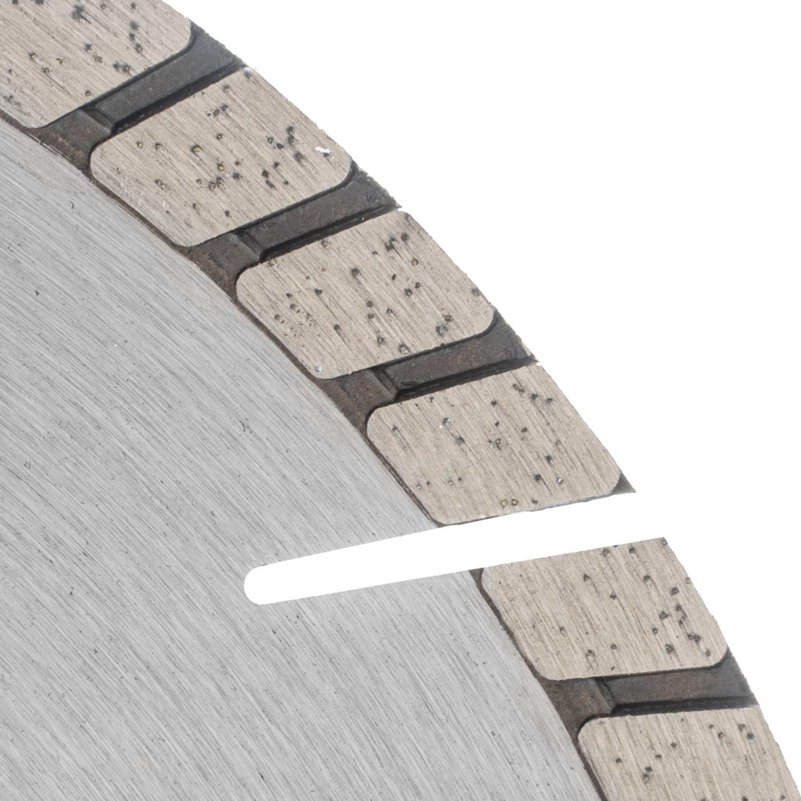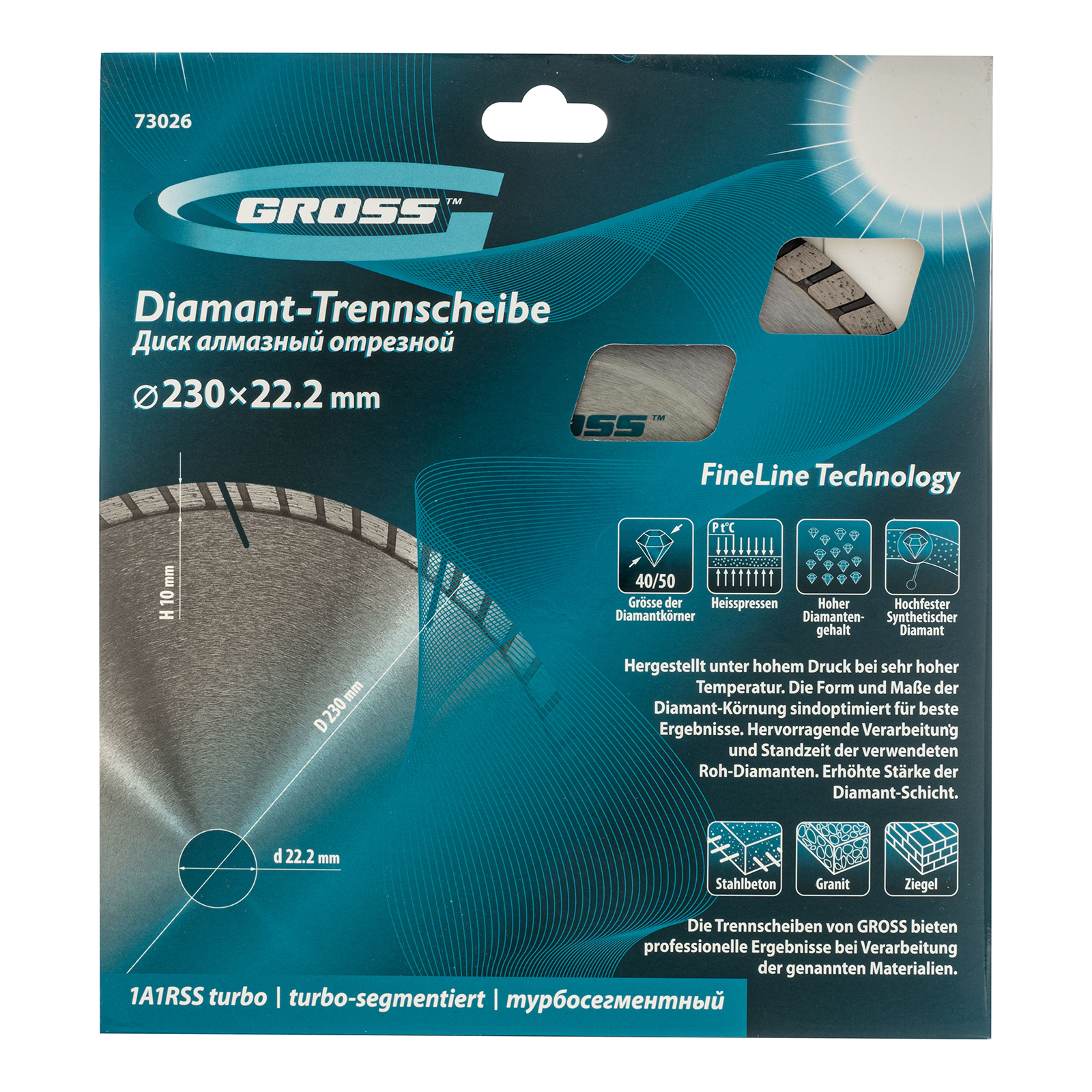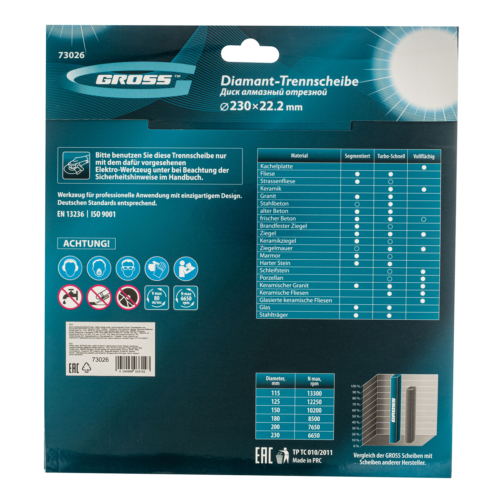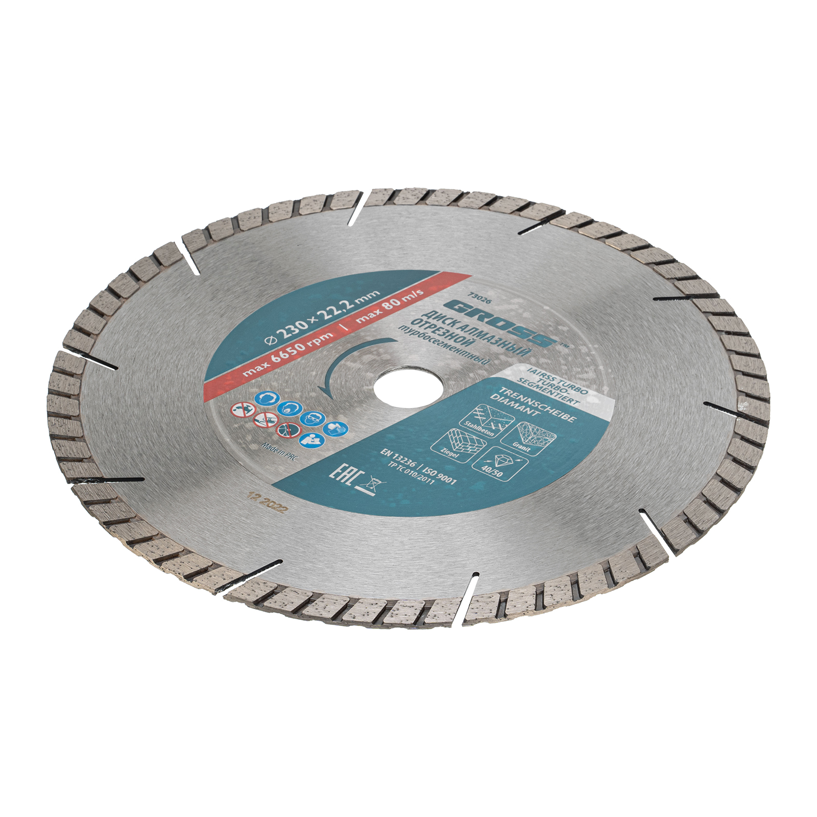 Алмазный турбо-сегментный диск Gross ф230х22,2 мм 73026 для сухого резания устанавливается на УШМ в качестве оснастки для проведения отрезных работ. Диск с турбированной рабочей частью универсален по своему применению и его можно использовать для резки камня, гранита и кирпича, свежего бетона, а также слабоармированного железобетона. Он пригодится для интенсивных работ с профессиональным инструментом.ПреимуществаТурбо-сегментная форма - резание материалов происходит быстро, водяное охлаждение не требуется, в т.ч. армированного бетона.Надежность - диск выполнен методом горячего прессования.Износостойкость и скорость реза до 6650 об/мин - режущая часть выполнена из крупных алмазов размером 40-50 мкм.Рабочая часть 10 мм с высокой концентрацией алмазных зерен - диск идеально подходит для выполнения больших объемов работ.Оптимально подобранная металлическая связка - серебро, кобальт и другие составляющие значительно повышают ресурс диска, позволяют резать материалы разной плотности без риска перегрева.Прочный корпус с защитно-декоративным покрытием - сталь 65 Mn и бесцветный лак обеспечивают высокие эксплуатационные качества инструмента и коррозионную стойкость.