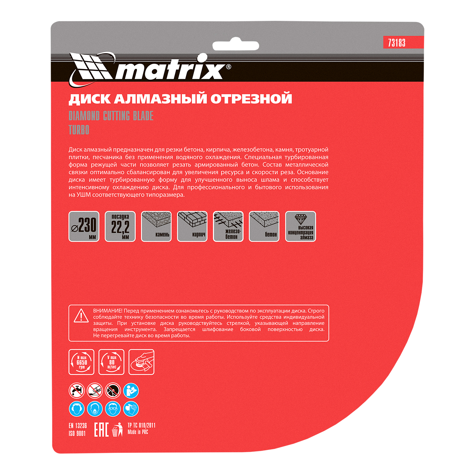 Отрезной алмазный диск Matrix Turbo 73183, 230 х 22,2 мм, сухая резка, является сменной оснасткой для углошлифовальных машин (УШМ). Он используется для ремонта и мелкого строительства, а также при решении бытовых задач. Диск предназначен для работ по бетону, в том числе свежему и среднеармированному, камню или кирпичу.ПреимуществаТурбированная рабочая часть обеспечивает интенсивное охлаждение и отвод пыли, повышая производительность диска.Диск сделан по технологии холодного прессования, а ширина рабочей части составляет 7 мм - этого достаточно для полноценного бытового применения.Высокая концентрация алмазных зерен в сочетании с оптимально подобранной связкой обеспечивает эффективную работу даже по железобетону.Водяное охлаждение не требуется, поэтому диск можно использовать с УШМ без подачи воды.